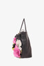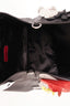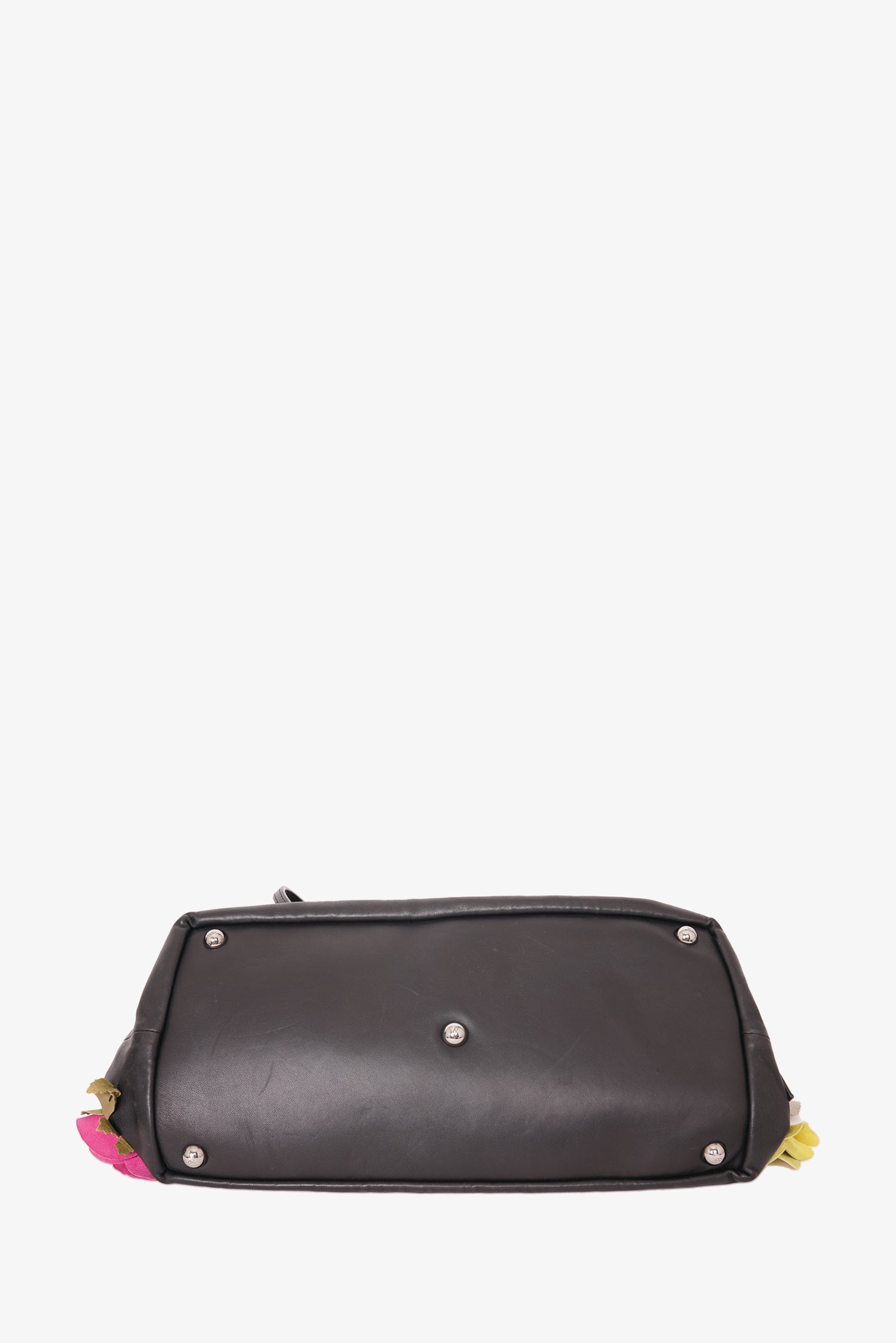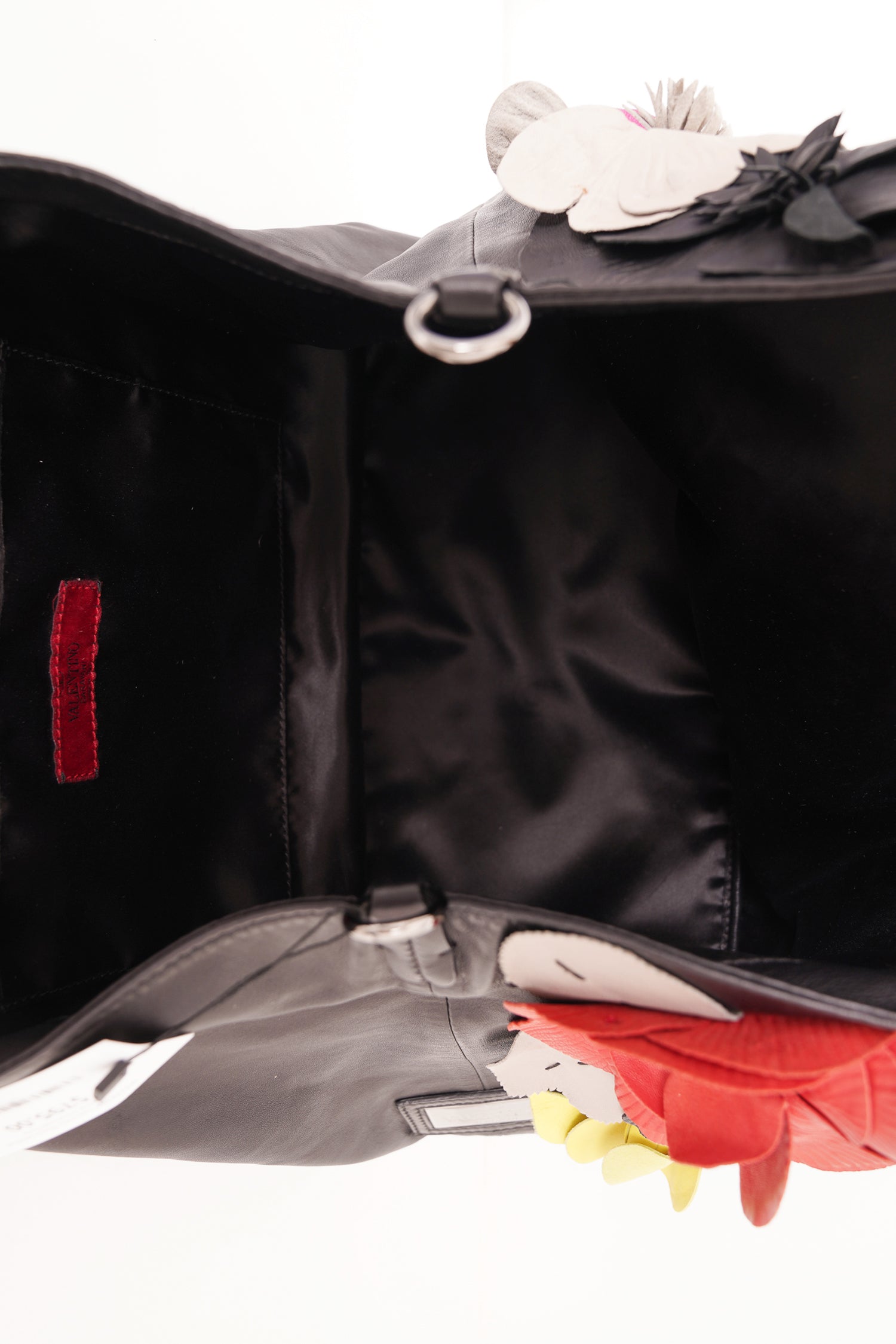 Valentino Black Leather Floral Applique Tote. Twin handles. Open interior with magnetic closure. Interior slip pocket. Removable strap. Silver-toned hardware. Tonal stitching.