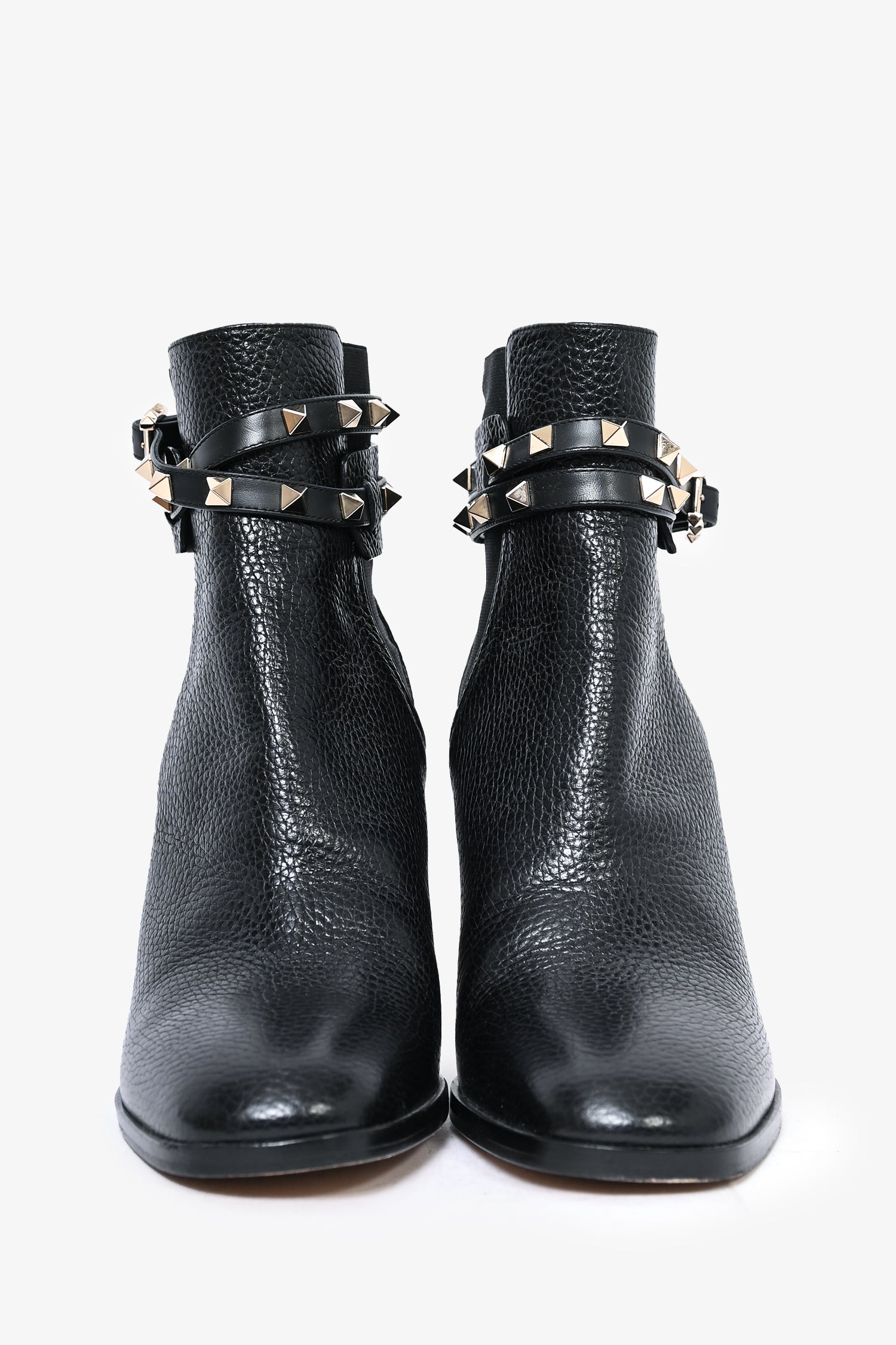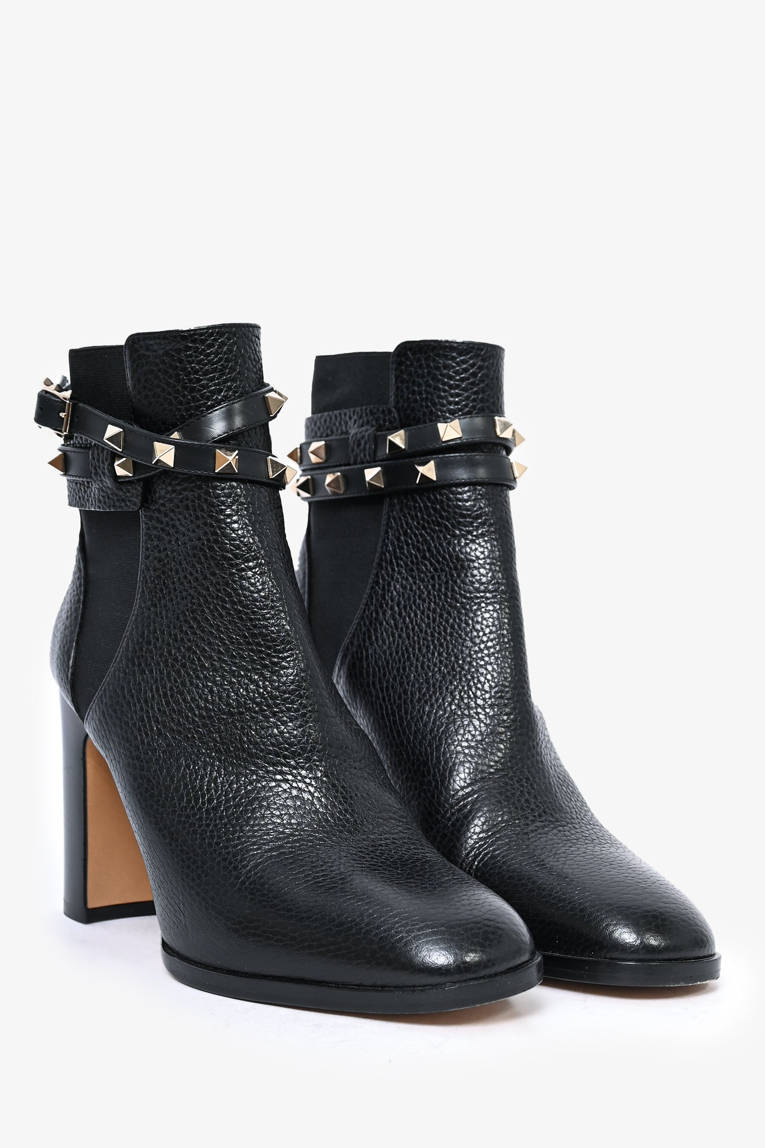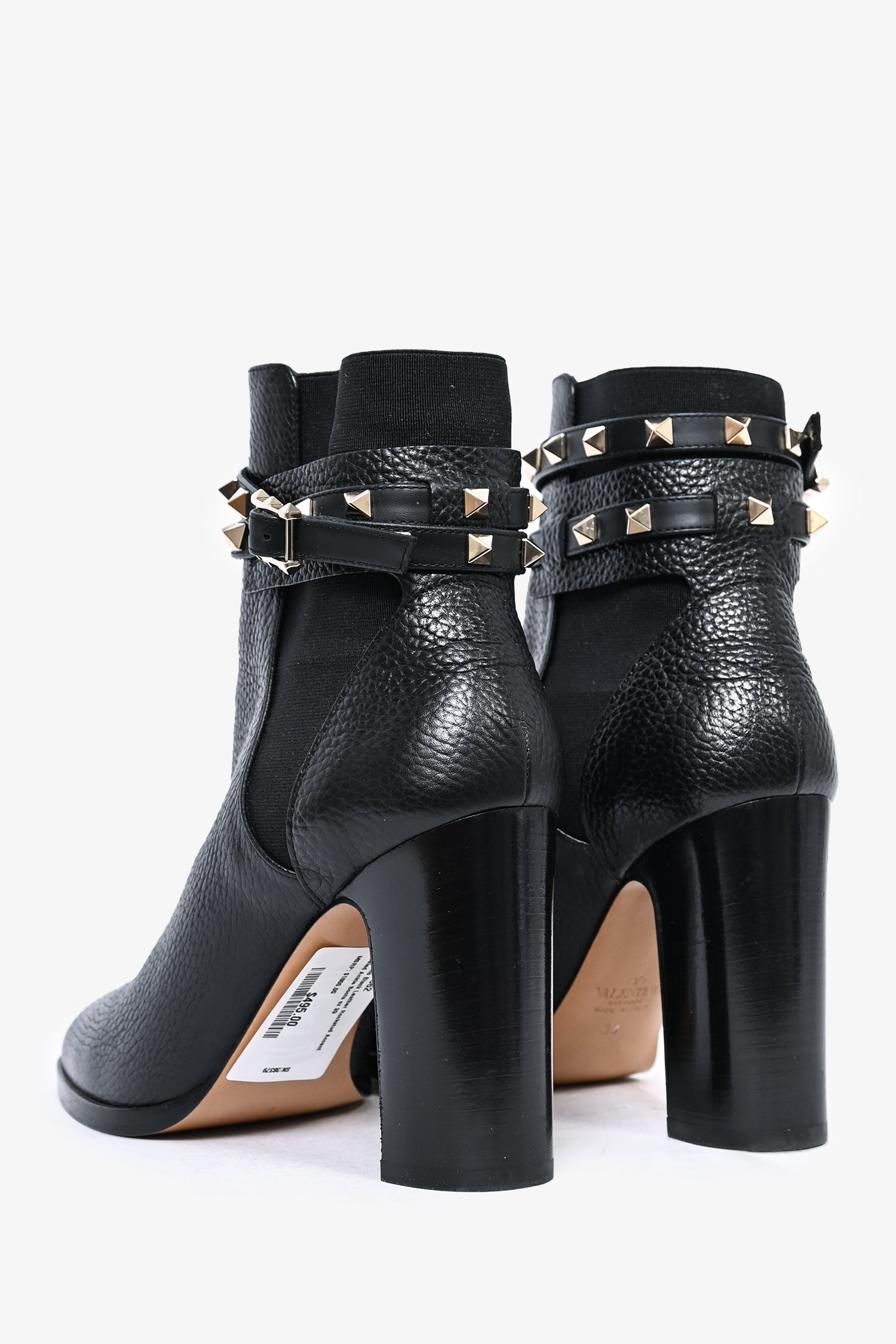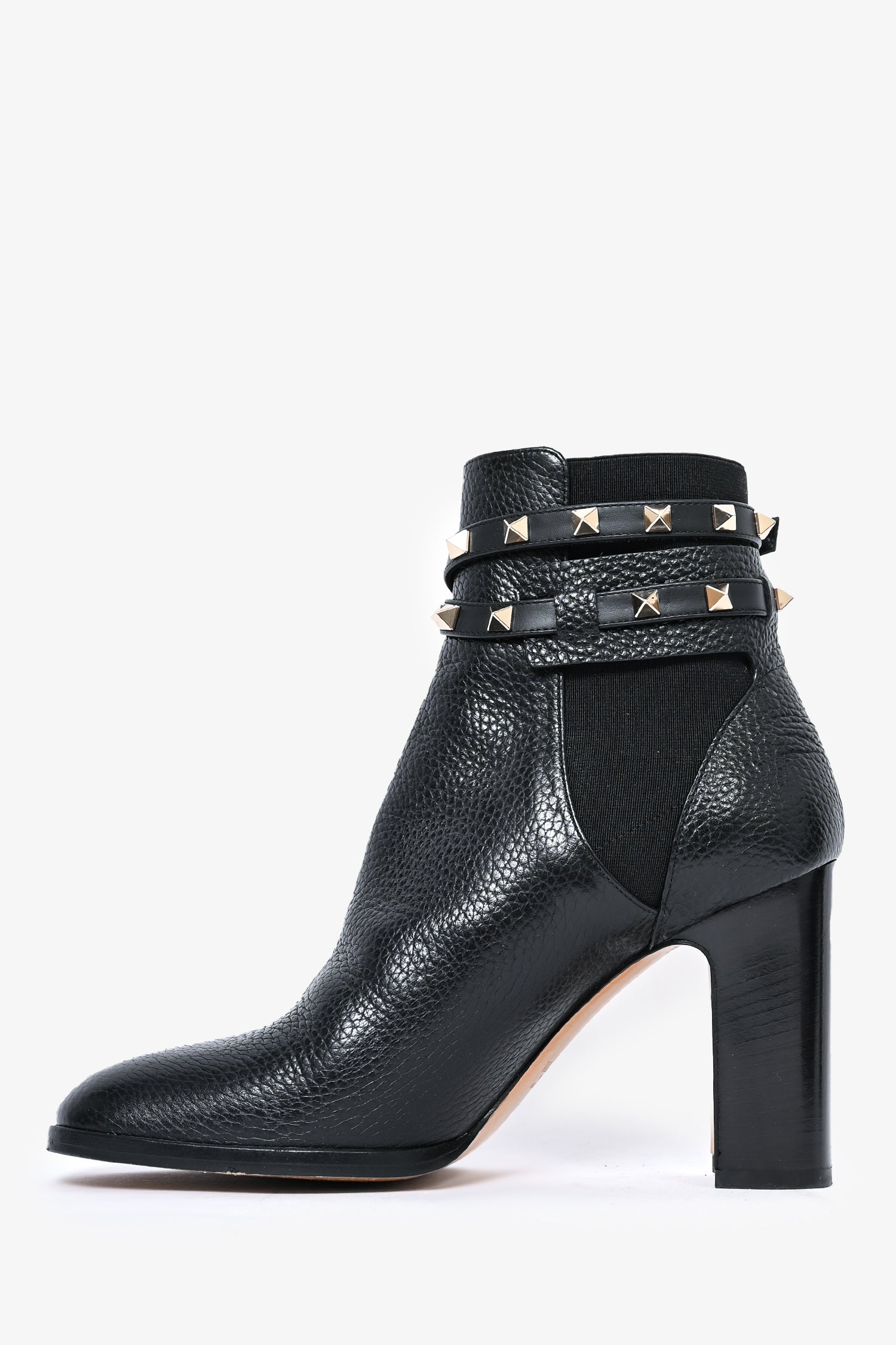 Refresh availabilityValentino Black Leather Rockstud Accent Heeled Ankle Boots. Slip on. Almond toe. Gold-tone hardware.