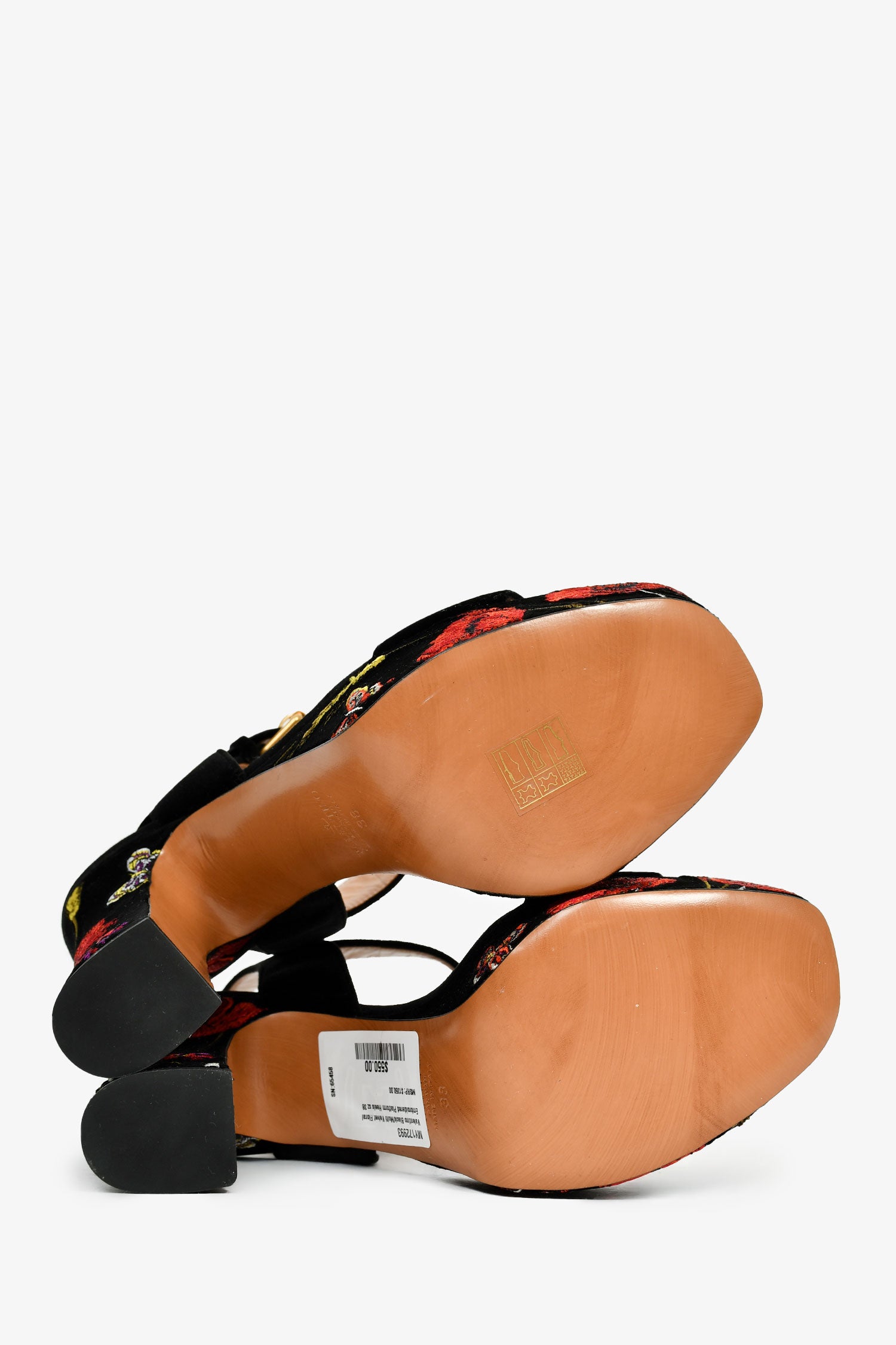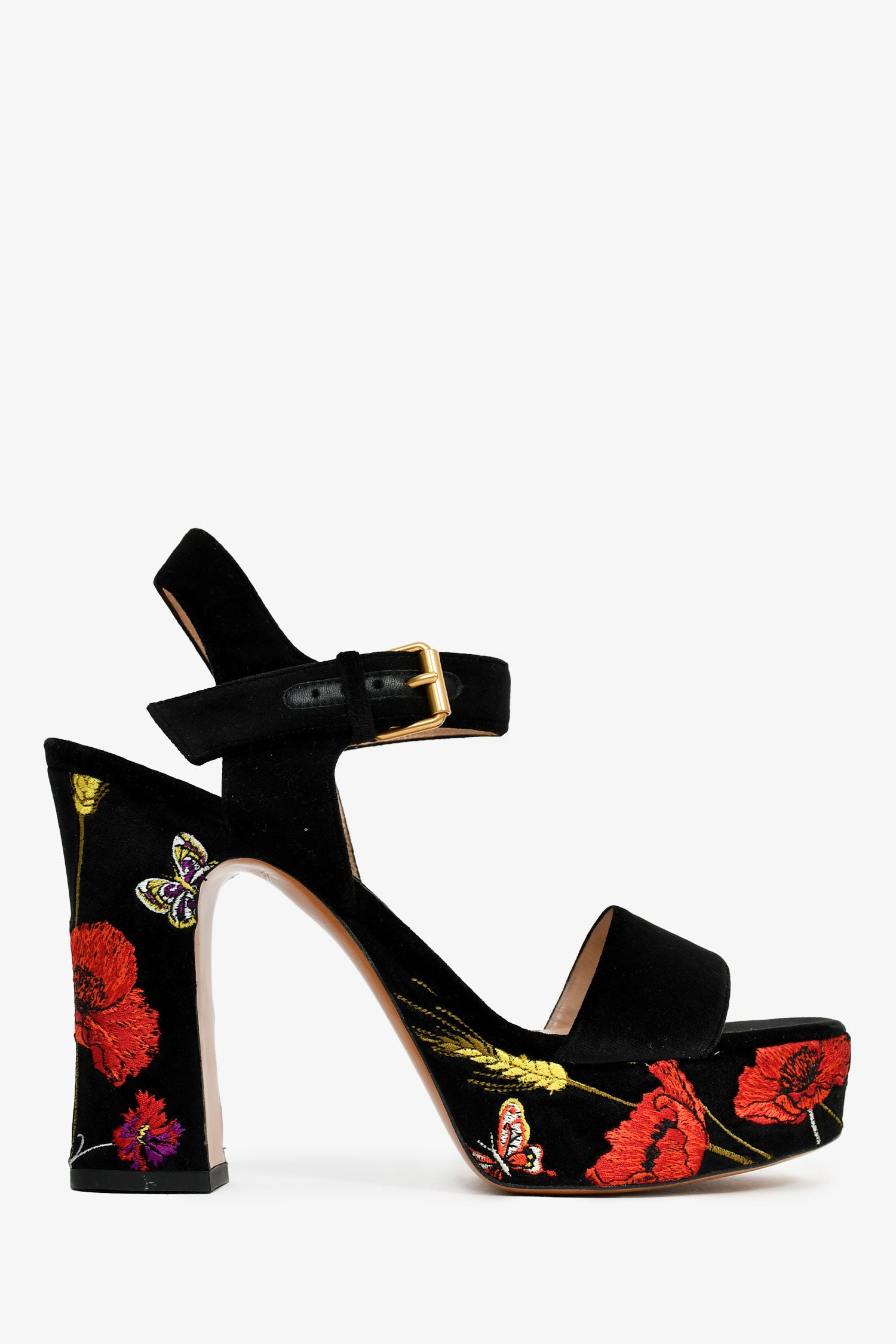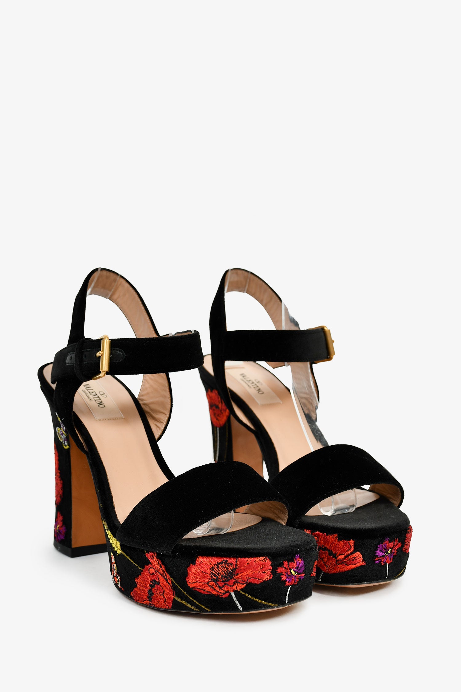 Refresh availabilityValentino Black/Multi Velvet Floral Embroidered Platform Heels. Open square toe. Ankle strap with buckle closure. Gold-tone hardware. Tonal stitching.