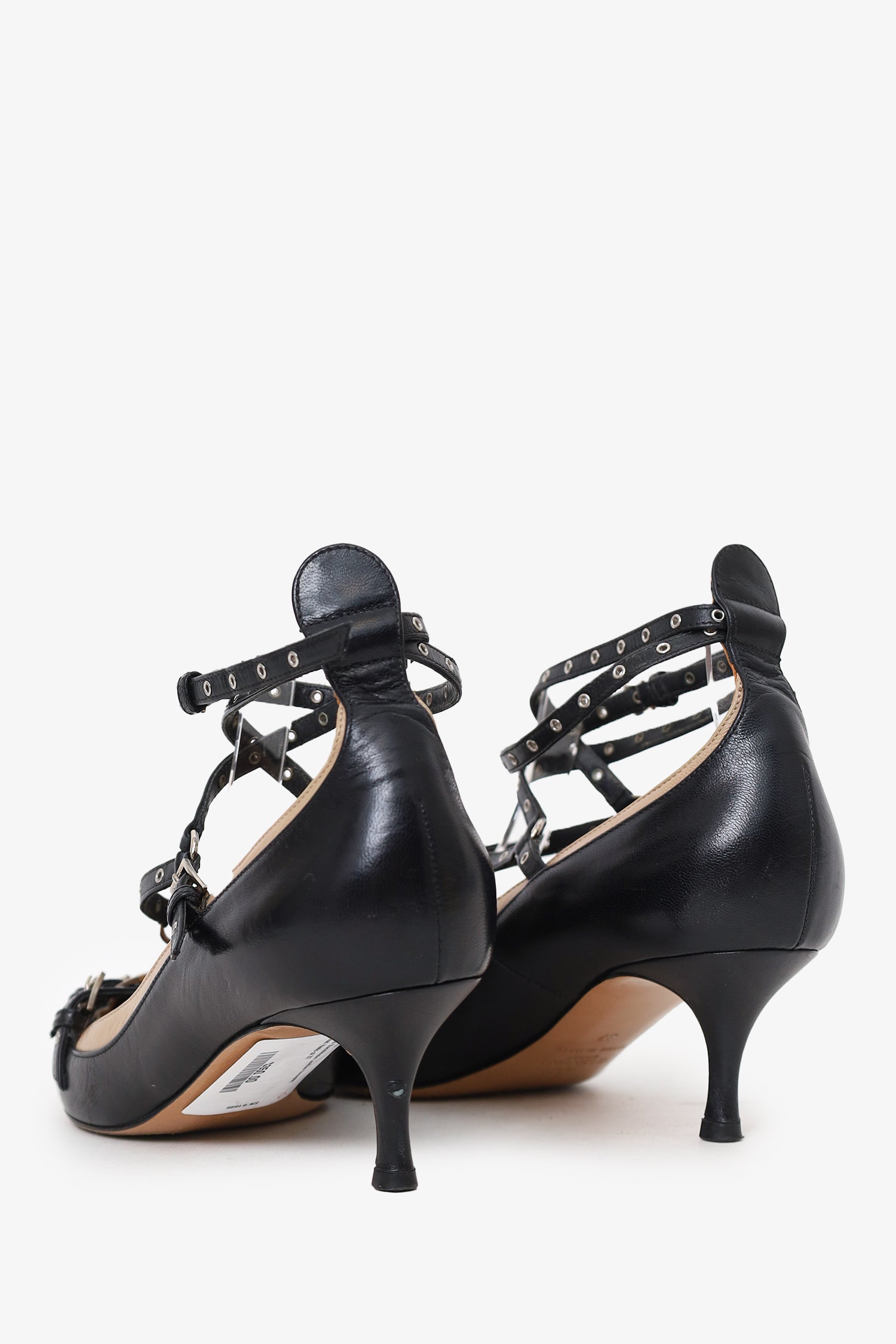 Refresh availabilityValentino Black/Nude Leather Strappy Pointed Heels. Slip-on. Pointed toe. Front straps with adjustable pull-through closure. Silver-tone hardware. Tonal stitching.