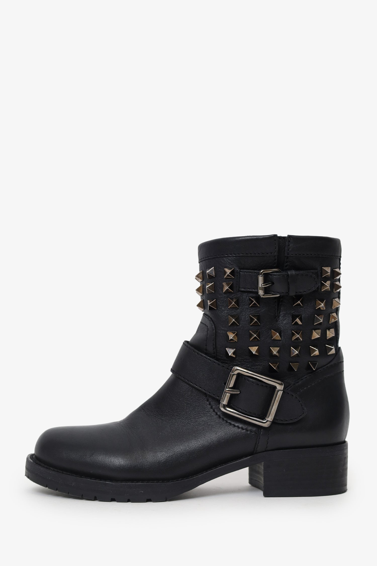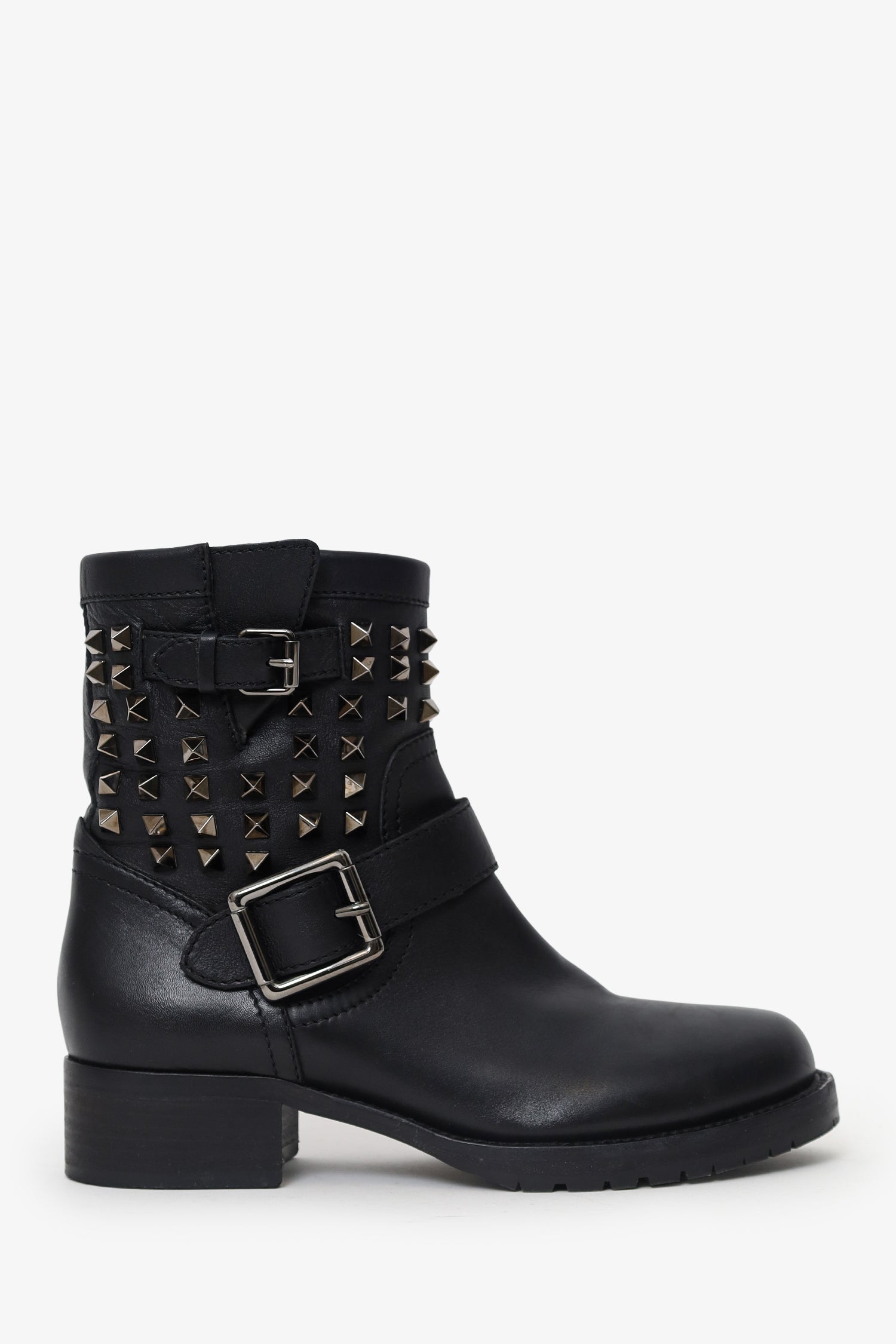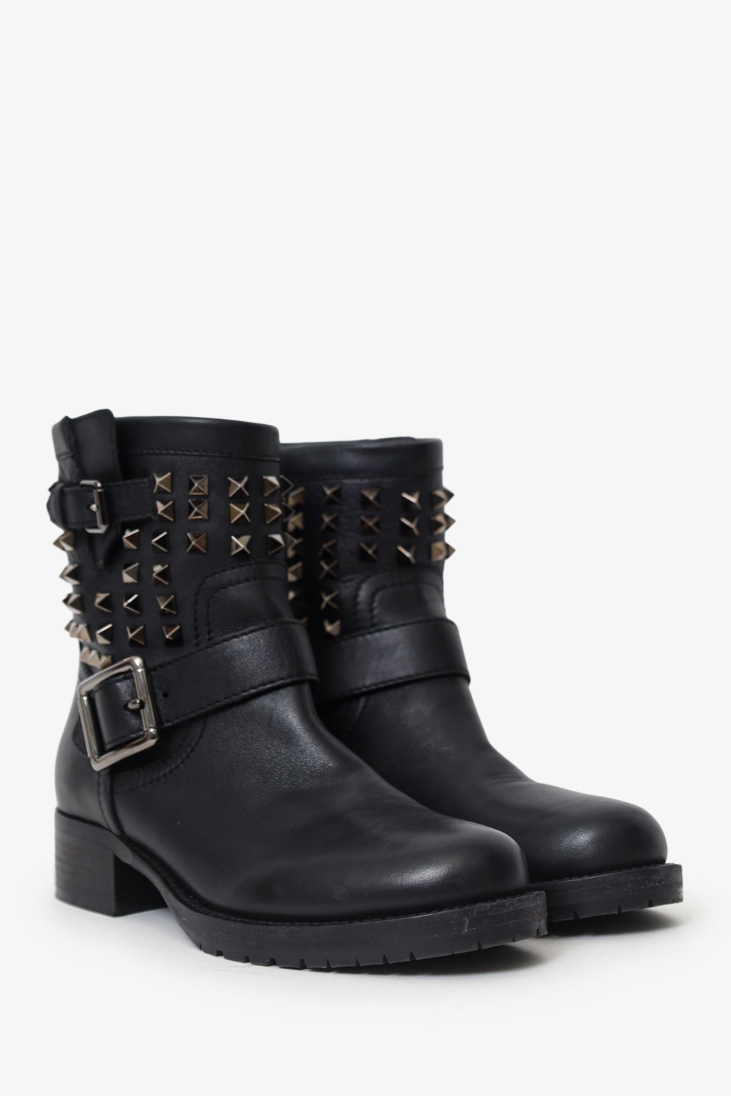 Refresh availabilityValentino Black RockStud Moto Boots. Pull on. Round toe. Stud hardware along exterior. Side buckle detail. Silver-tone hardware. Tonal stitching.