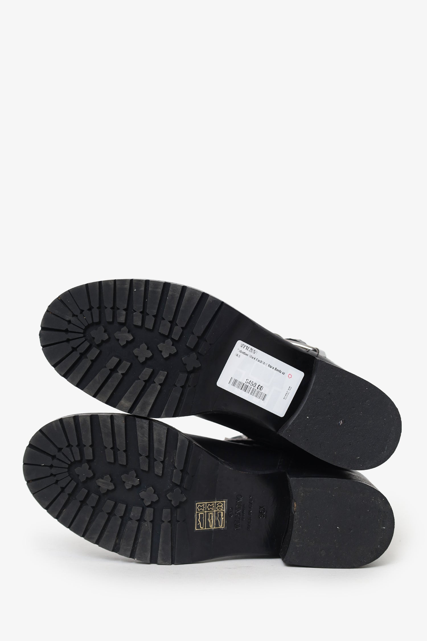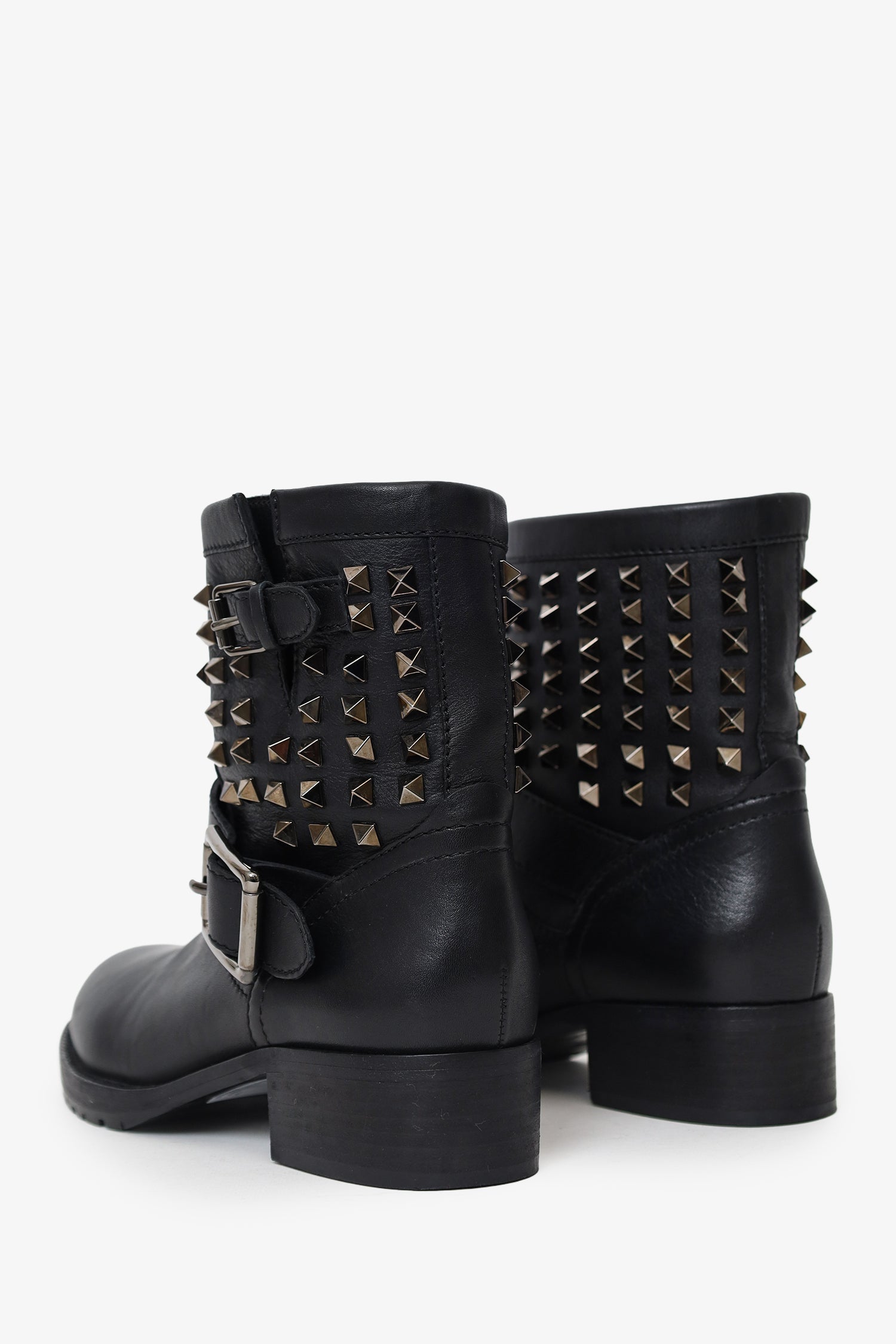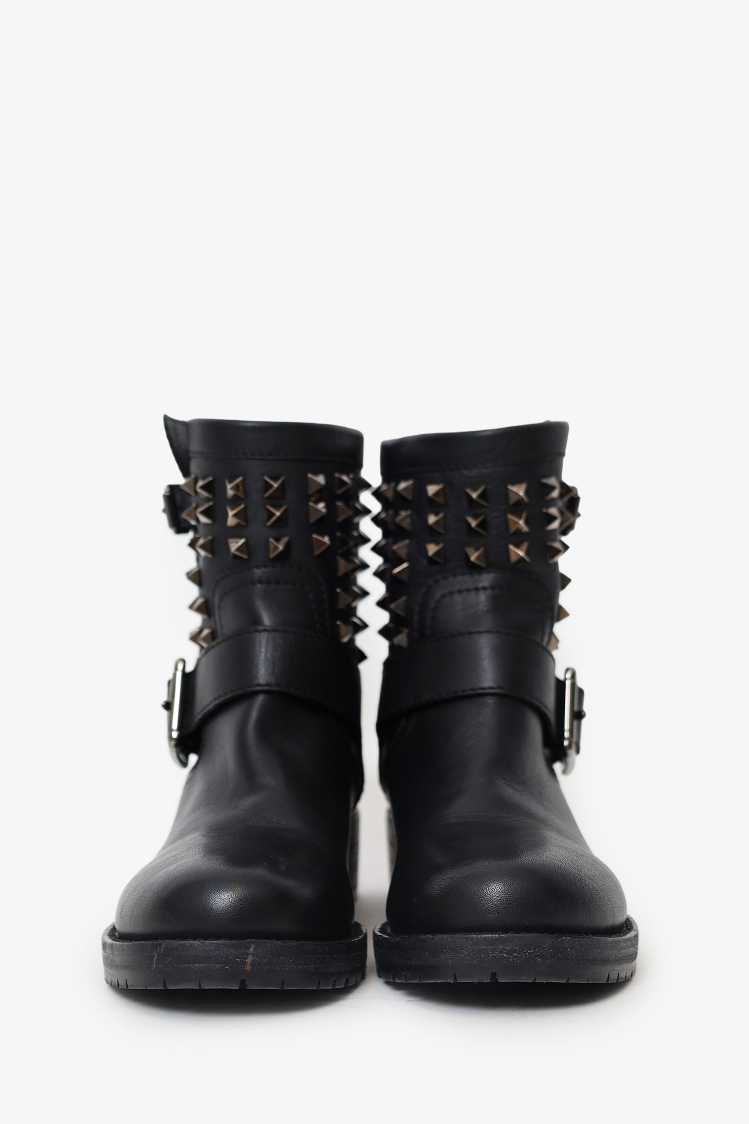 Refresh availabilityValentino Black RockStud Moto Boots. Pull on. Round toe. Stud hardware along exterior. Side buckle detail. Silver-tone hardware. Tonal stitching.