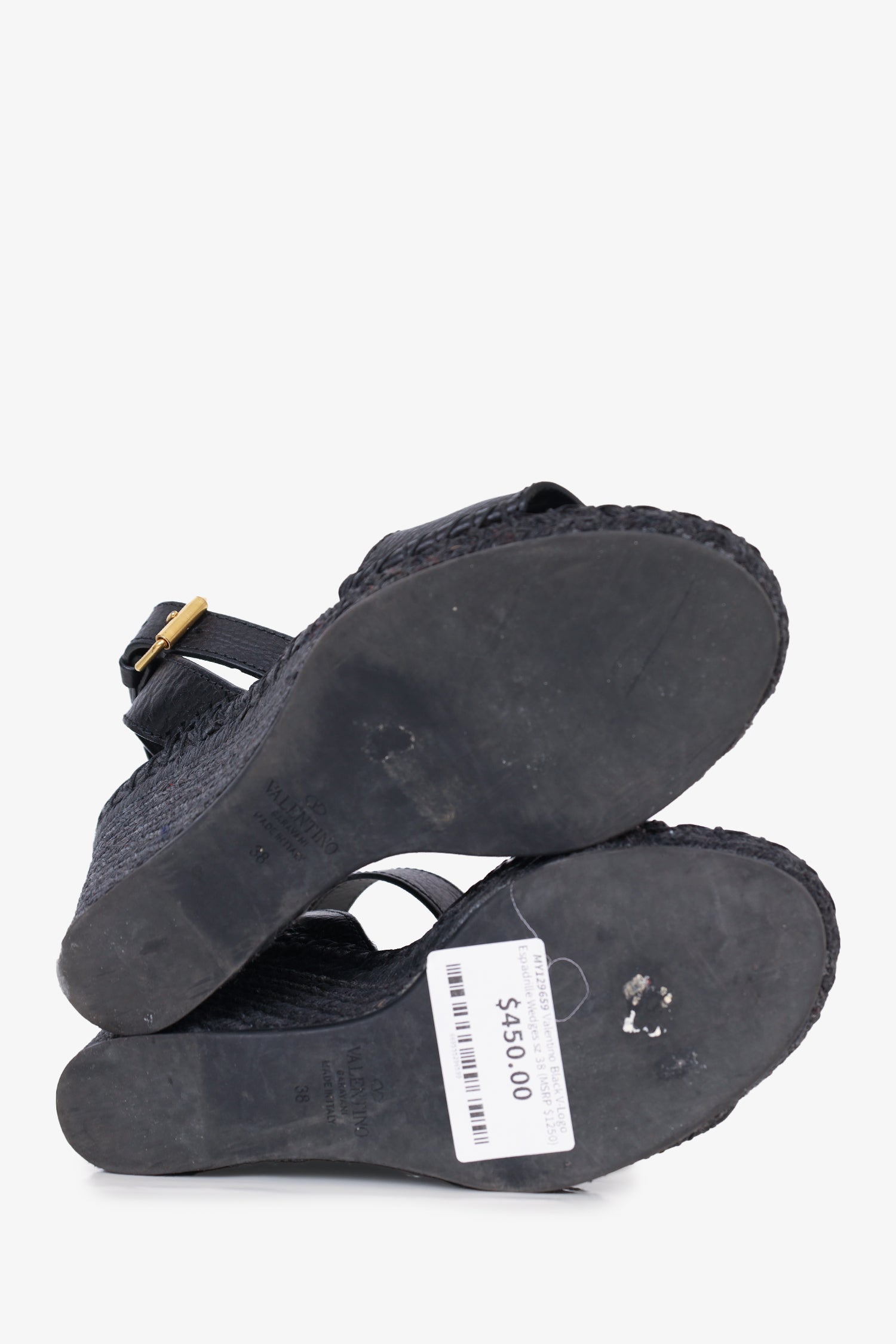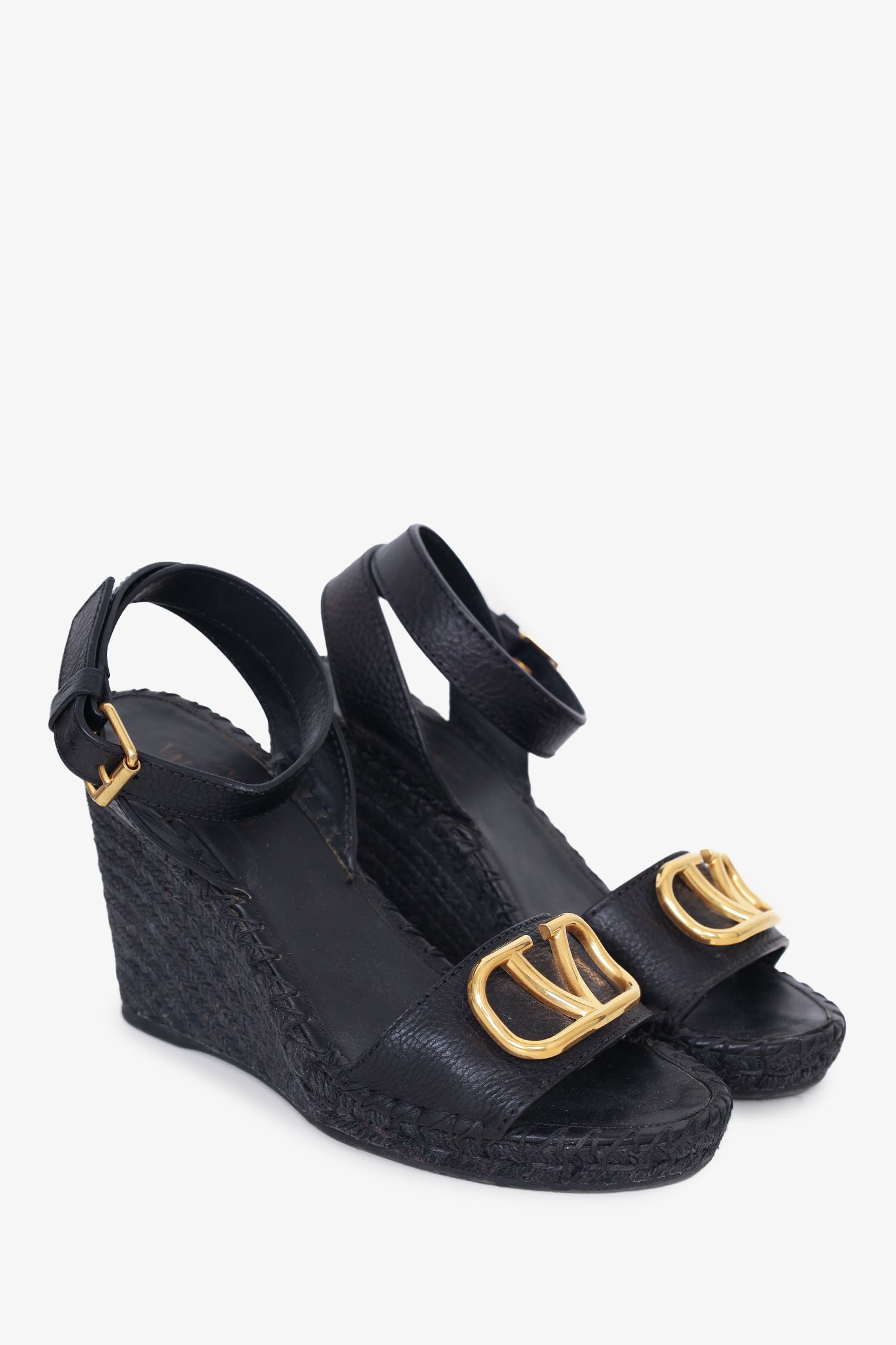 Refresh availabilityGValentino Black V-Logo Espadrille Wedges . Open toe. Ankle strap with adjustable buckle closure. Gold-tone hardware. Tonal stitching.