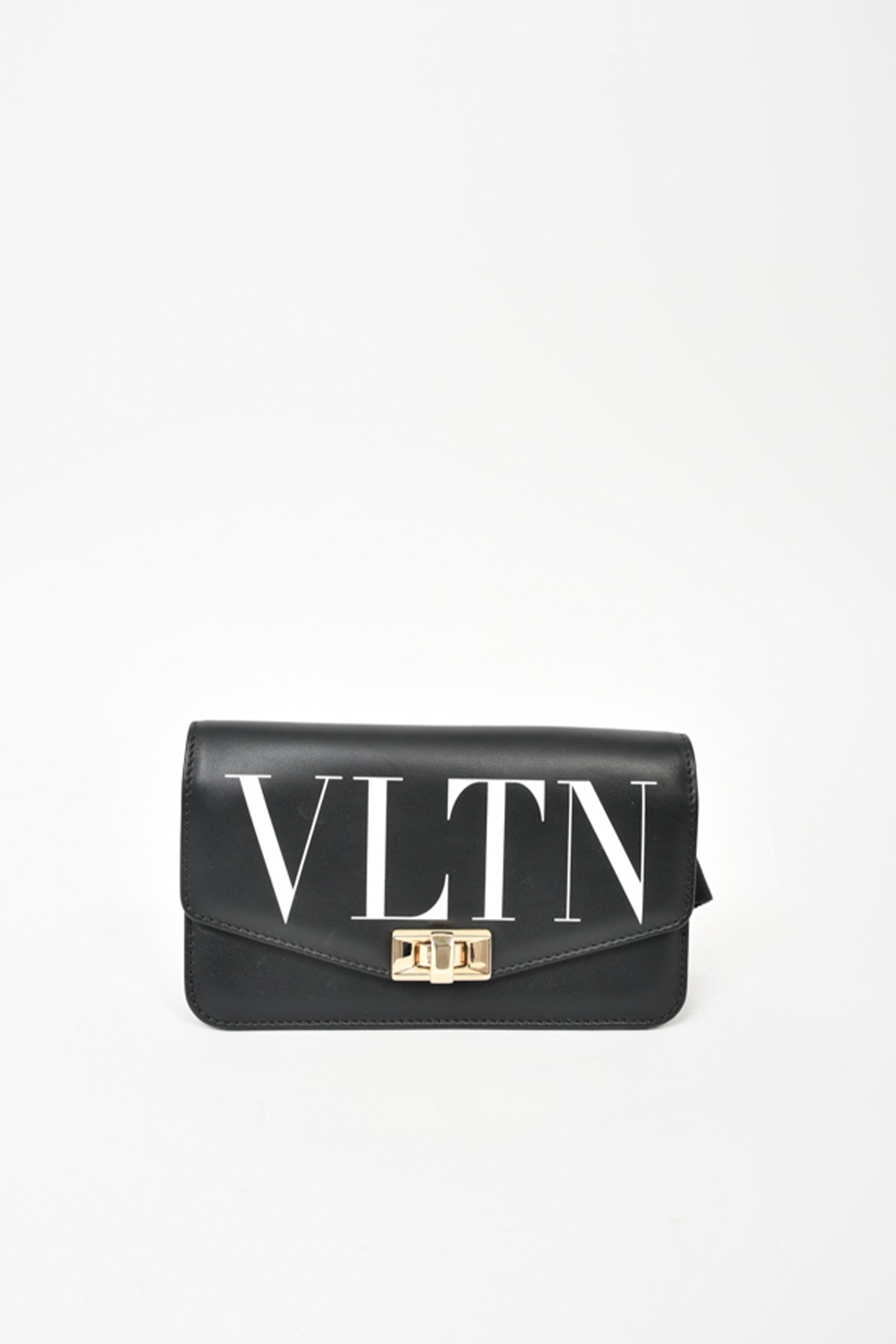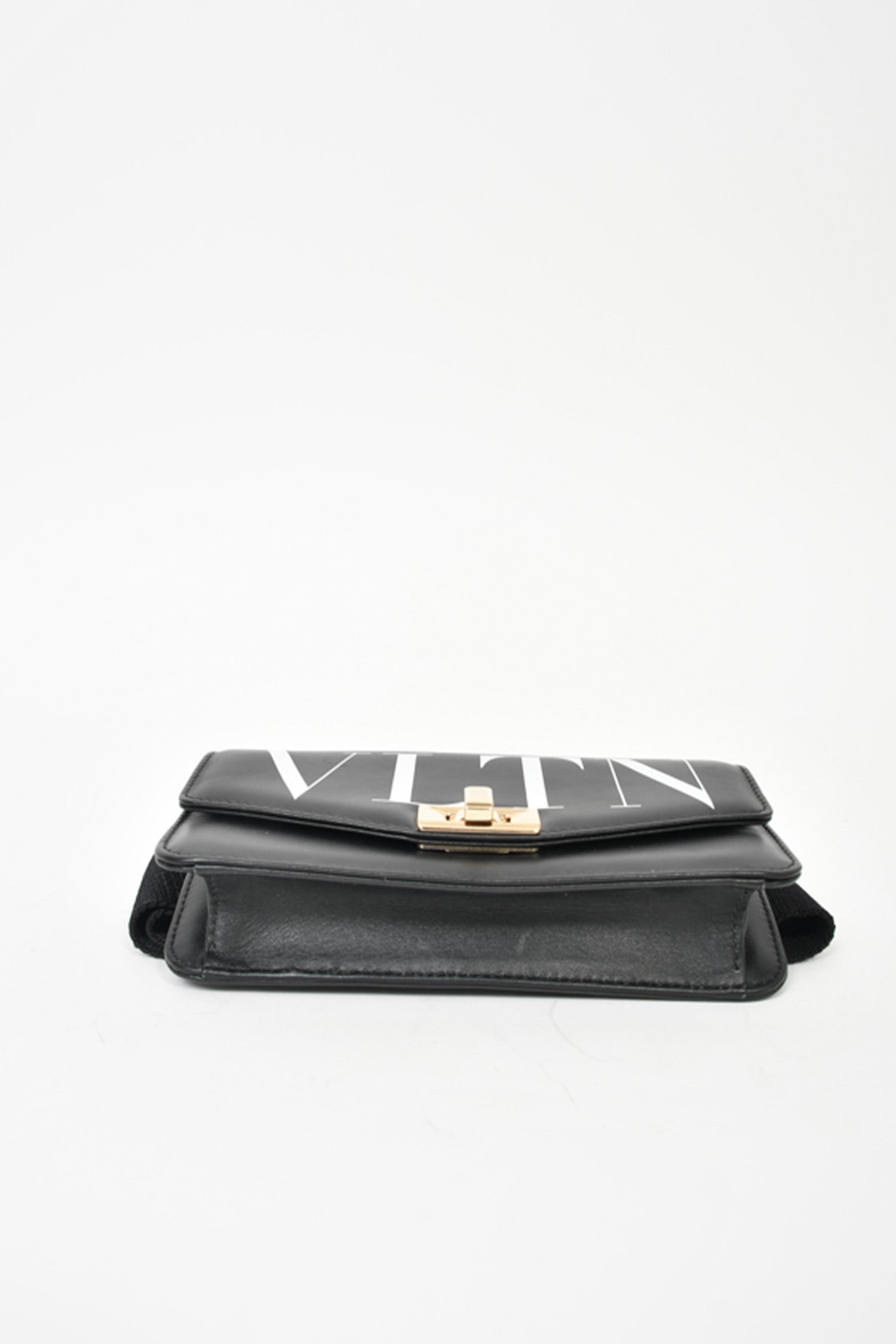 Refresh availabilityValentino Black VLTN Belt Bag/Crossbody. Gold-tone hardware. Foldover flap with turn-lock closure. Adjustable belt. Red leather interior. Single interior wall slip pocket. Tonal stitching.