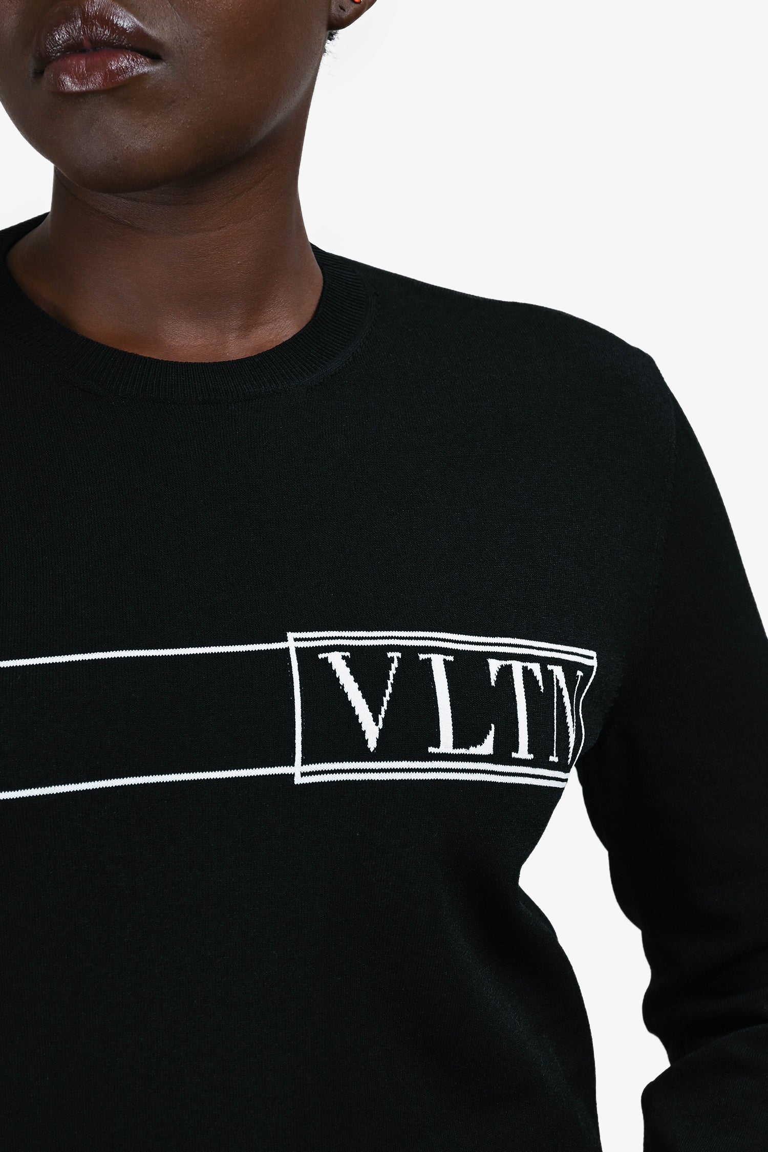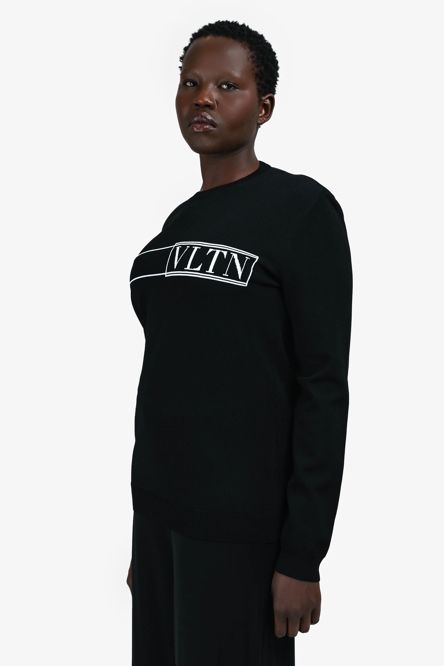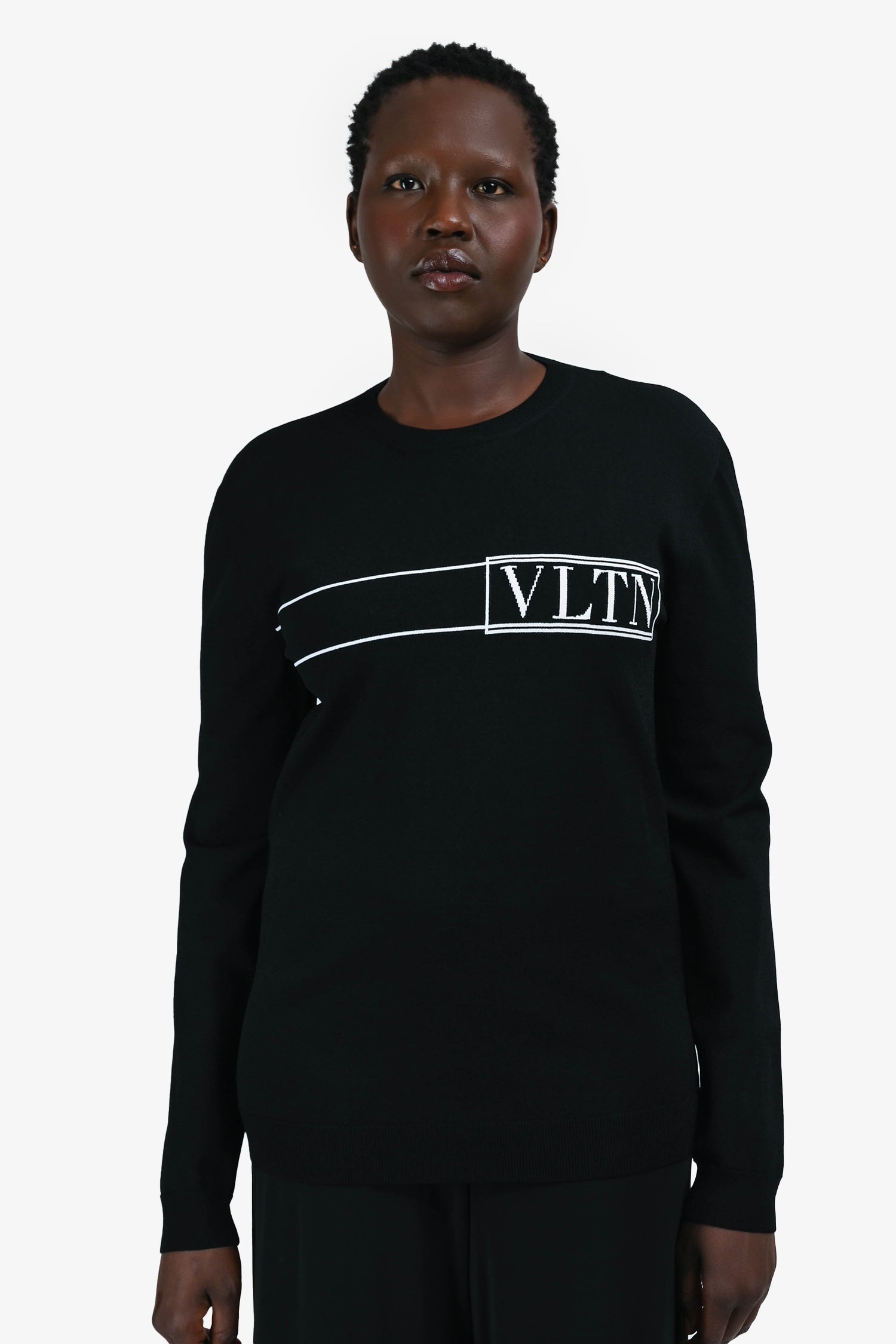 Refresh availabilityValentino Black/White VLTN Logo Sweater. Round neck. Pull-on. Ribbed neck, cuffs and hem.