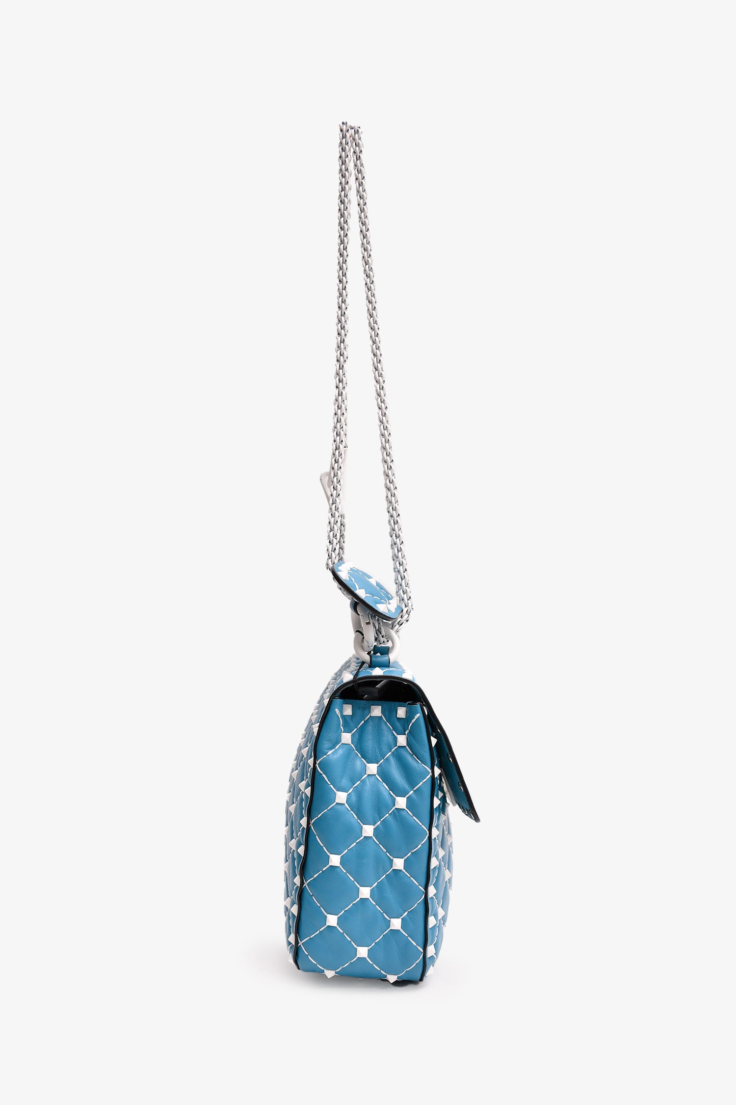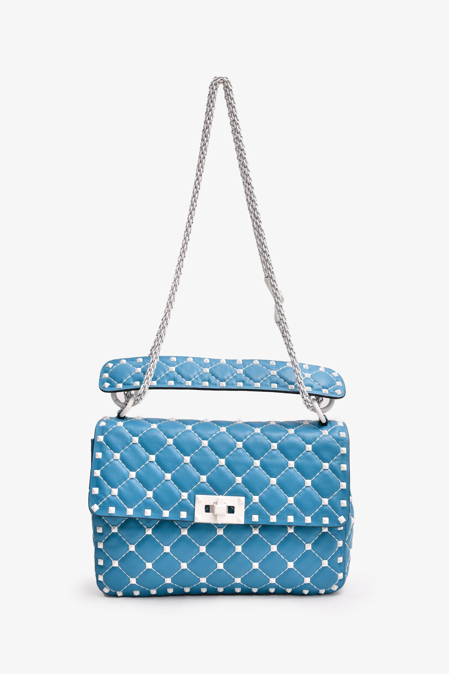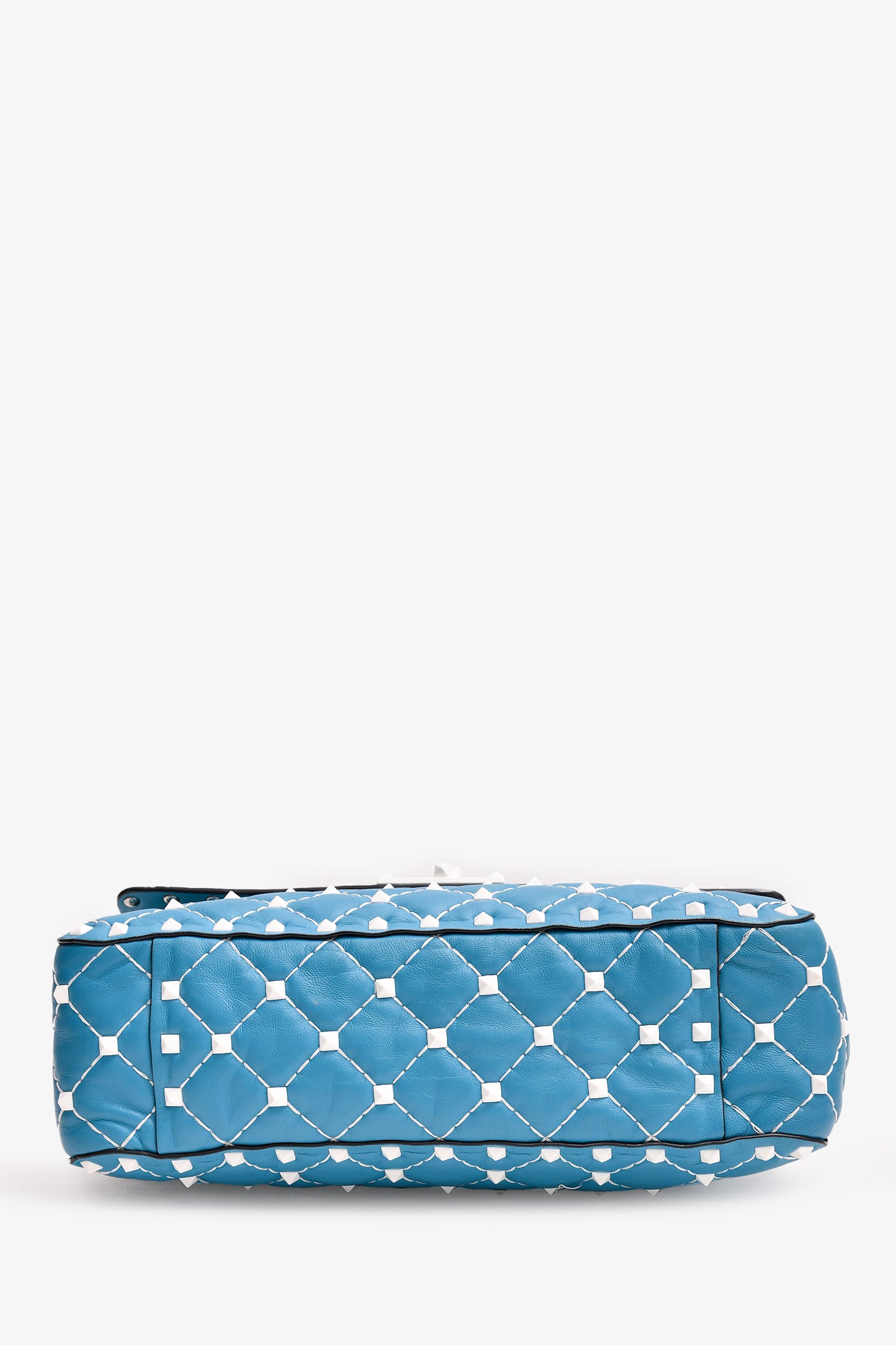 Refresh availabilityValentino Blue/White Rockstud 'Spike' Top Handle with Strap. Top handle. Front fold-over flap with turn-lock closure. Slide-around chain. Contrasting red leather interior wall zip pocket. Single interior wall slip pocket. White-tone hardware.