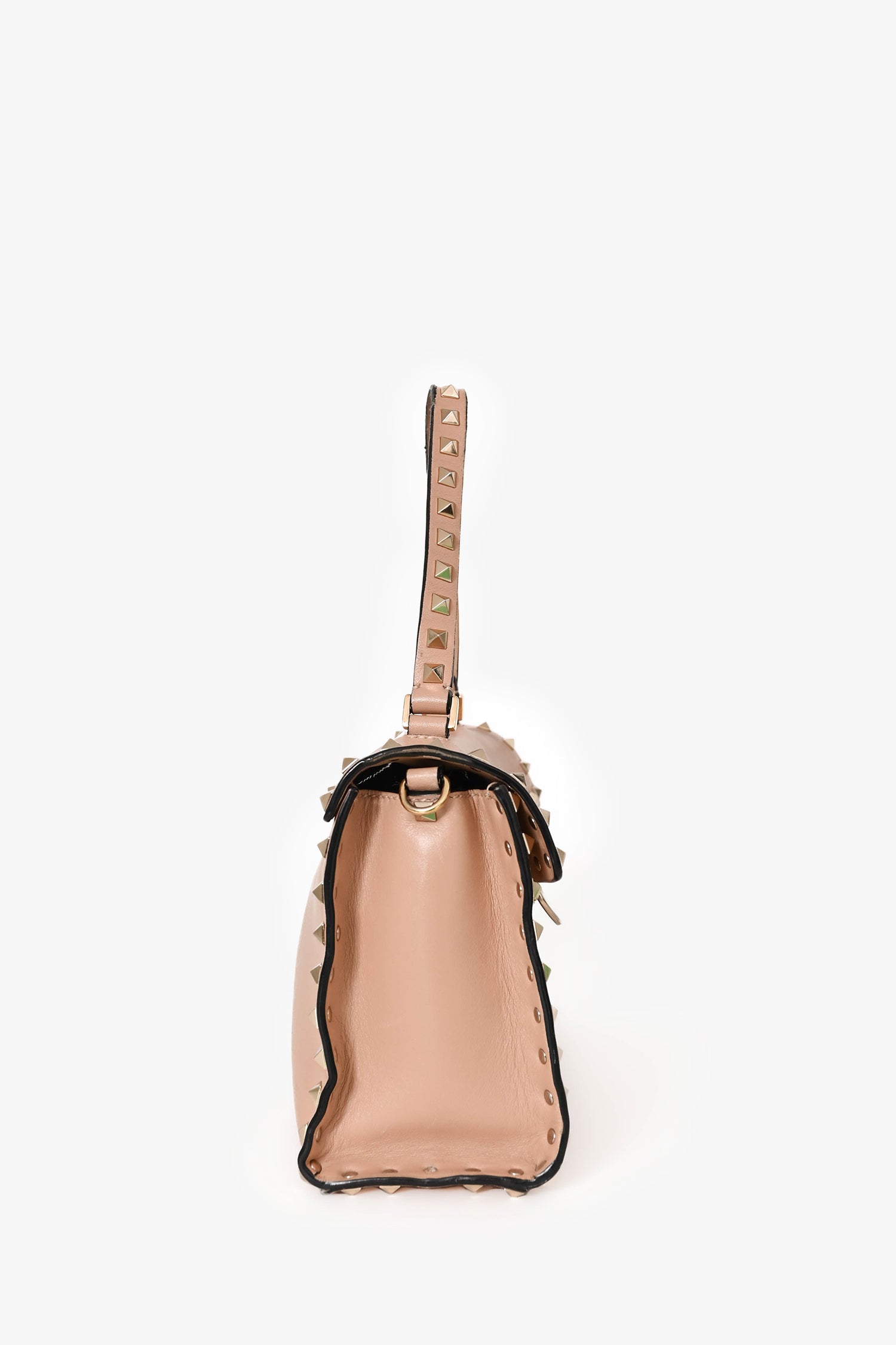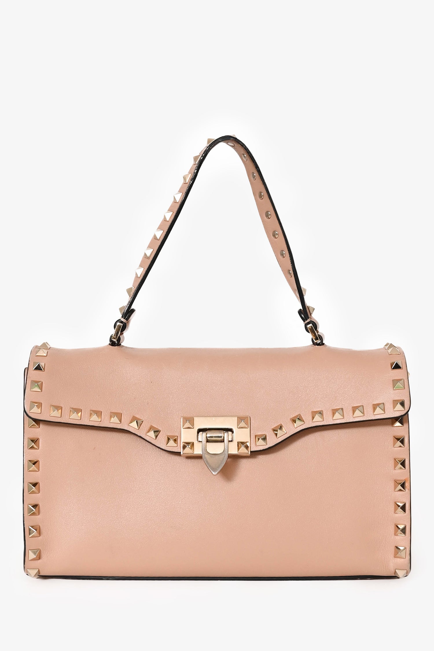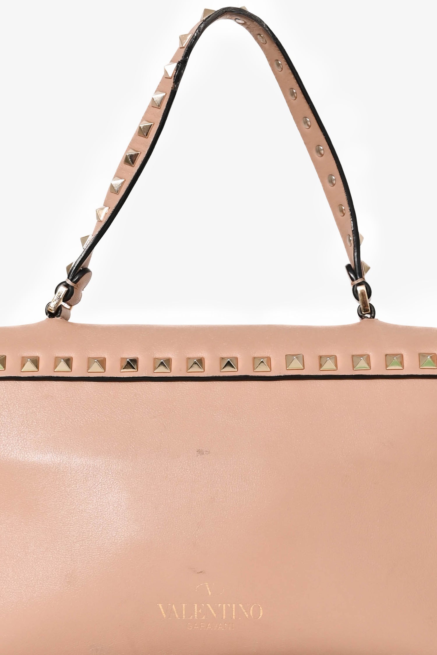 Refresh availabilityValentino Blush Leather Rockstud Top Handle Bag. Front fold-over flap with flip-lock closure. Beige textile interior lining. Three interior compartments; two open and one with zip closure. Three interior wall pockets; two slip and one with zip closure. Gold-tone hardware.