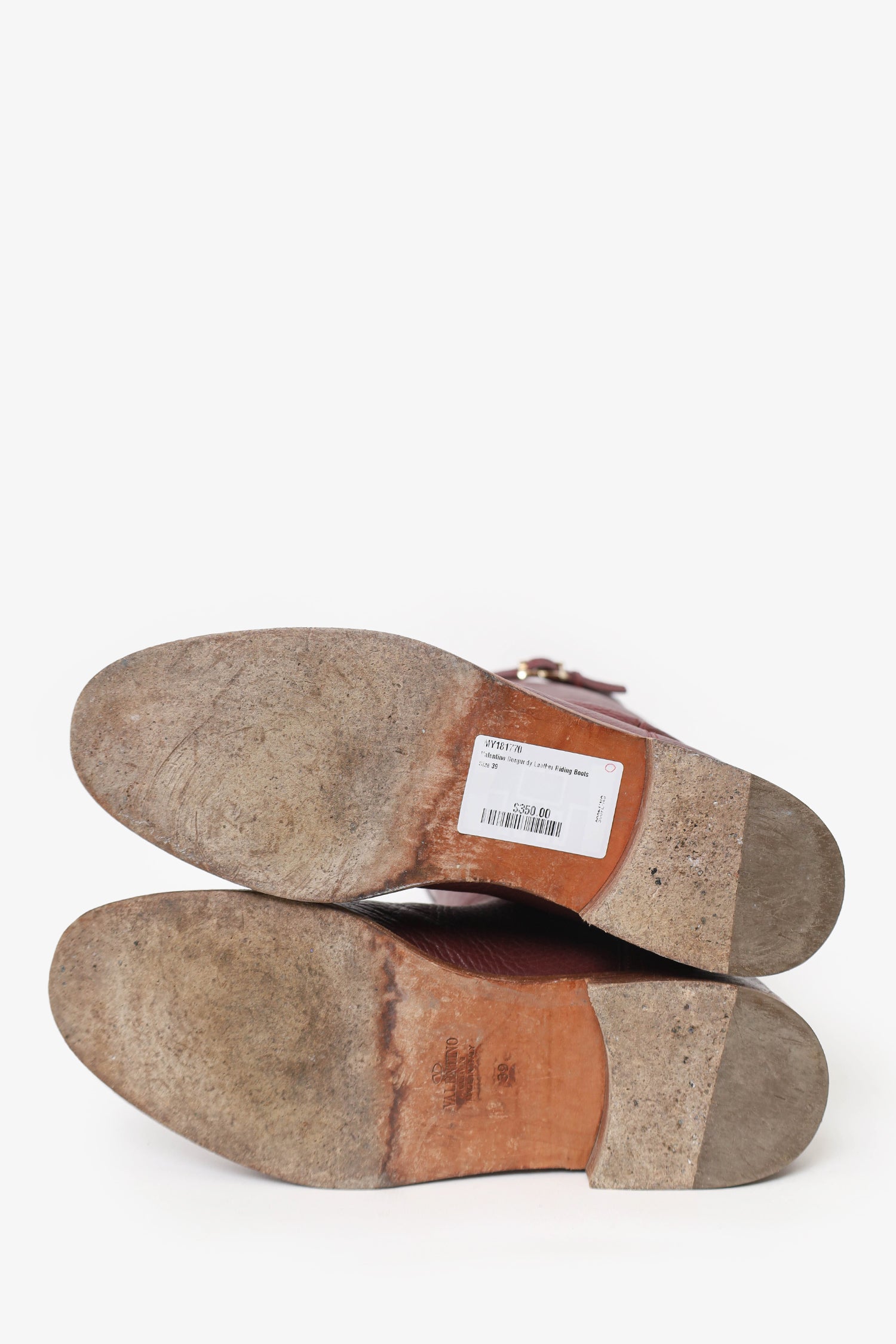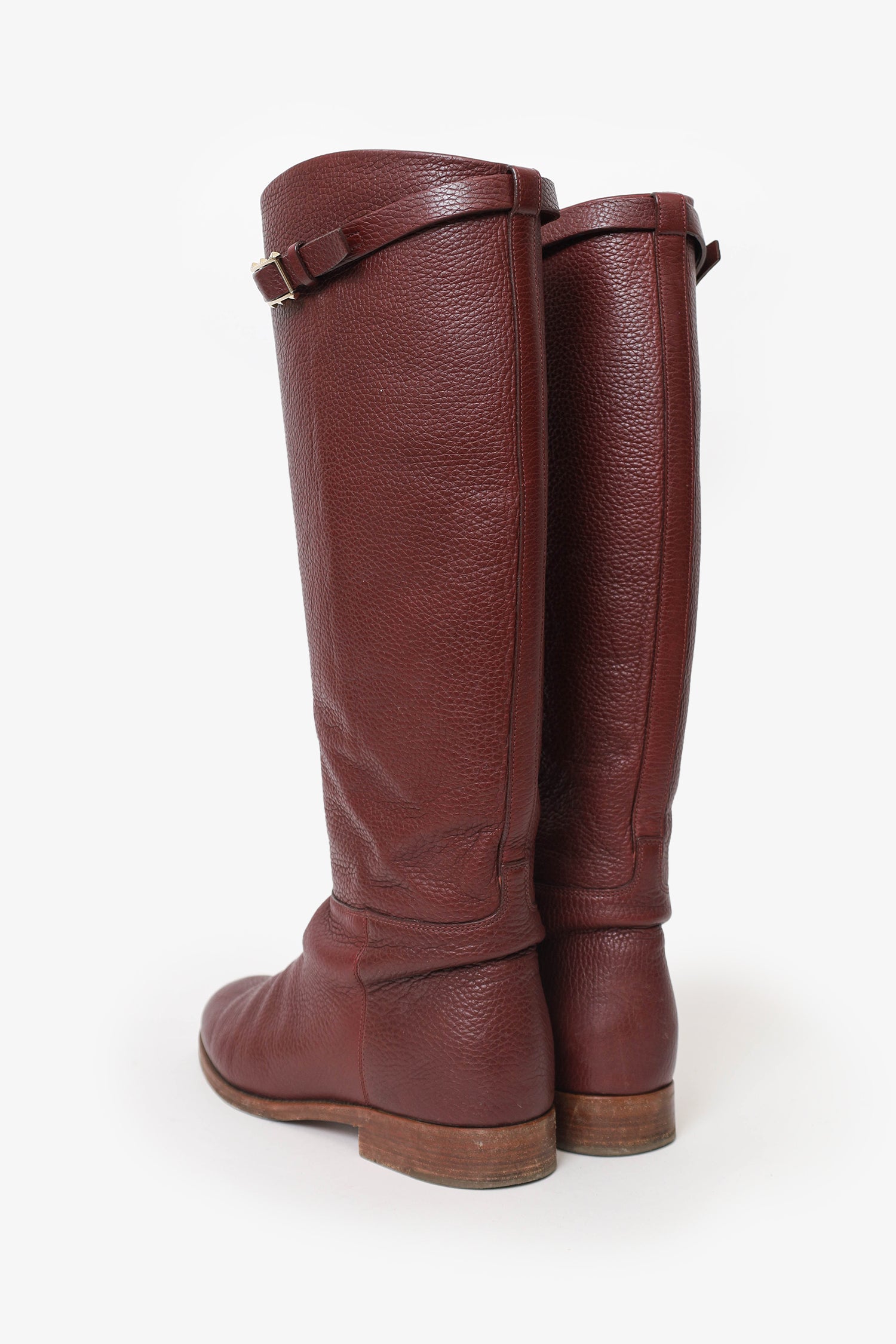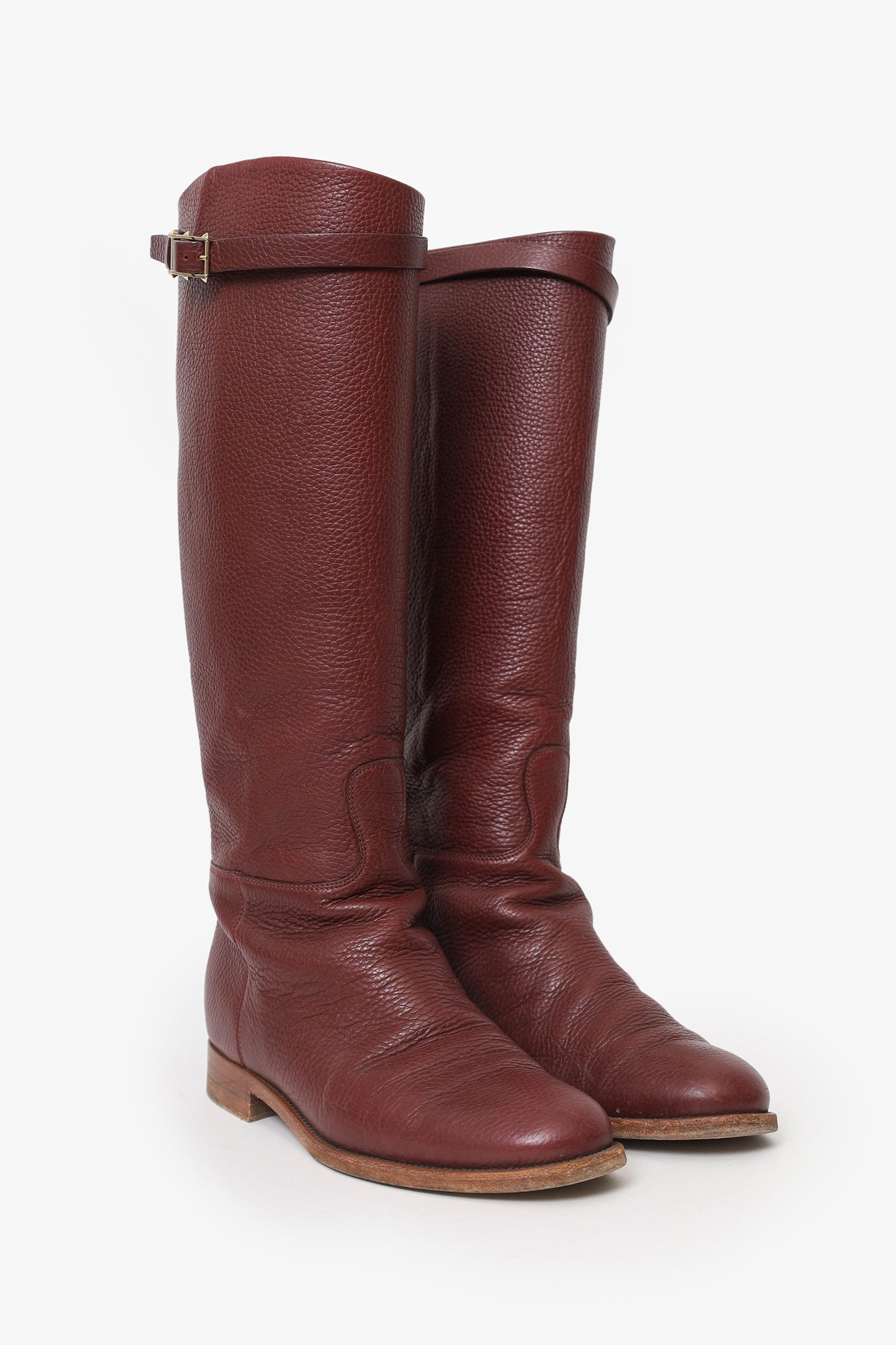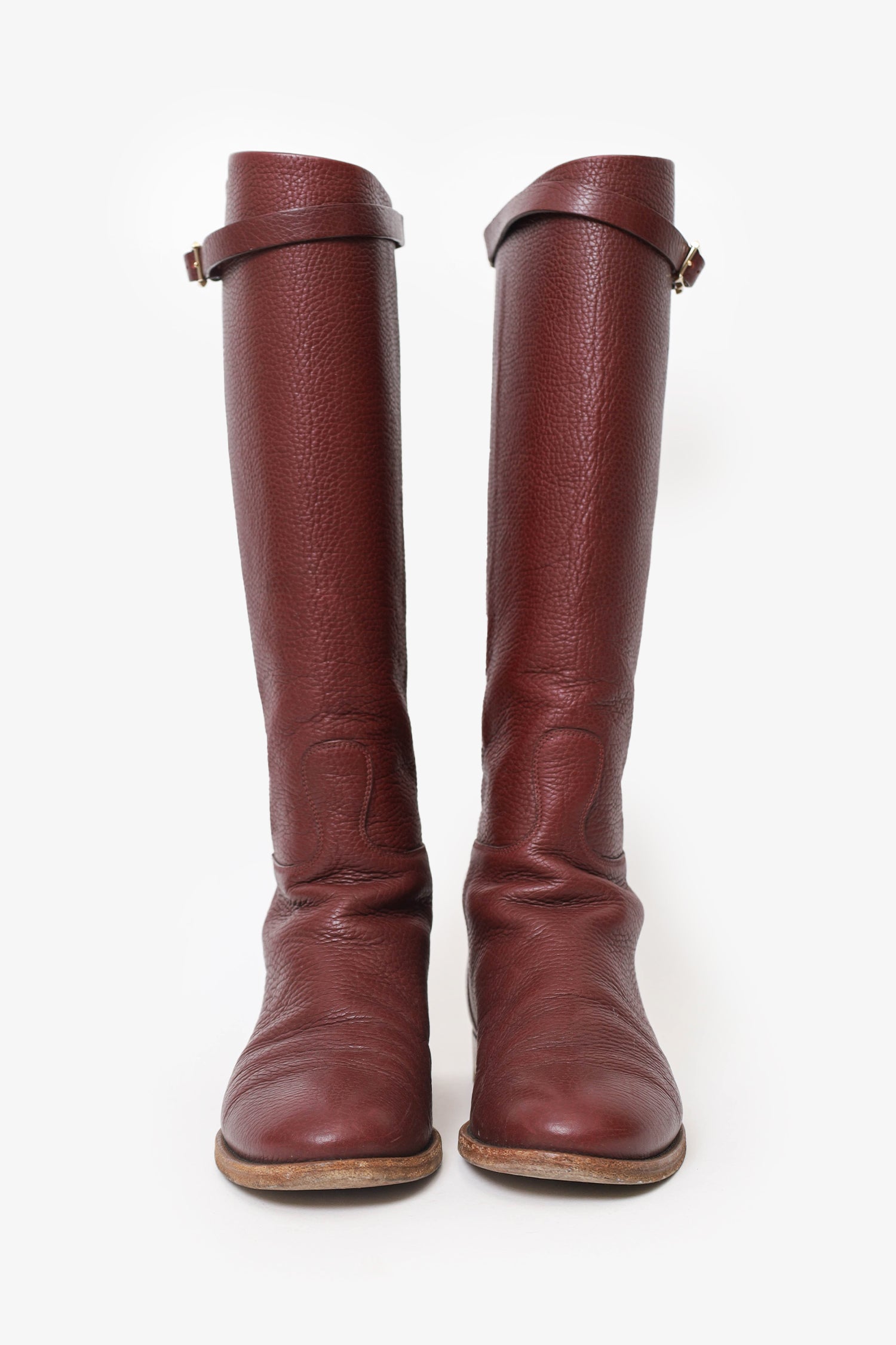 Refresh availabilityValentino Burgundy Leather Riding Boots. Pull-on. Round toe. Adjustable pull-through buckle closure to shaft. Block heel. Lined interior. Gold-tone hardware. Tonal stitching.