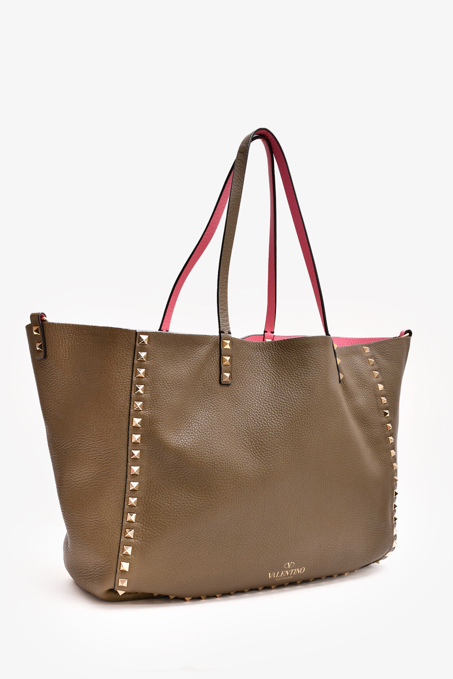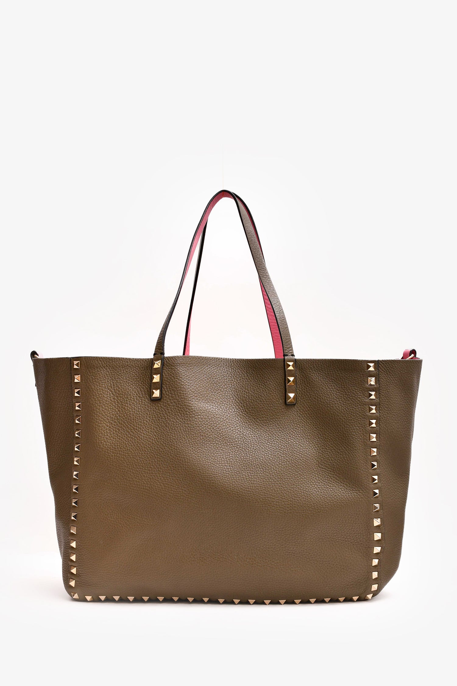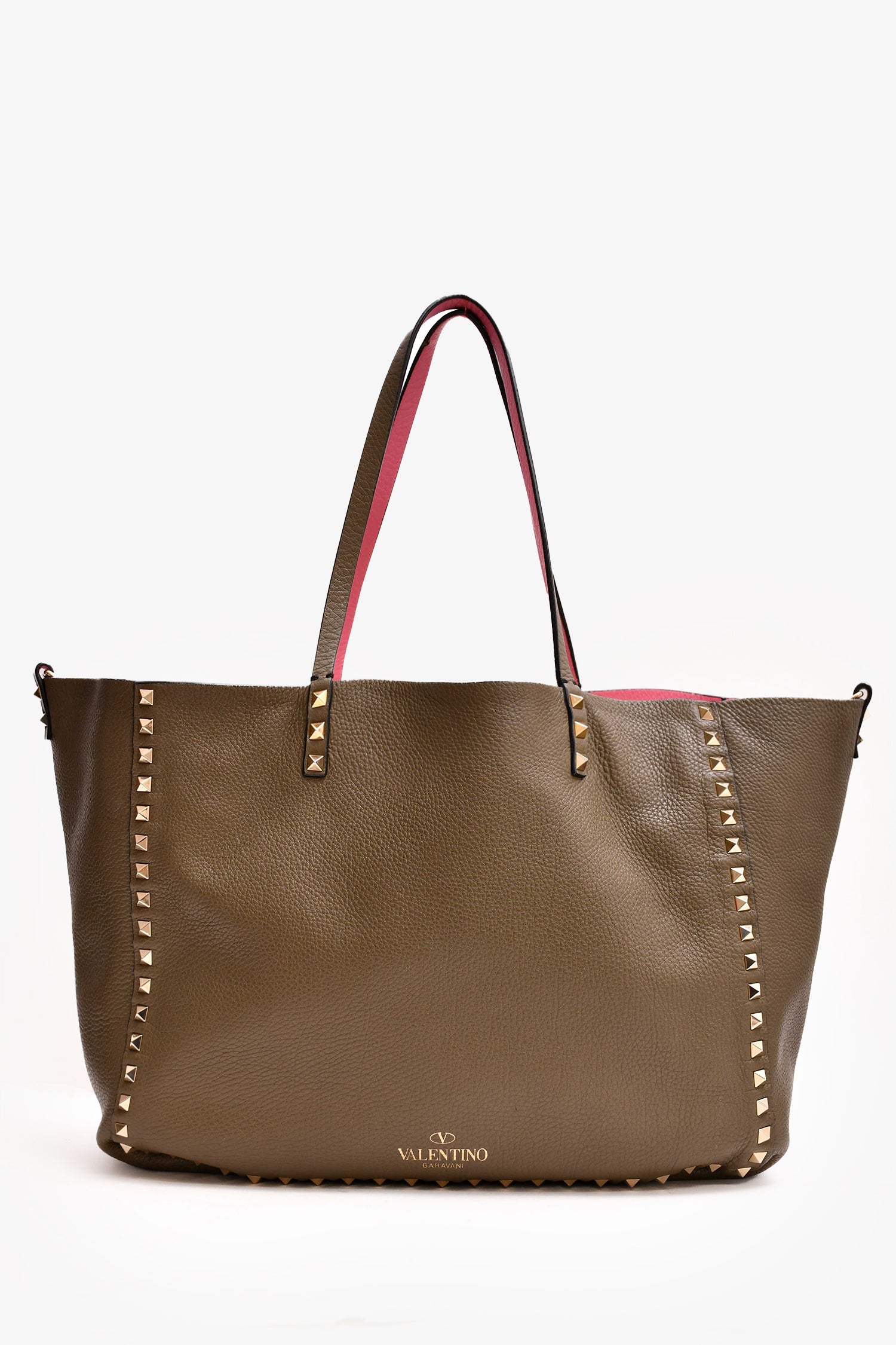 Refresh availabilityValentino Dark Green/Pink Reversible Rockstud Tote with Strap. Dual handles. Open to and interior. Gold-tone hardware.