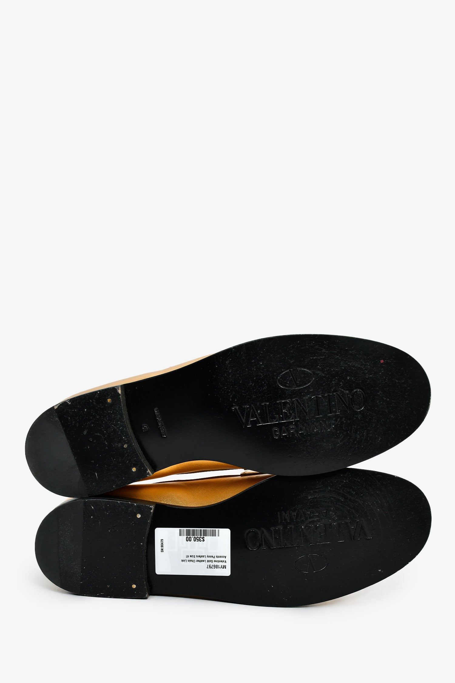 Refresh availabilityValentino Gold Leather Chain Link Accents Penny Loafers. Round toe. Leather insoles. Gold-tone hardware. Tonal stitching.