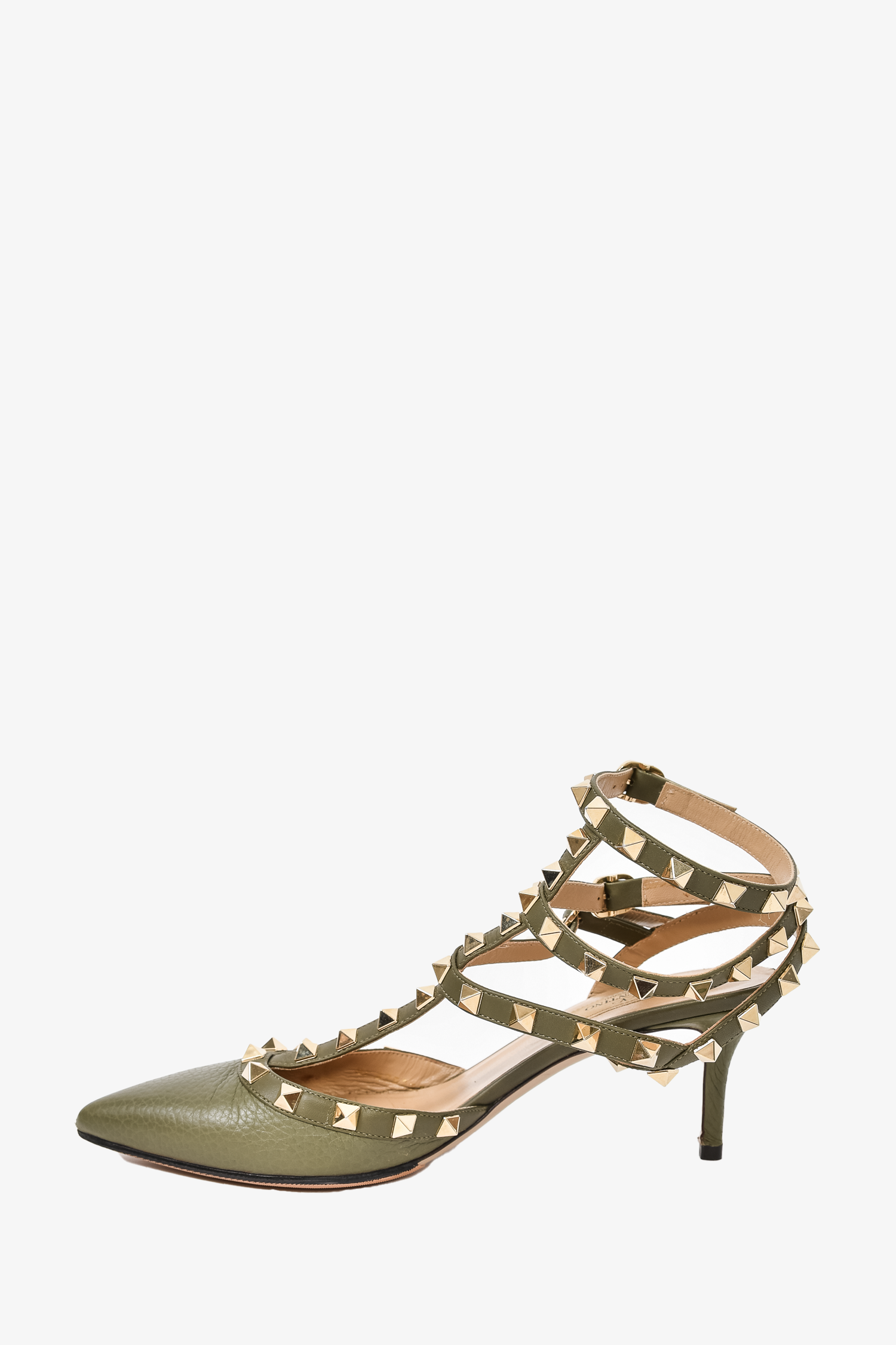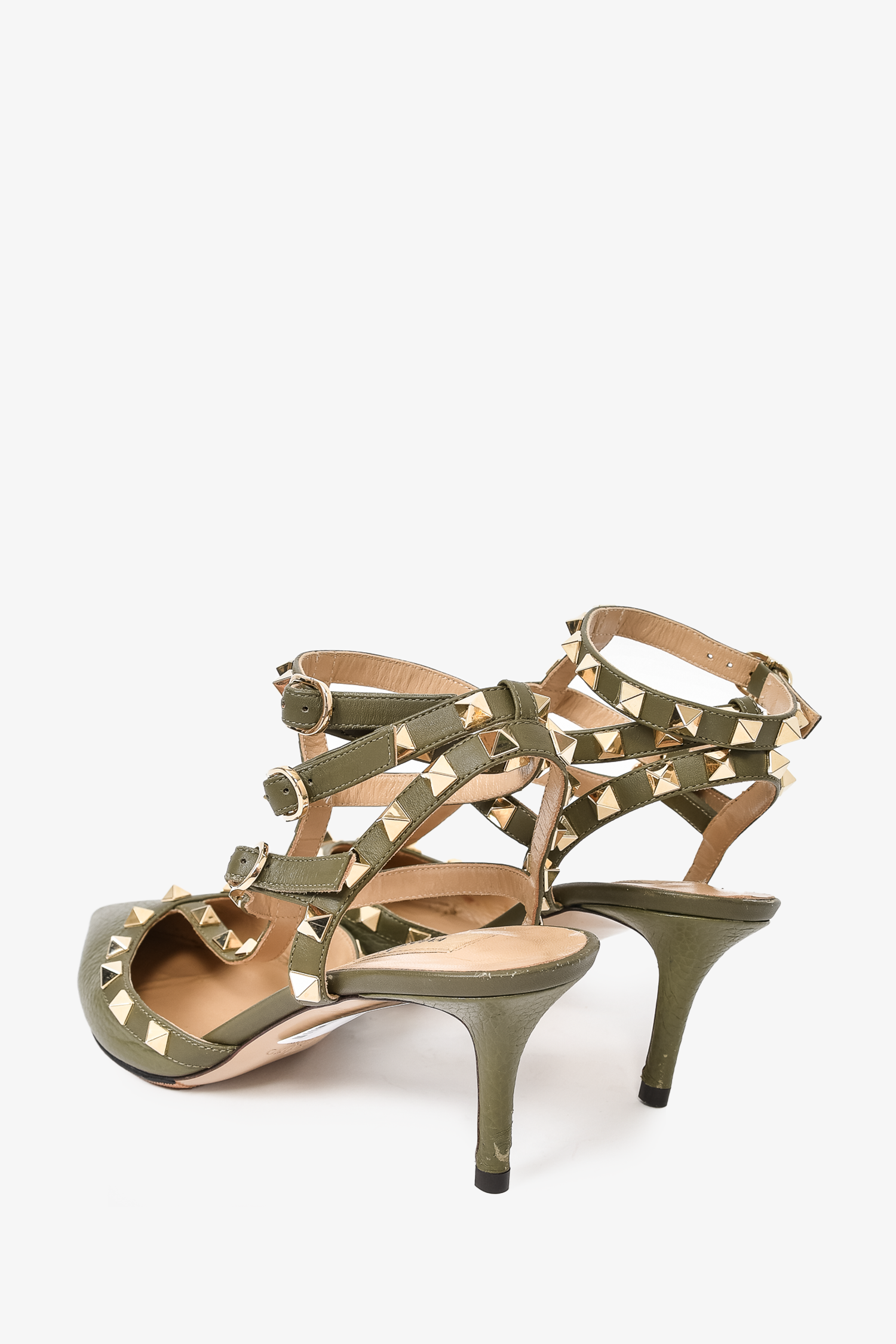 Refresh availabilityValentino Green Leather Rockstud Cage Heels. Pointed toe. Ankle strap with buckle closures. Tonal stitching. Topy soles.