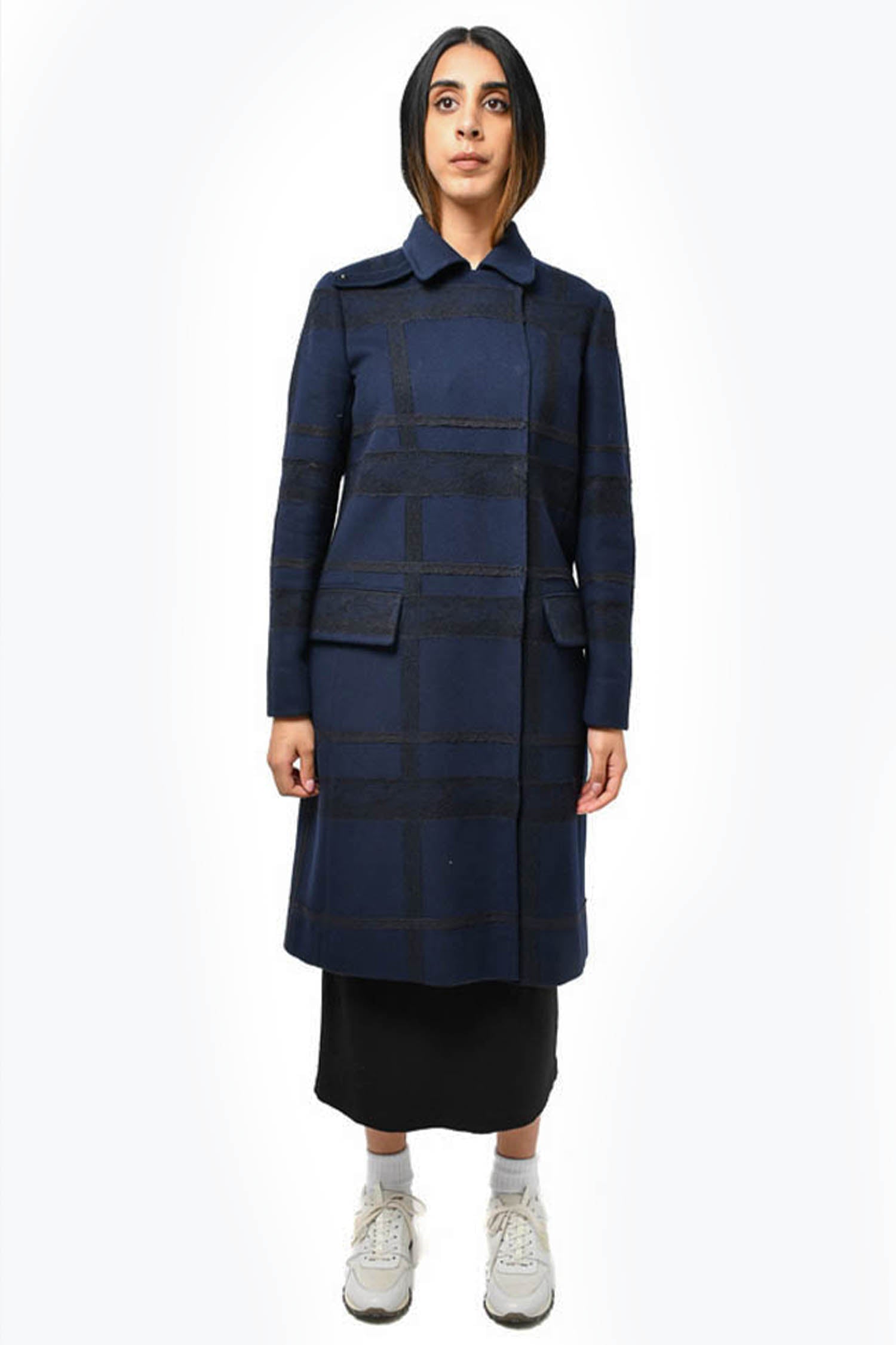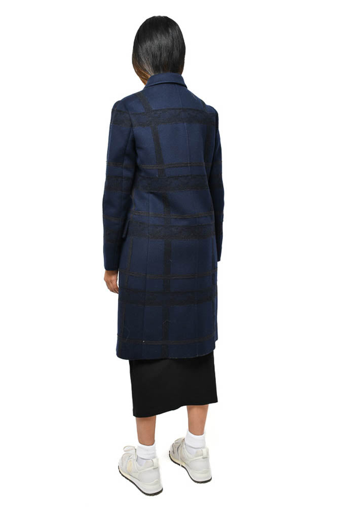 Refresh availabilityValentino Navy Blue/Black Grid Textured Wool/Cashmere Coat. Front button closure. Rounded collar. 2 exterior pockets. Interior lining in sleeves. Tonal stitching.
