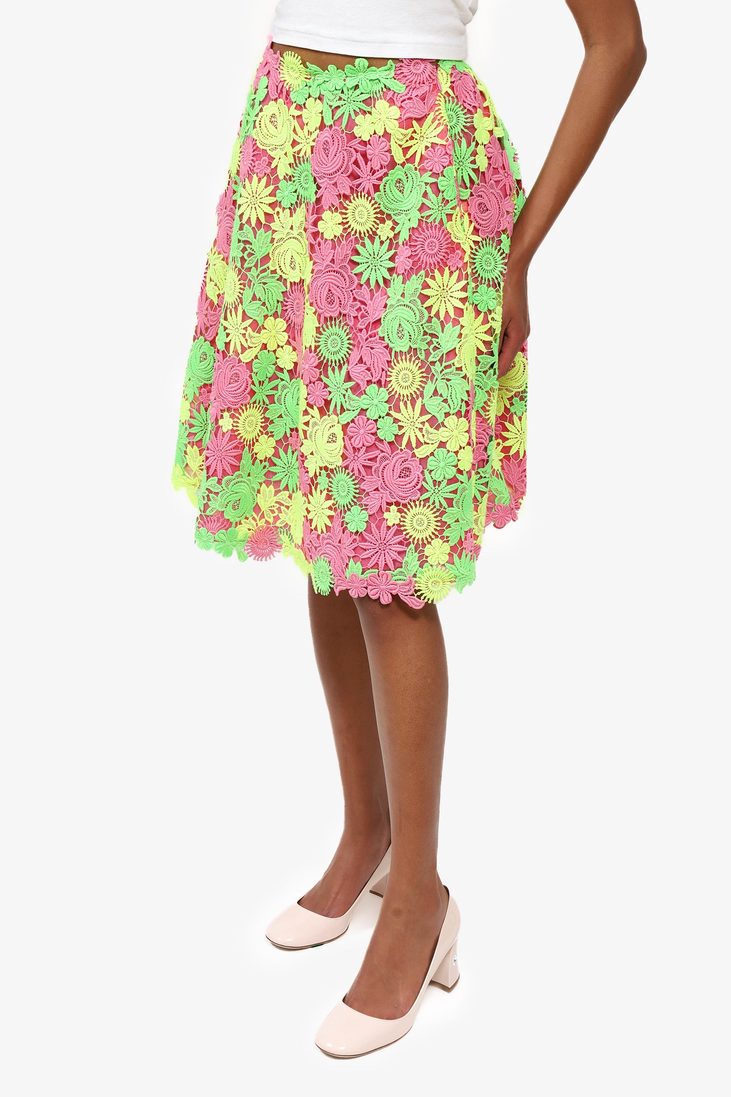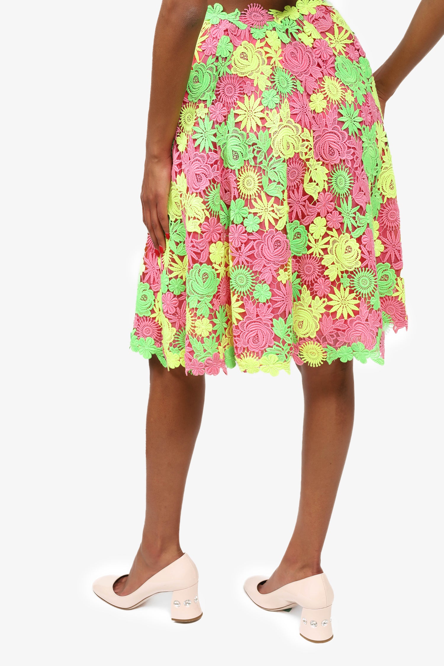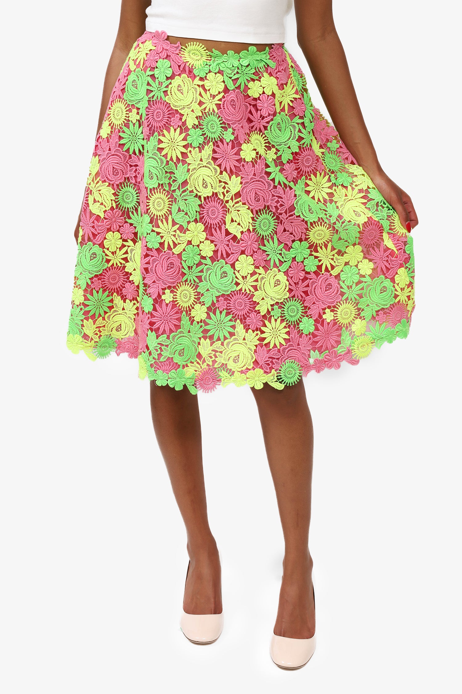 Refresh availabilityValentino Pink/Green/Yellow Silk Flower Lace Midi Skirt. Side zip with hook closure. Lined. Tonal stitching.