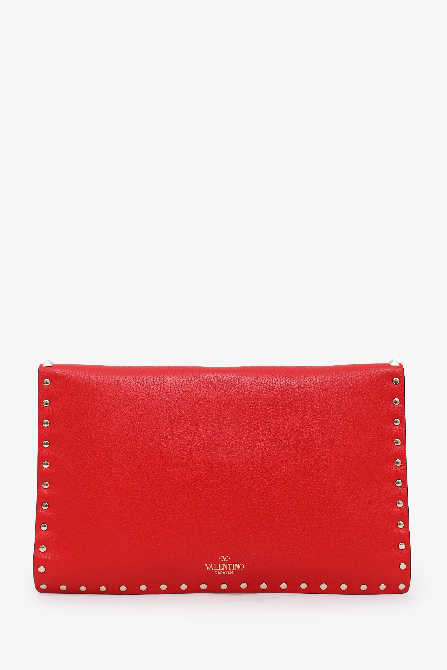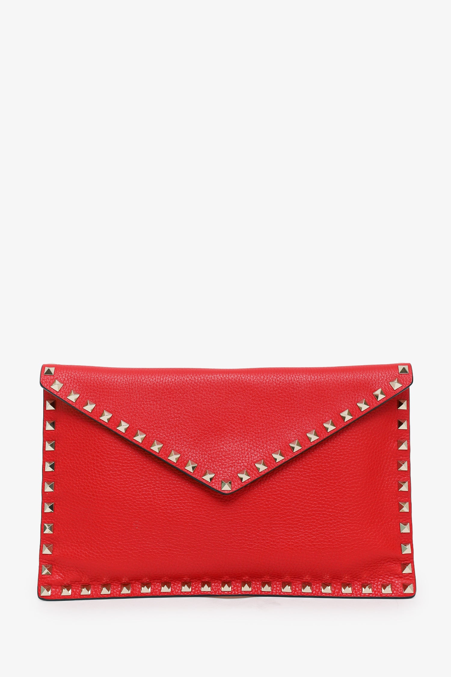 Refresh availabilityValentino Red Leather Large Rockstud Envelope Clutch. Front fold-over flap with magnetic snap-button closure. Suede-lined interior. 5 interior card slots. Silver-tone hardware. Tonal stitching.