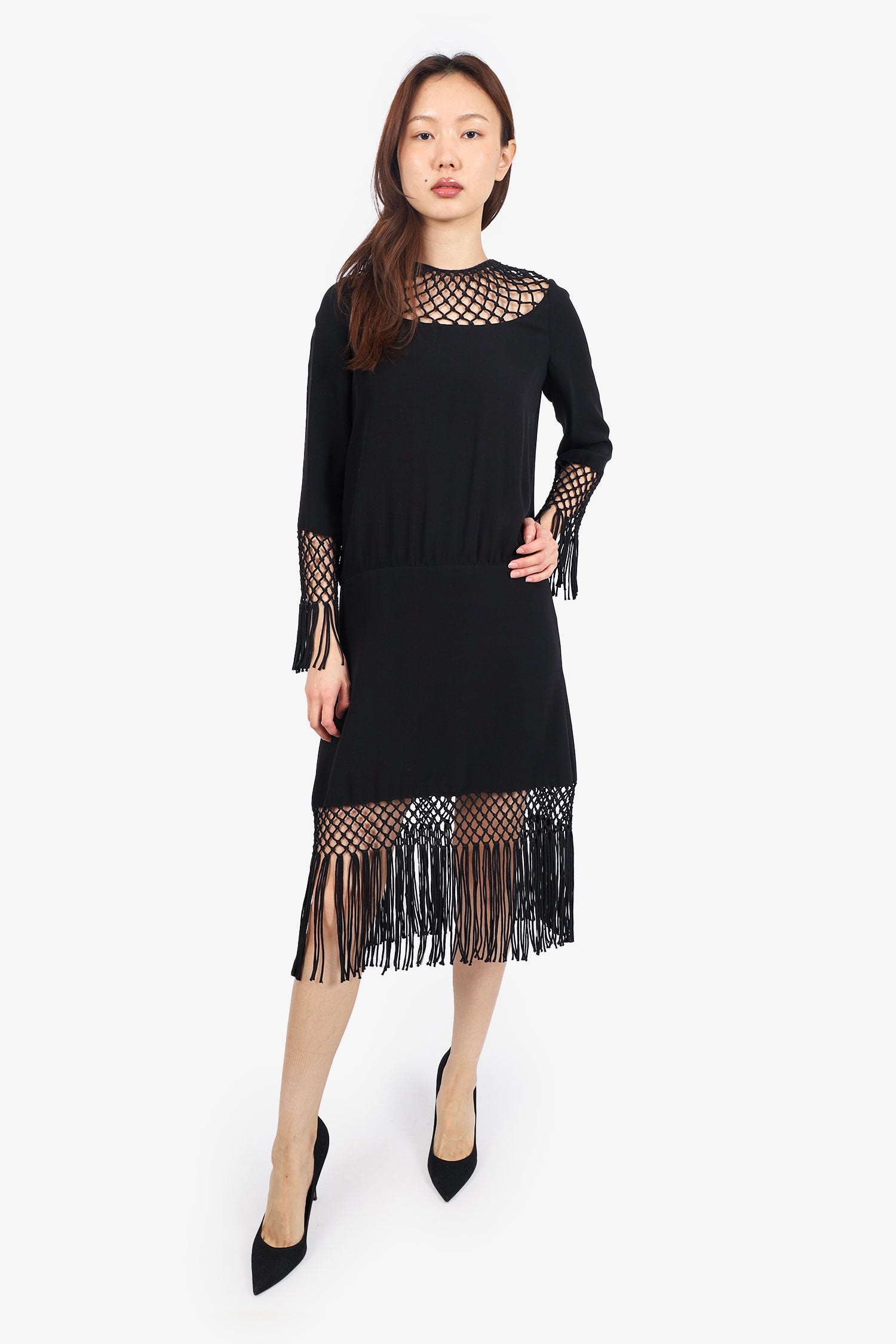 Refresh availabilityValentino Runway Black Crepe Silk Macramé Dress. Slip-on. Button-up closure along back. Round neckline. Tonal stitching.