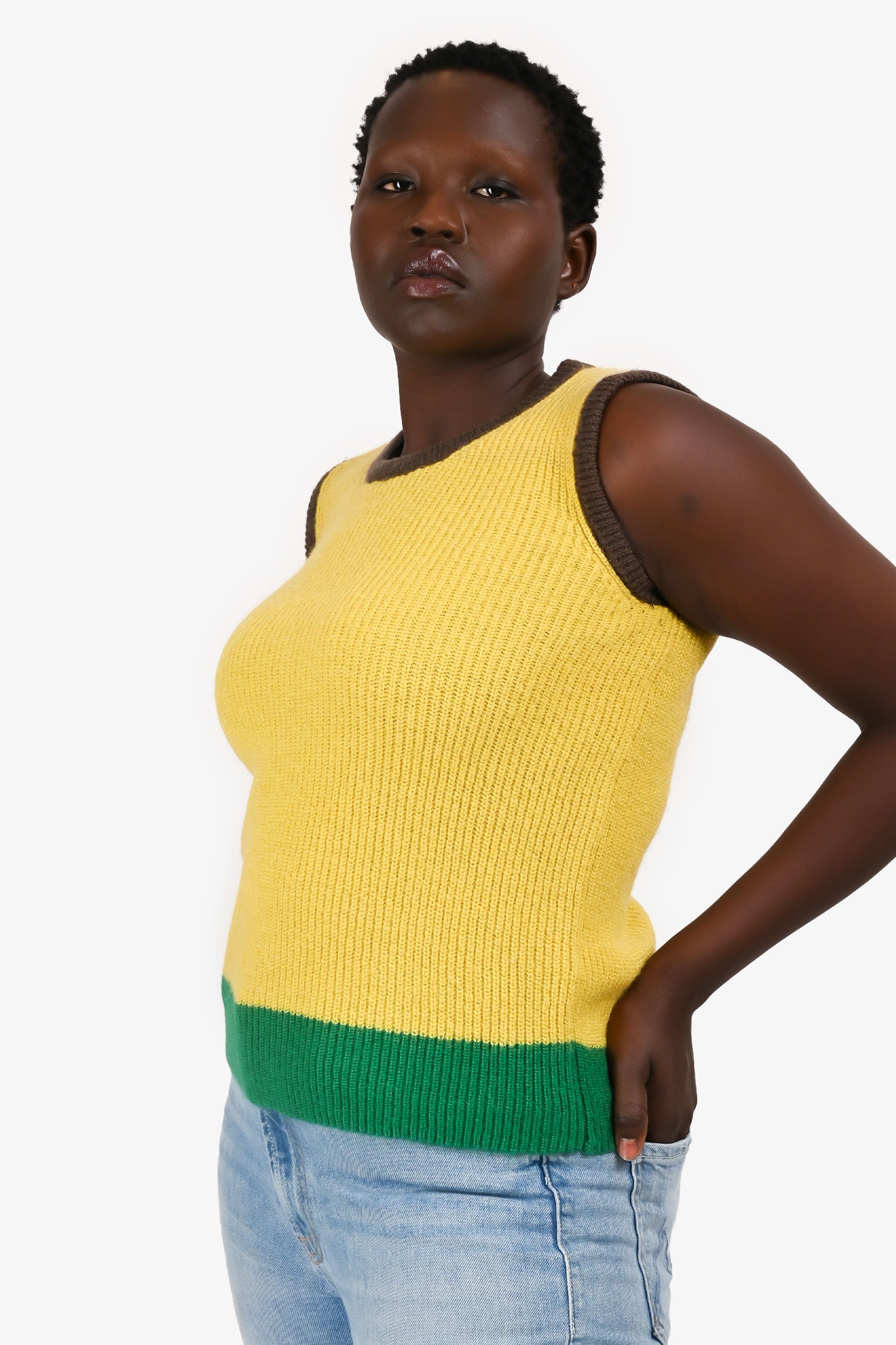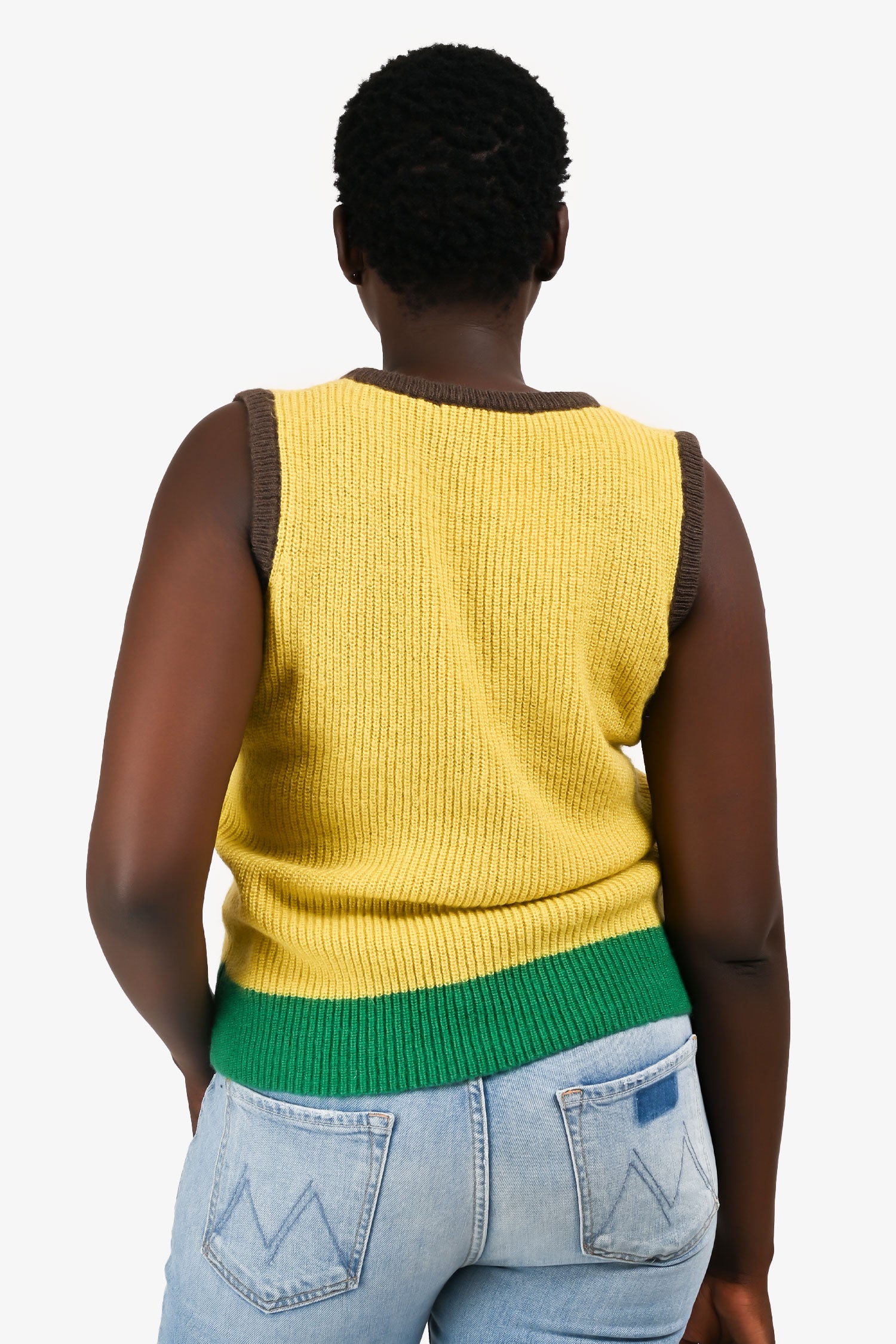 Refresh availabilityValentino Yellow/Brown Wool Colour Block Vest. Crew neckline. Sleeveless. Tonal stitching.