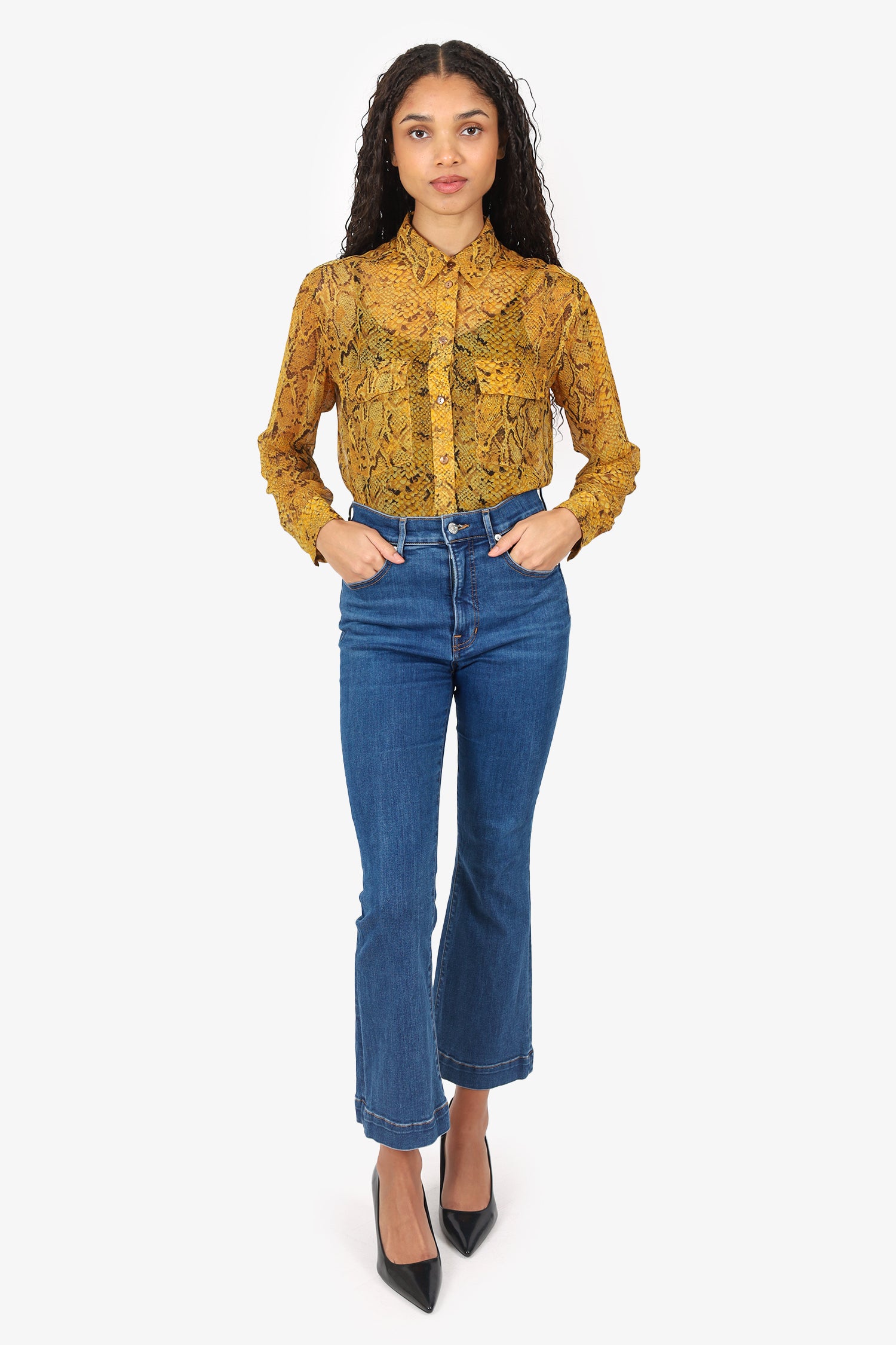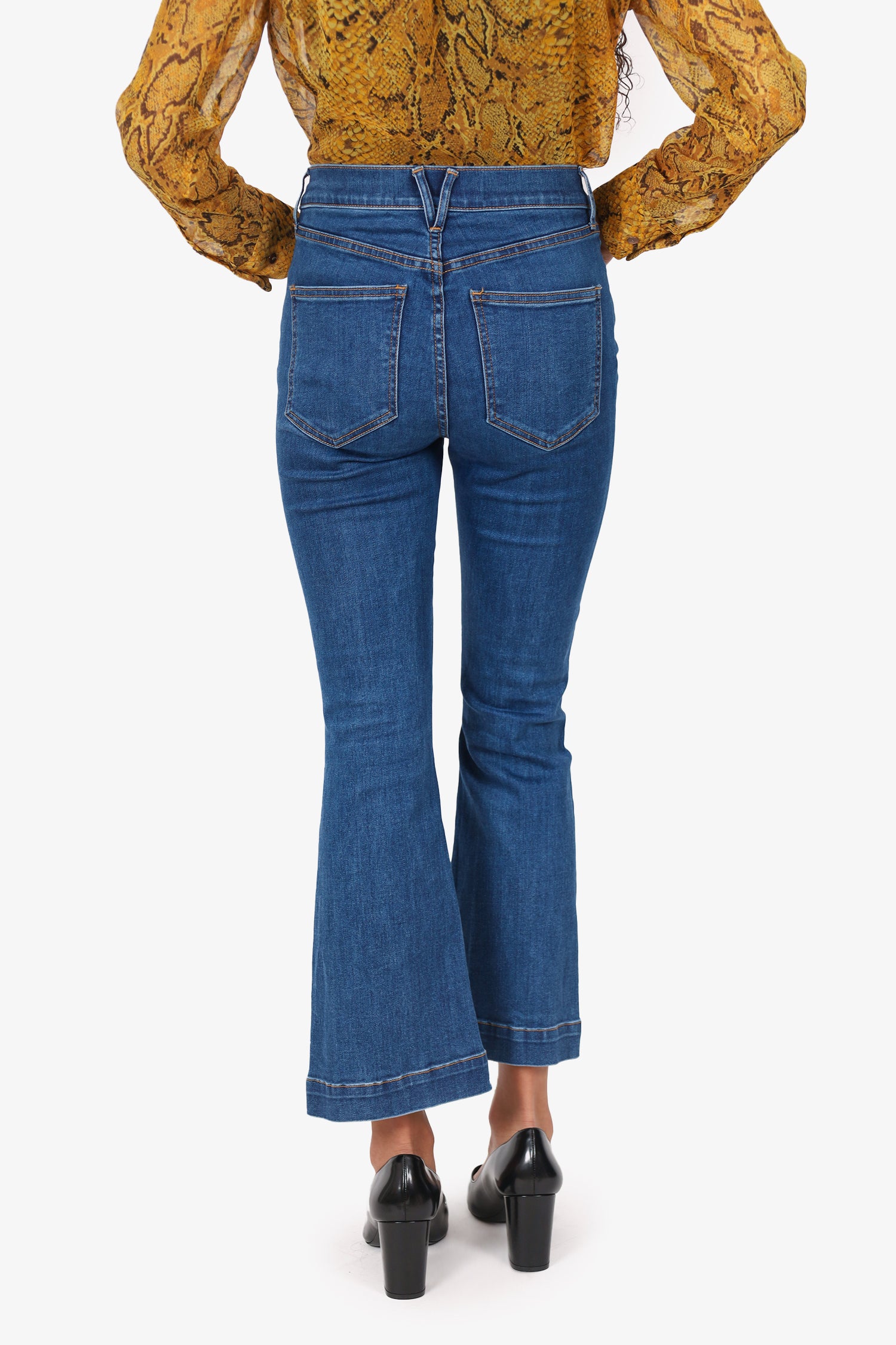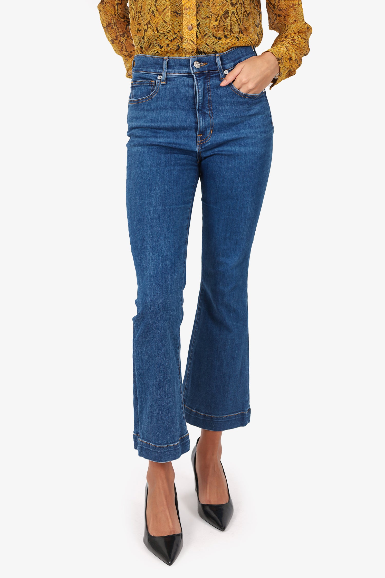 Refresh availabilityVeronica Beard Blue Denim Carson Ankle Flared Jeans. Slip on. Front zip with button-up closure. Waistband belt-loops. 5 exterior pockets; 2 front slip, 1 mini compartment, and 2 rear slip. Silver-tone hardware. Contrast stitching.