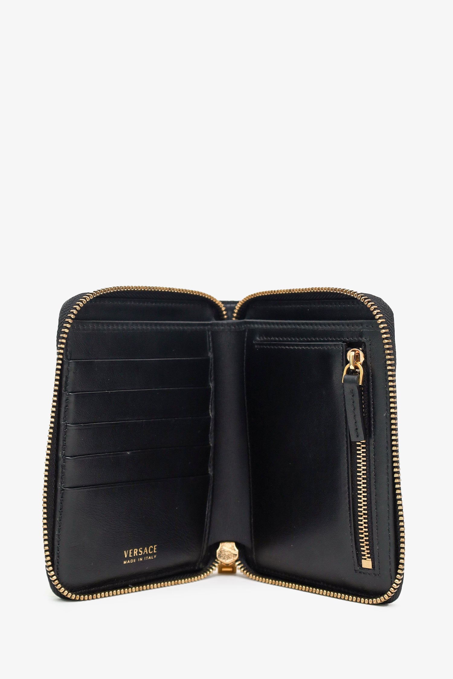 Refresh availabilityVersace Barocco Print GHW Leather Medusa Zip Wallet. Top zip closure. Lined interior with 9 pockets; 5 card slots, 2 slip, 1 zip, and 1 bill slot. Gold-tone hardware. Tonal stitching.