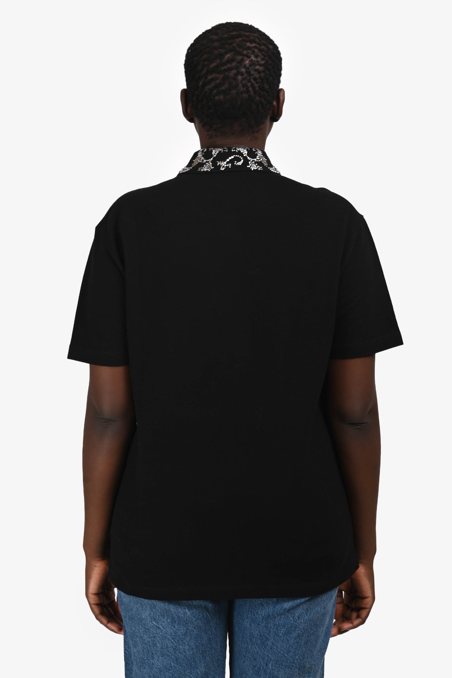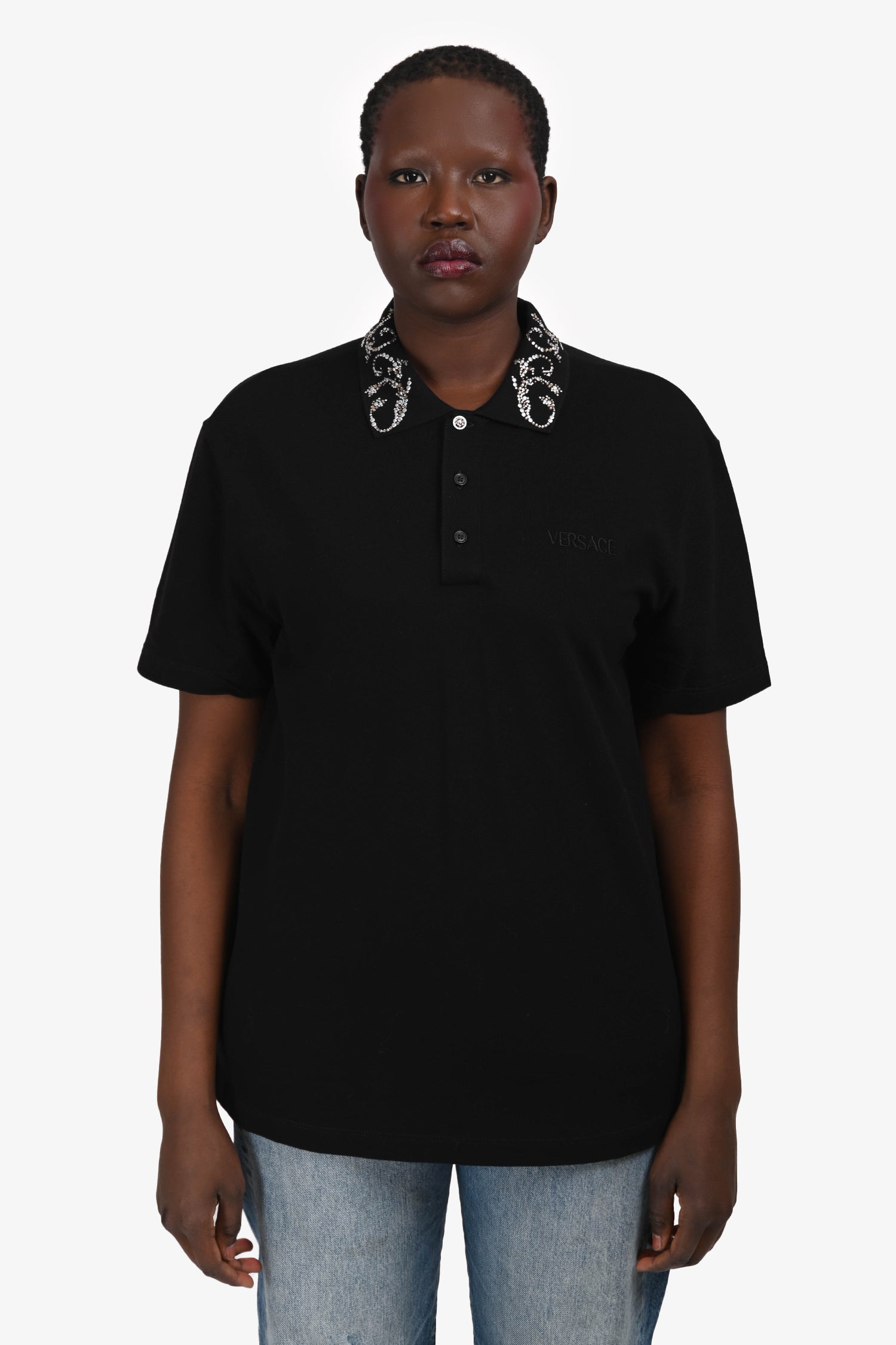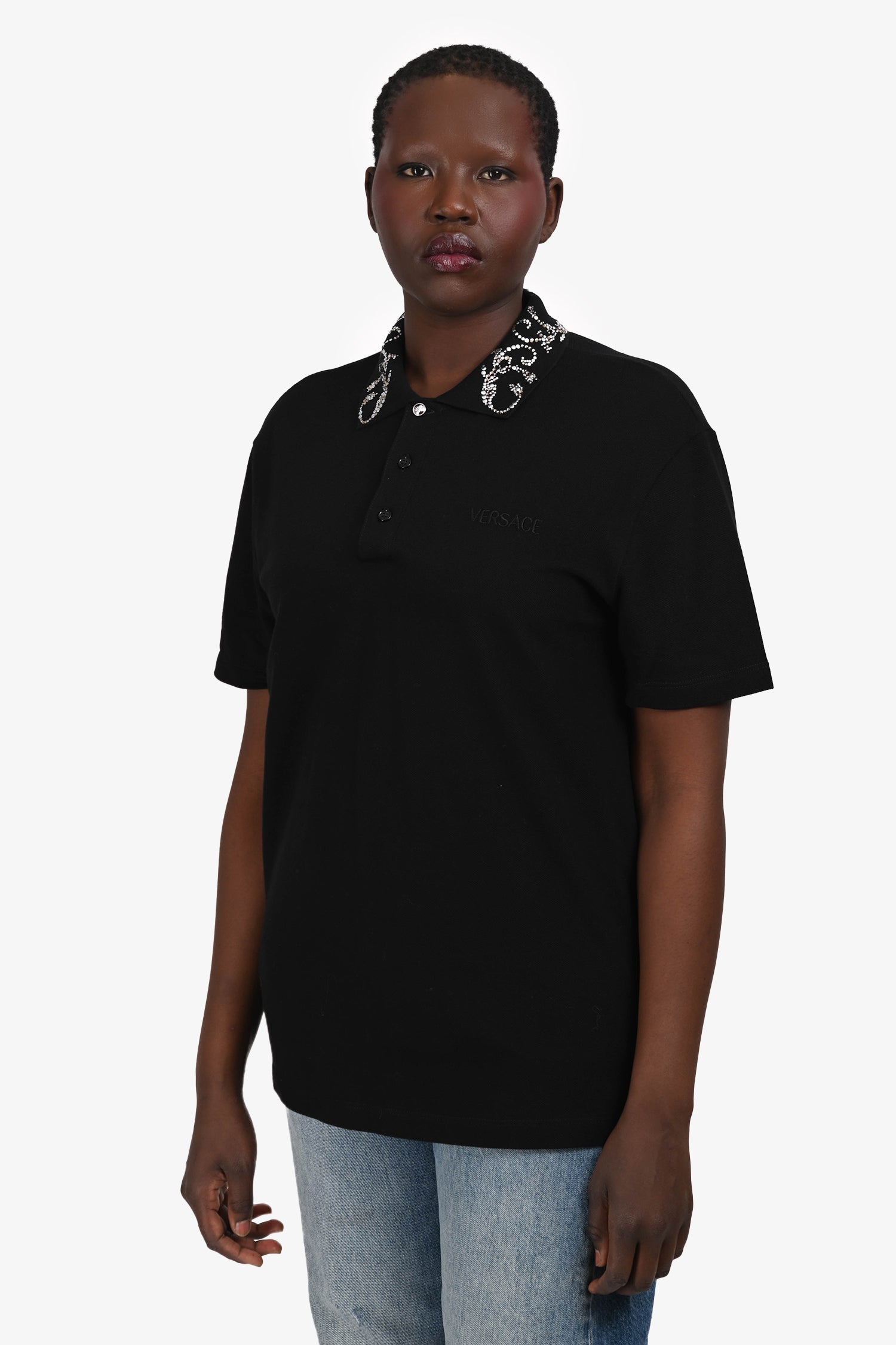 Refresh availabilityVersace Black Cotton Crystal Polo T-Shirt. Pull-on. Collared neckline. Front button-up closure. Silver-tone hardware. Tonal stitching.
