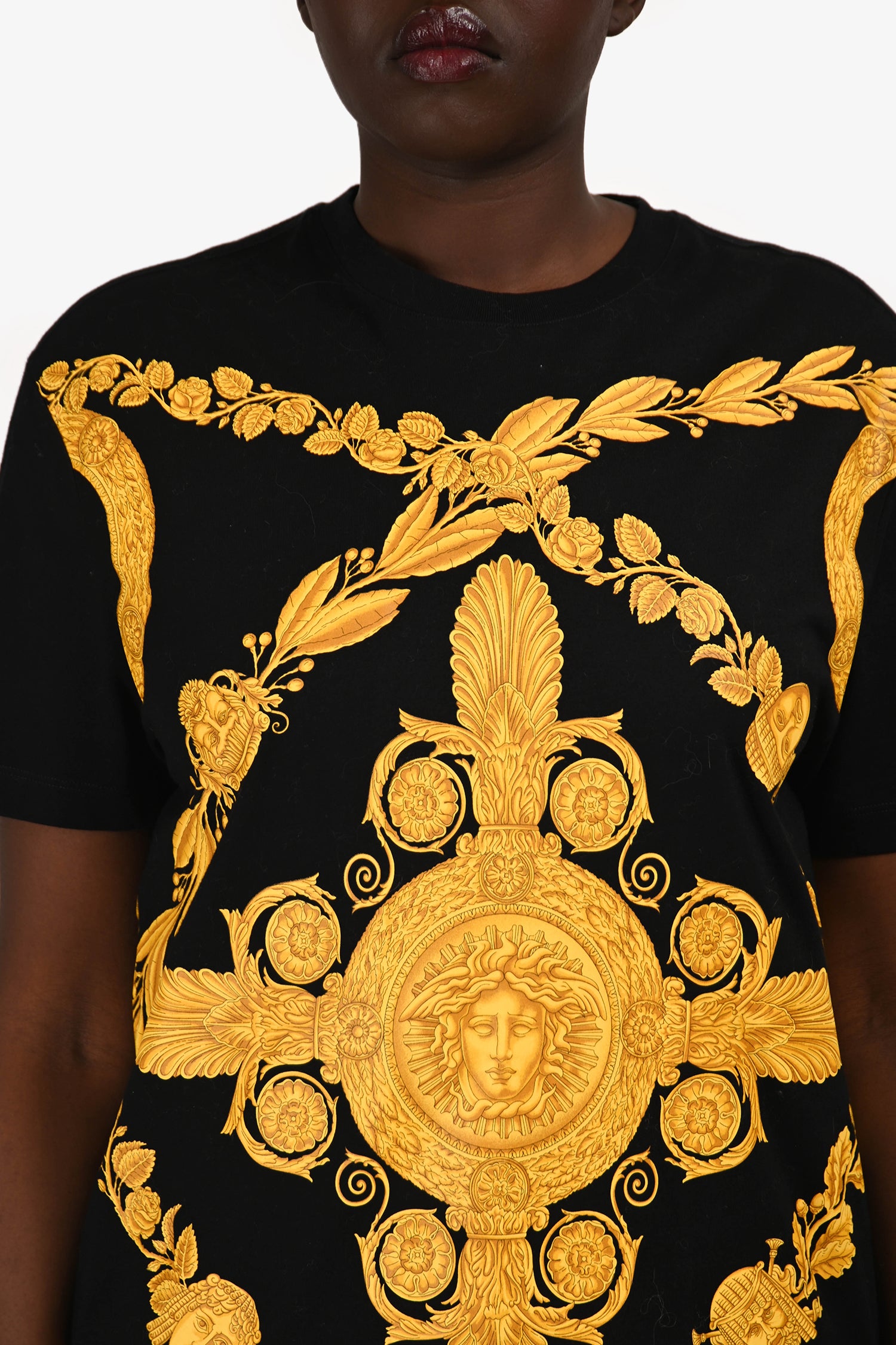 Refresh availabilityVersace Black Cotton Gold Baroque T-Shirt. Pull-on. Round neckline. Tonal stitching.