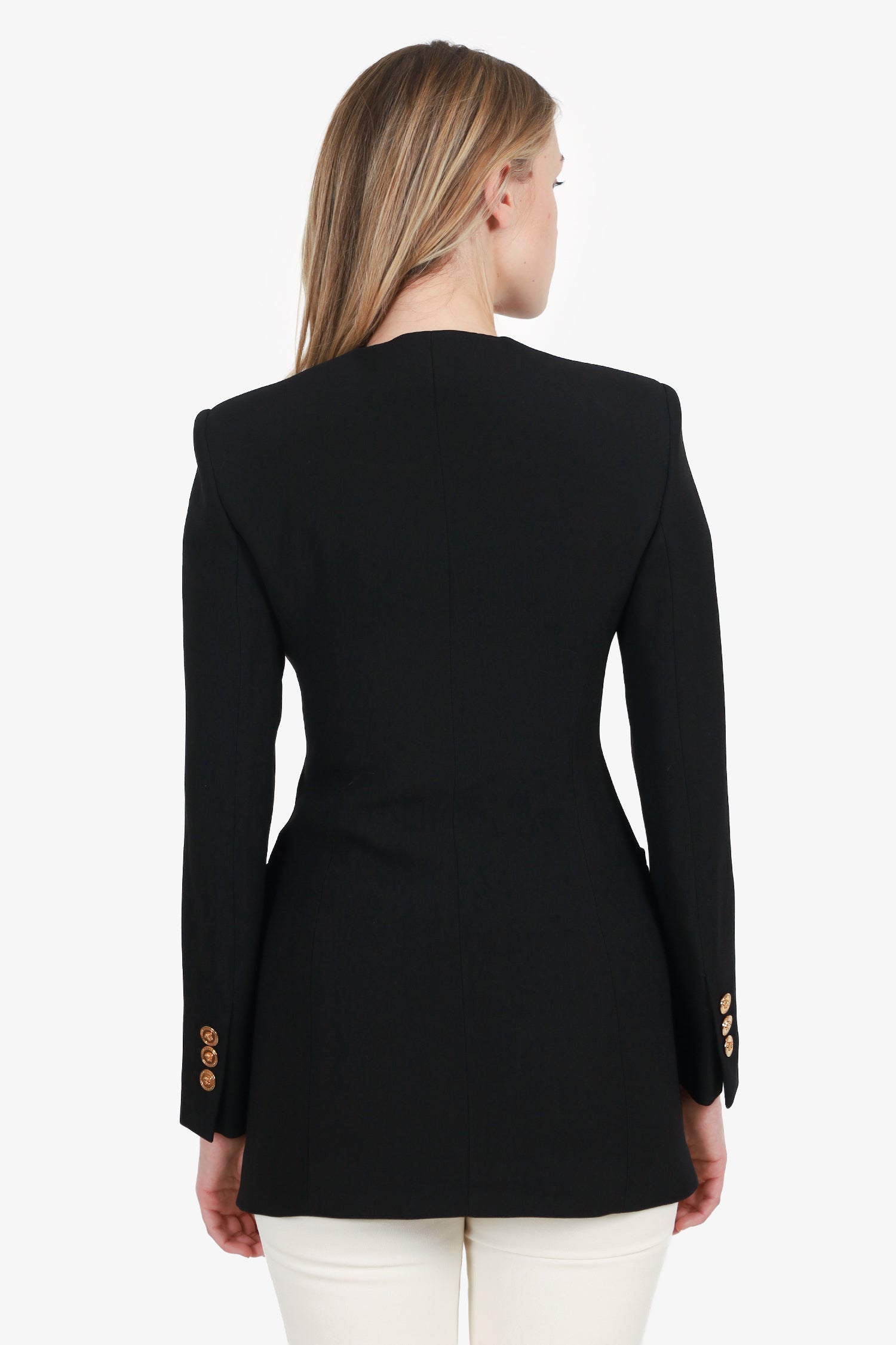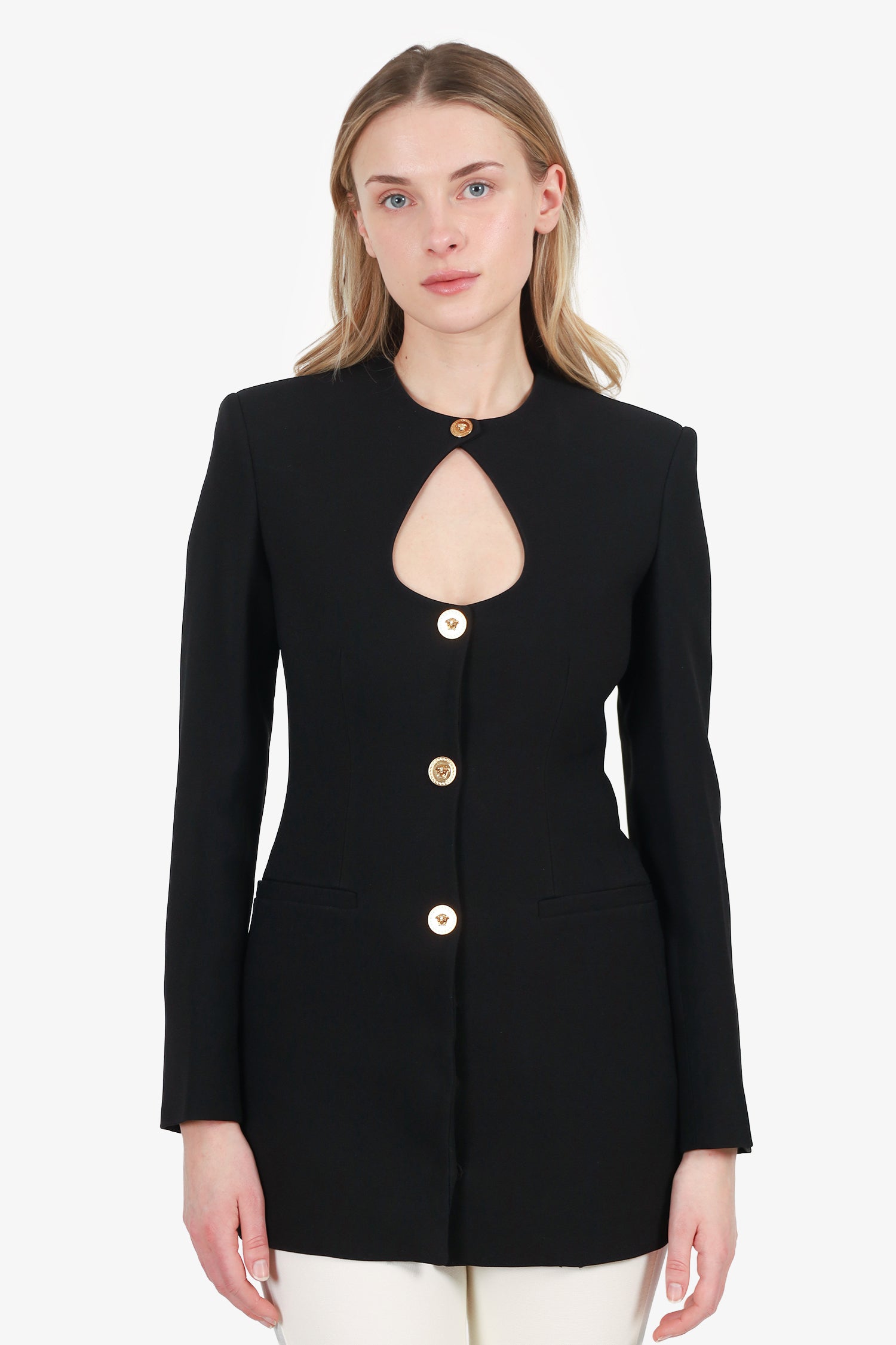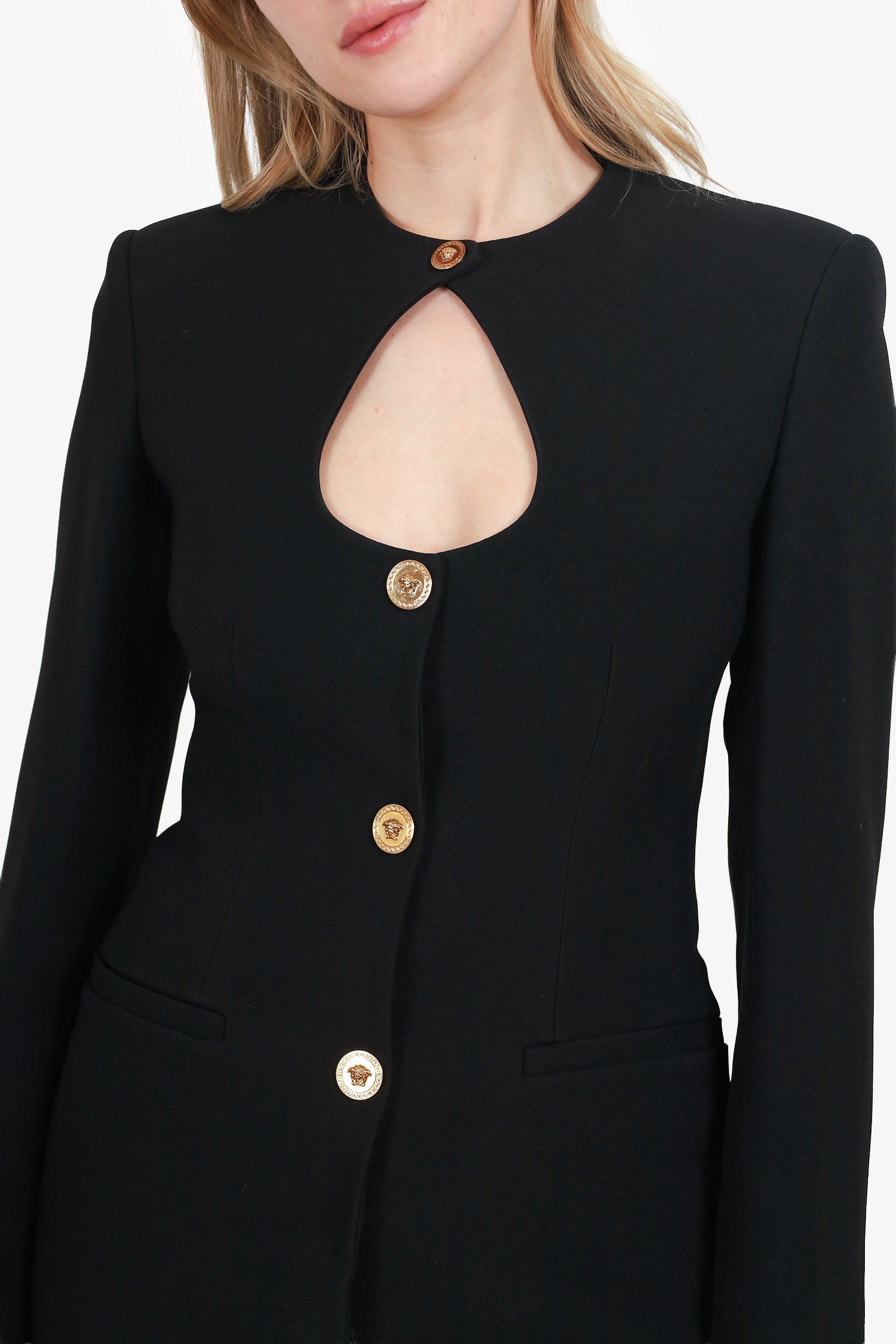 Refresh availabilityVersace Black Cut-Out Single-Breasted Blazer. Round neckline. Front snap-button-up closure. Padding to shoulders. Sleeve cuffs with button-up closure. 2 exterior front slip pockets. Gold-tone hardware. Tonal stitching.