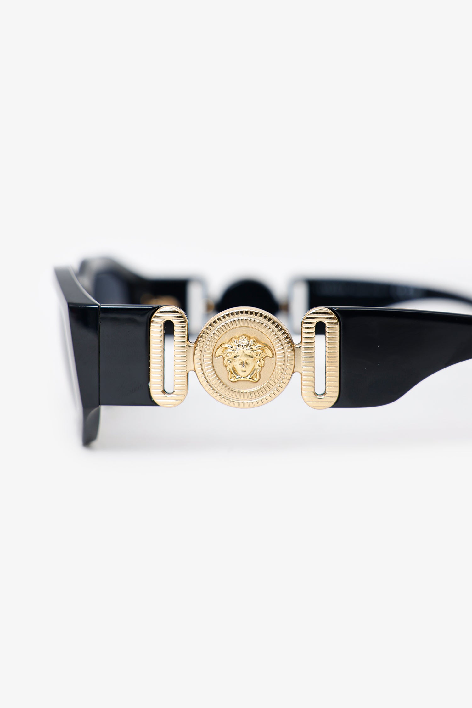 Refresh availabilityVersace Black Frame Medusa Sunglasses. Built-in nose pads. Gold-tone hardware.