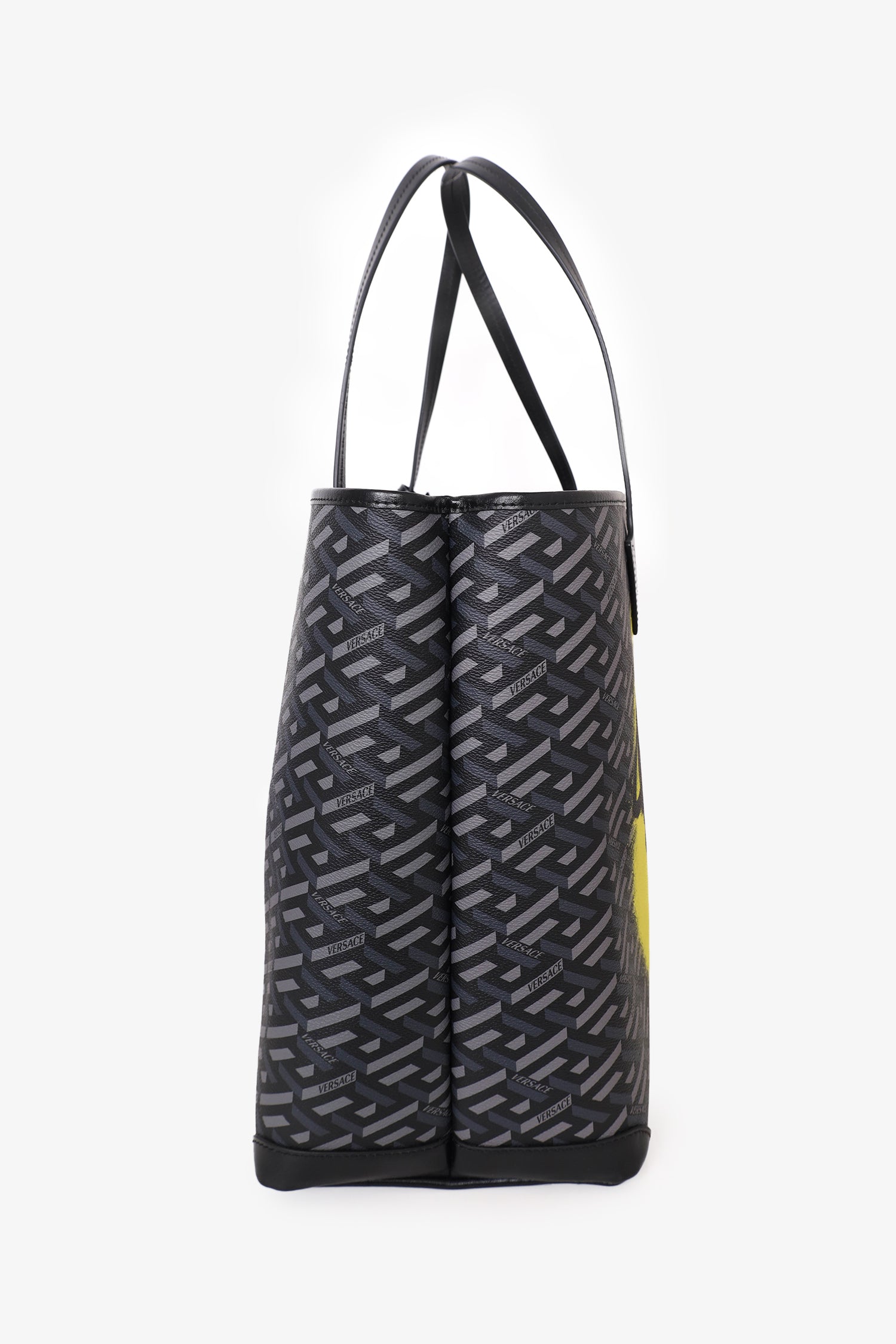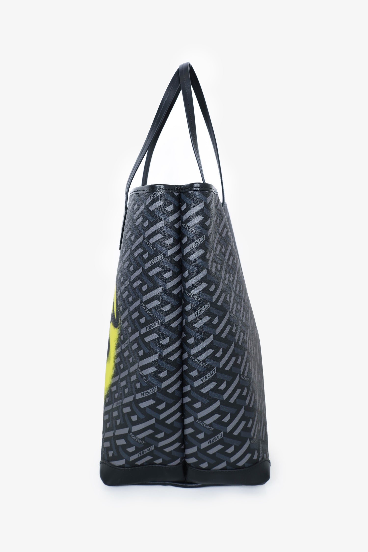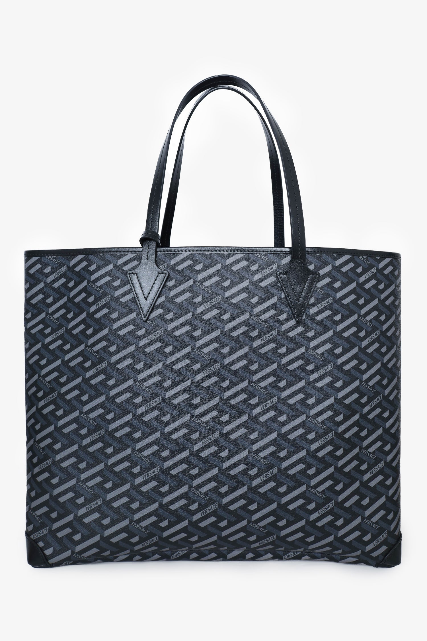 Refresh availabilityVersace Black/Grey La Greca Large Tote Bag. Open compartment. Interior snap button closure. Tonal stitching.