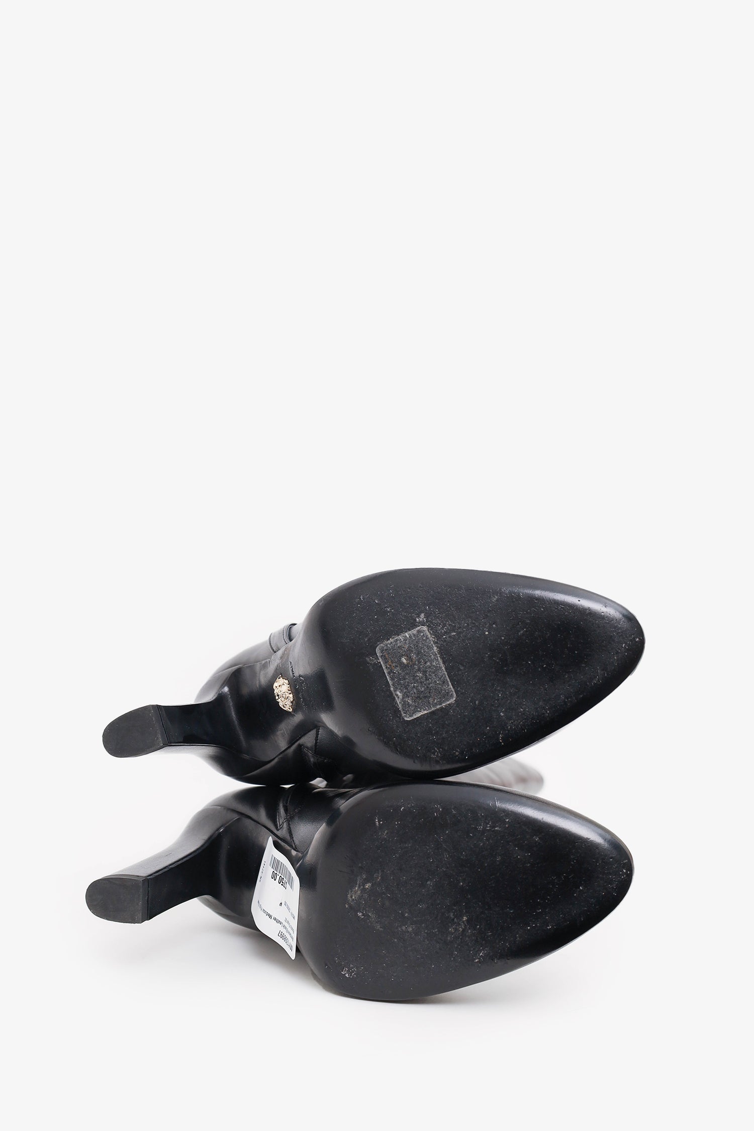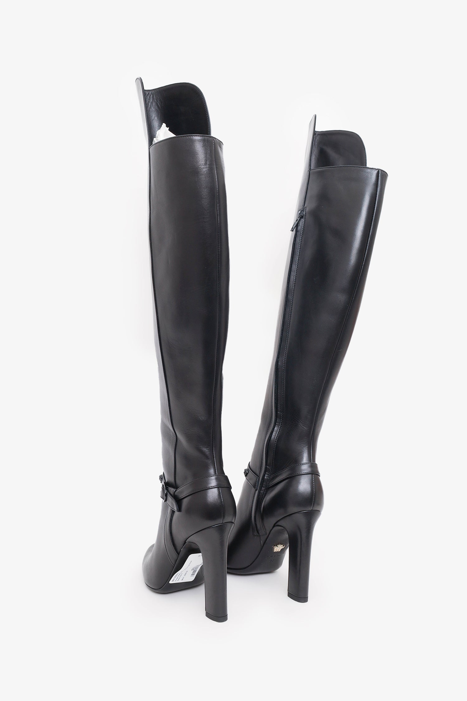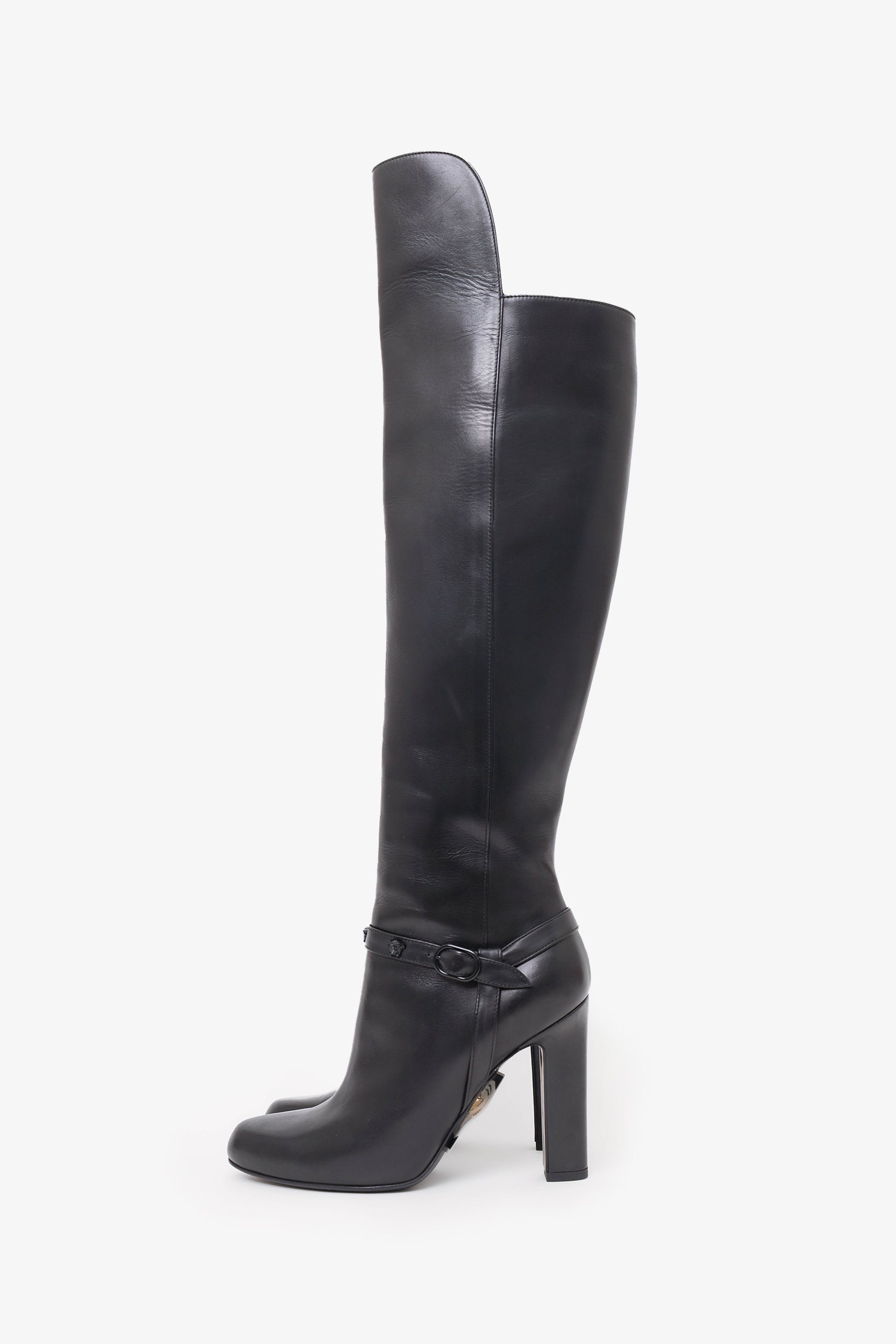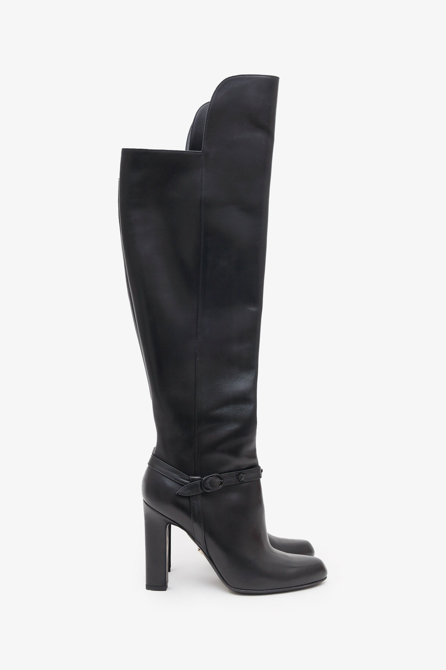 Refresh availabilityVersace Black Leather Medusa High Knee Boots. Round toe. Block heel. Side zip closure. Tonal stitching.
