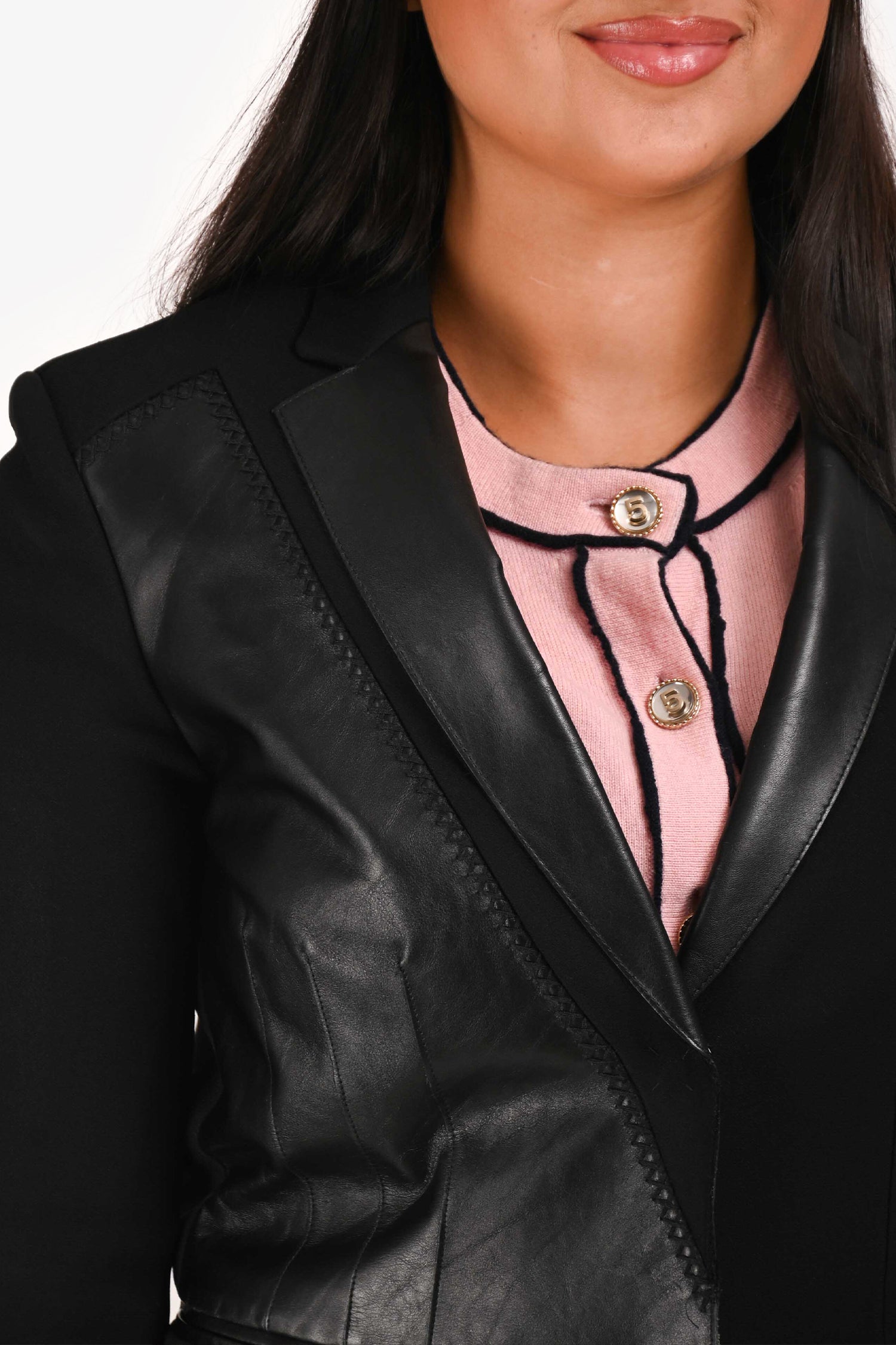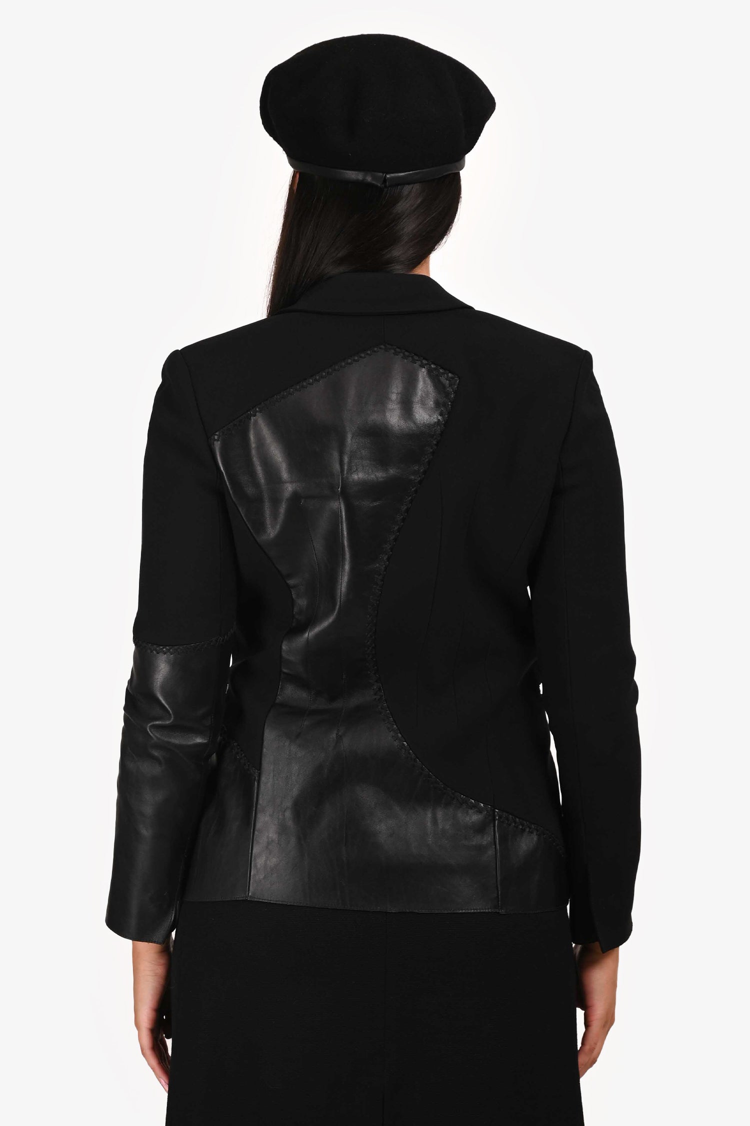 Refresh availabilityVersace Black Leather Patchwork Single Breasted Blazer. Front snap button-up closure. V-neck. Lined. Front pockets. Padded shoulders.