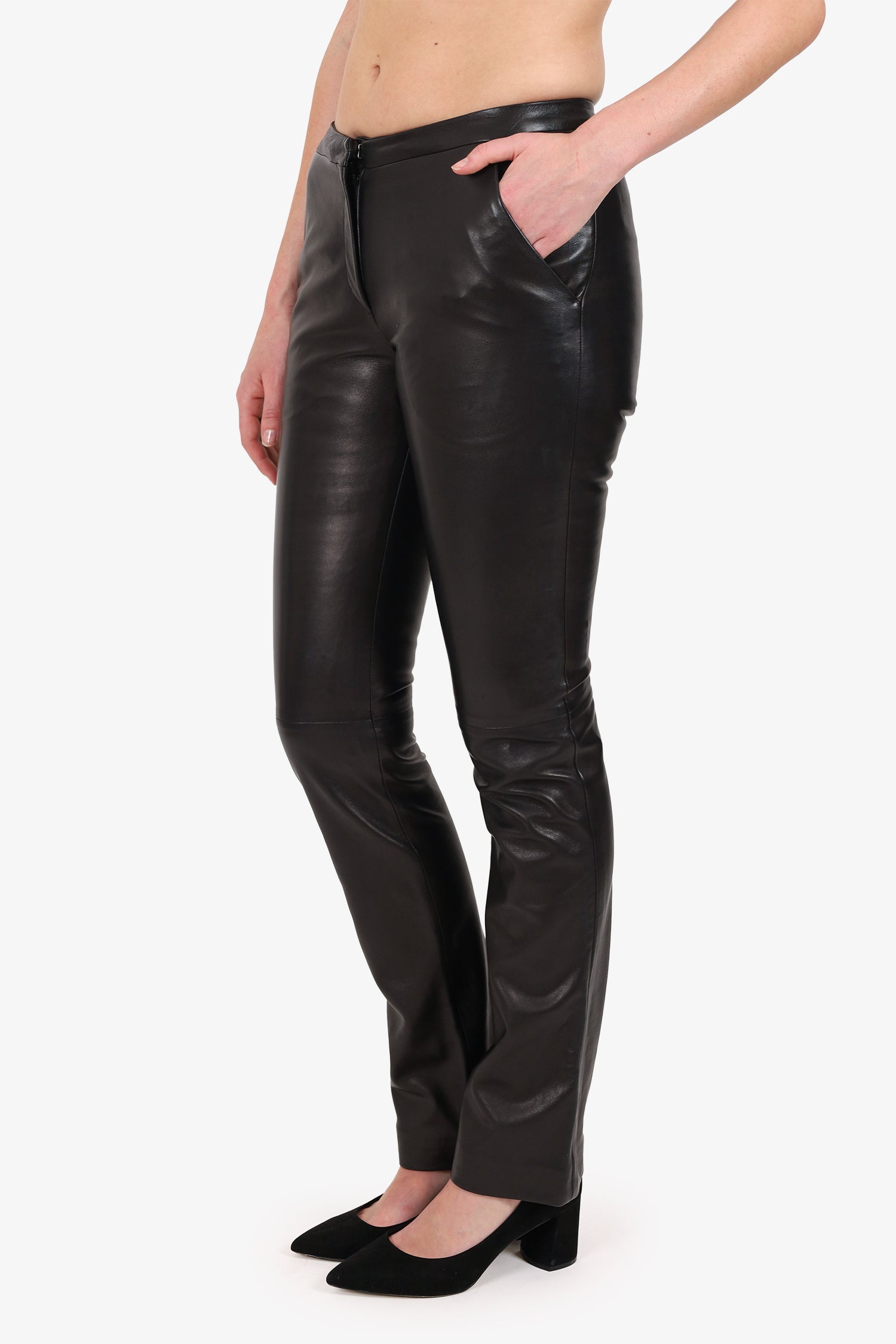 Refresh availabilityVersace Black Leather Straight Leg Pants. Slip-on. Front zip and clasp closure. 2 side exterior slip pockets. Lined interior. Tonal stitching.