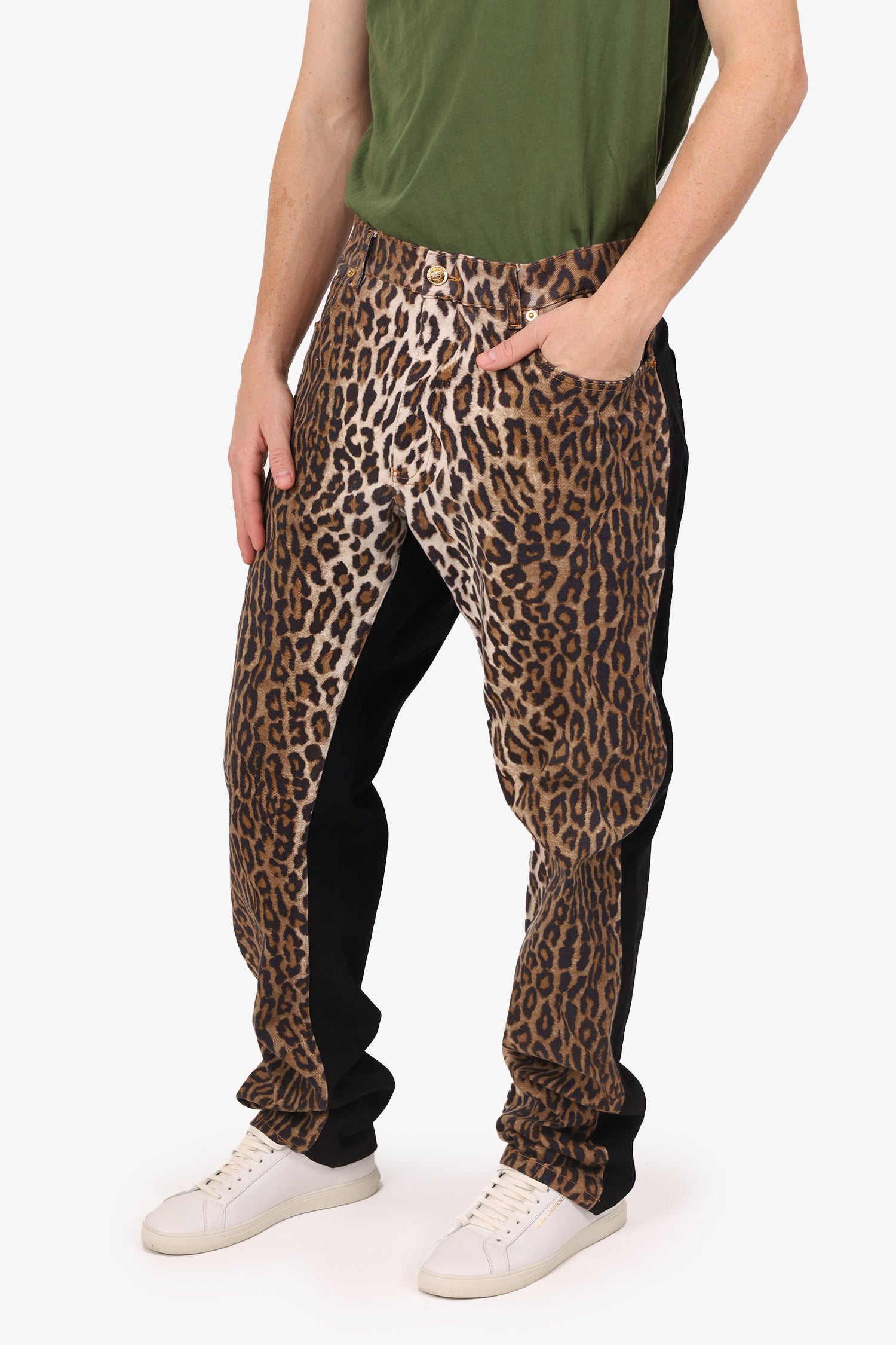 Refresh availabilityVersace Black Leopard Print Denim Straight Leg Jeans. Slip on. Front zip with button-up closure. Waistband belt-loops. 5 exterior pockets; 2 front slip, 1 mini compartment, and 2 rear slip. Gold-tone hardware. Tonal stitching.
