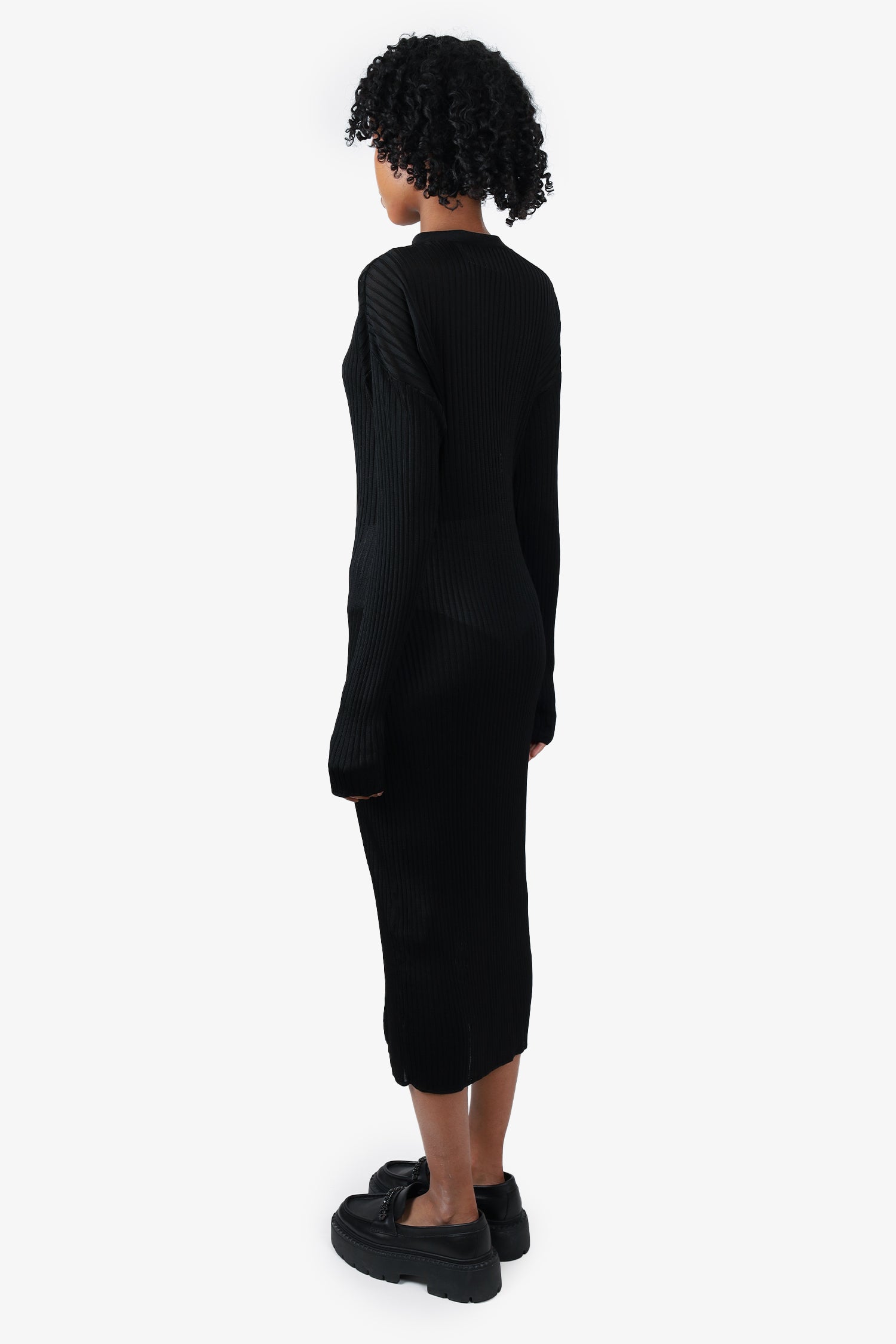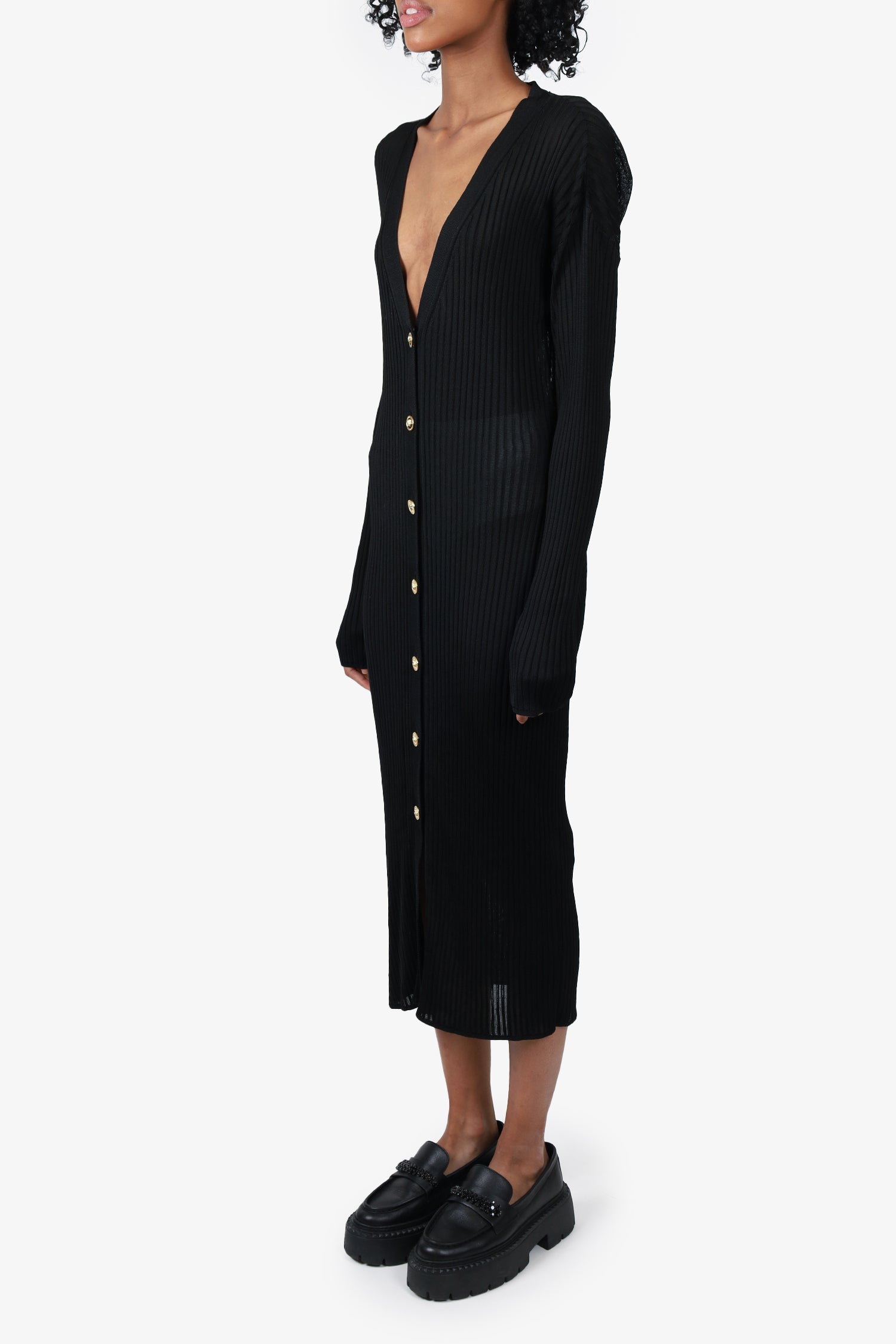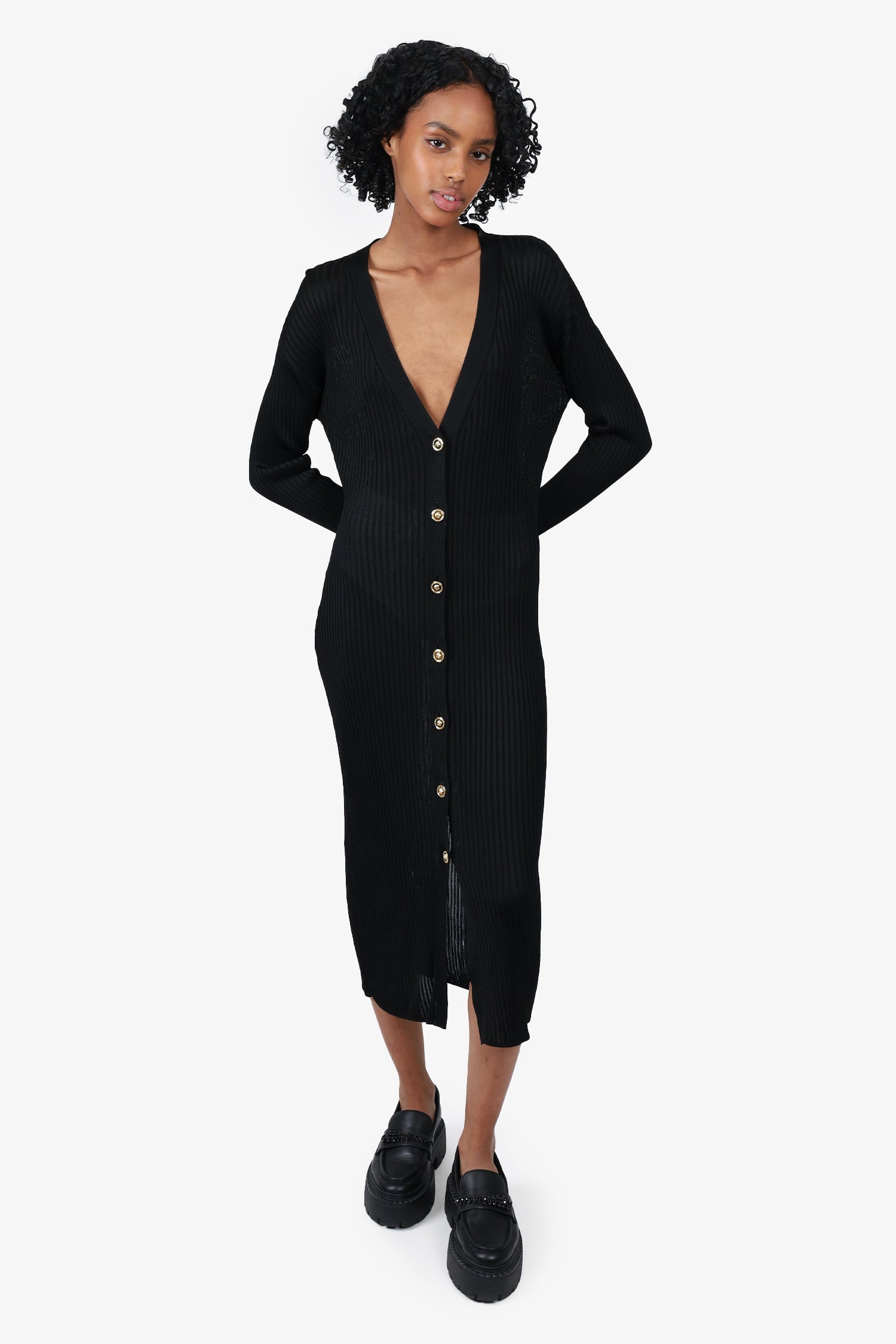 Refresh availabilityVersace Black Ribbed Button Up Dress. Plunging V neckline. Front button closure. Gold hardware. Tonal stitching.