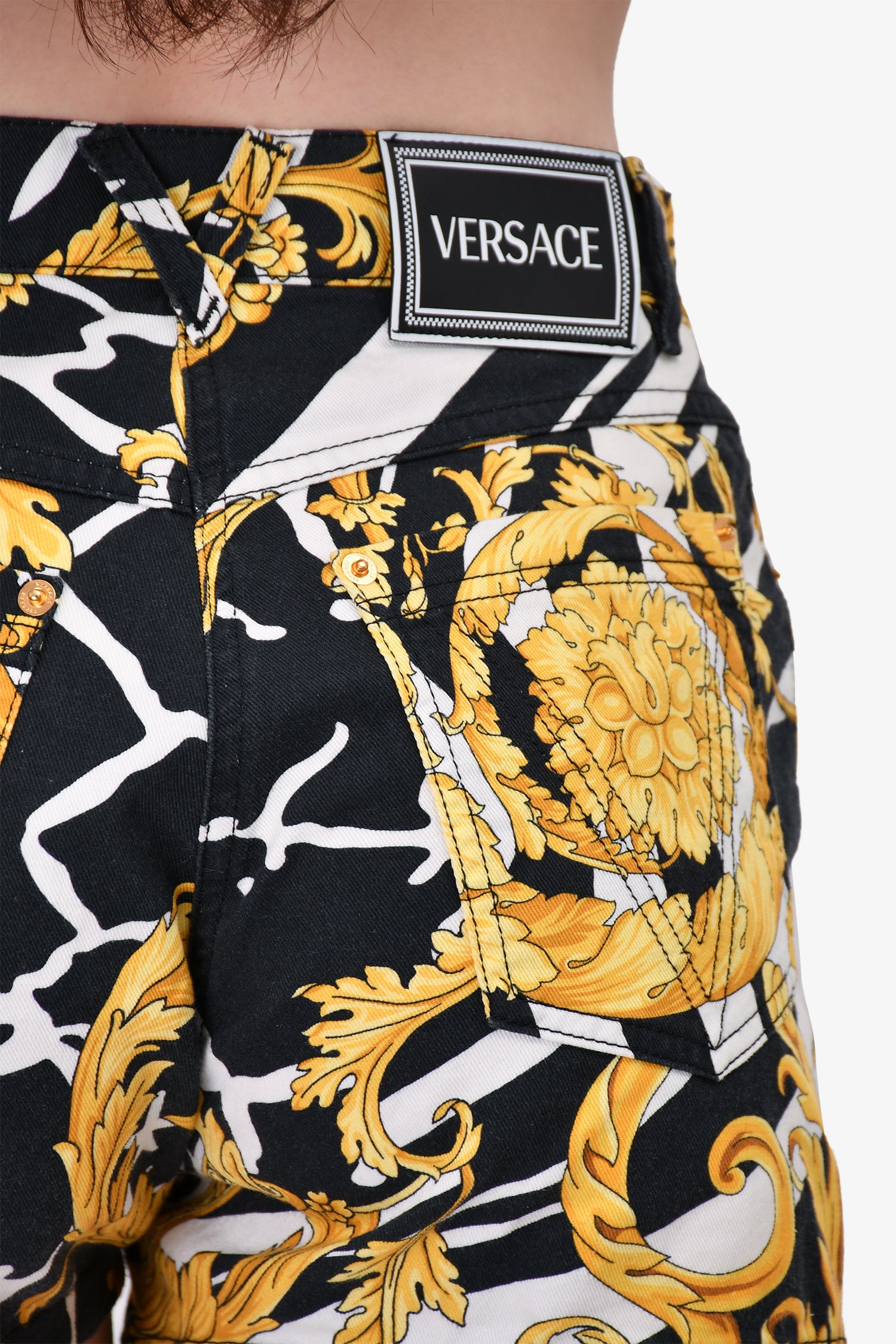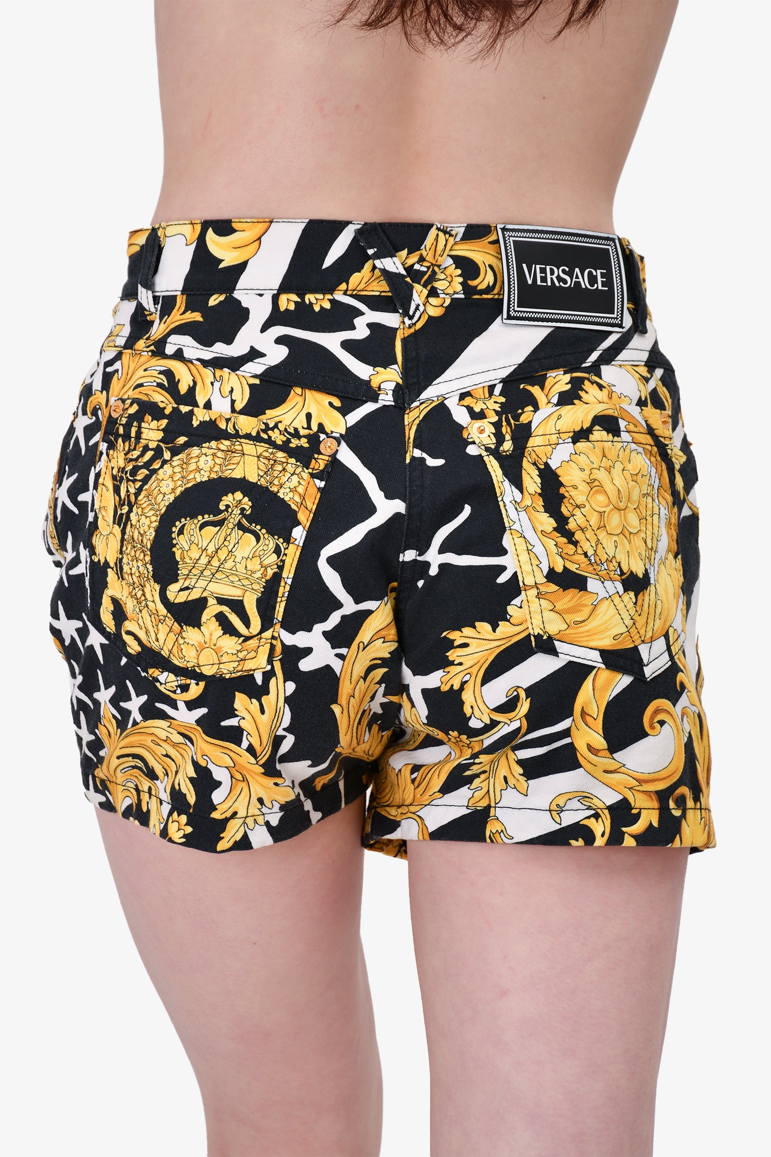 Refresh availabilityVersace Black/White/Yellow High Waisted Shorts. Front zip and button closure. Front and rear pockets. Waist belt loops. Tonal stitching.