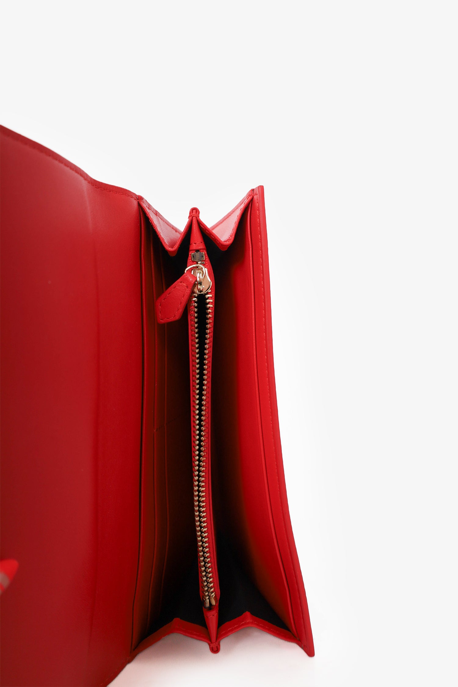 Refresh availabilityVersace Blue/Red Grained Calfskin Medusa Continental Wallet. Snap button closure. 1 interior pocket with zip closure. 2 wide slip pockets. 4 card slip pockets. Tonal stitching.