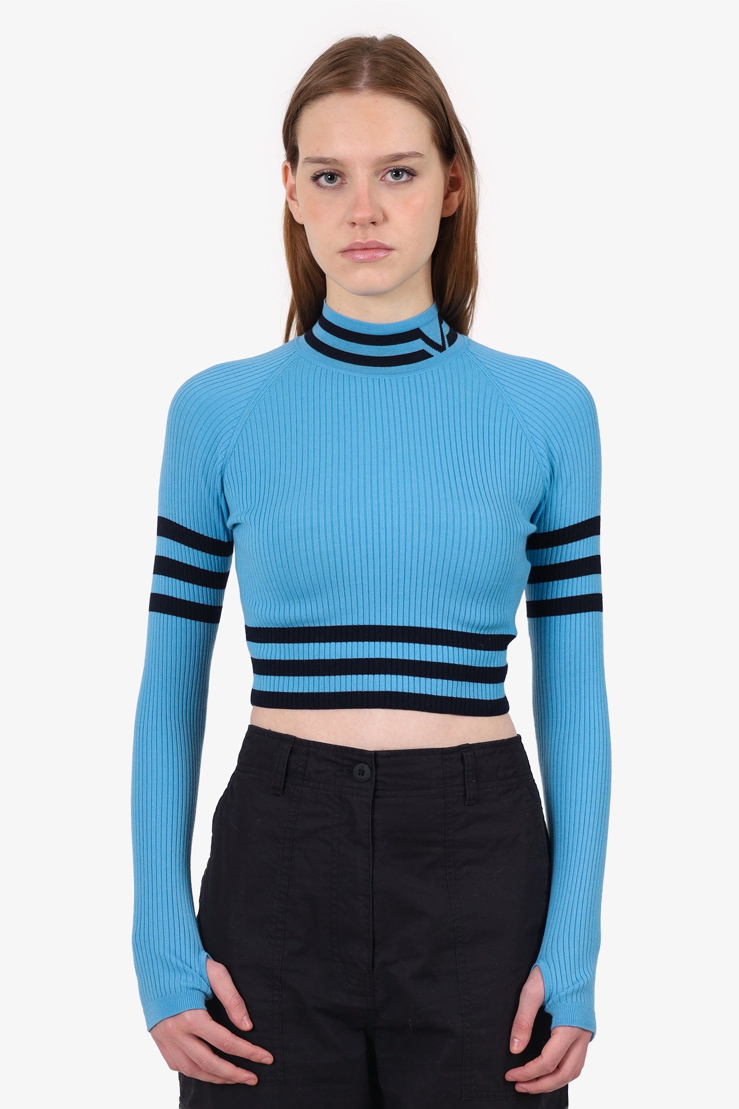 Refresh availabilityVersace Blue/Black Ribbed Knit Long Sleeve Crop Top. Slip-on. Mock neckline. Thumbholes on sleeve cuffs. Tonal stitching.