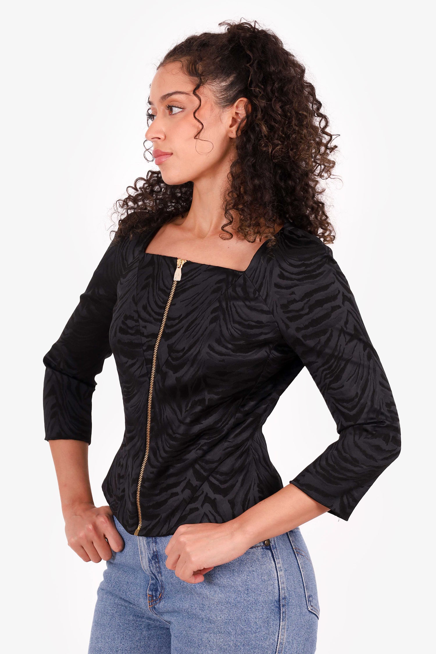 Refresh availabilityVersace Collection Black Zebra Zip-Up Jacket. Pull-on. Square neckline. Gold-tone hardware. Tonal stitching.