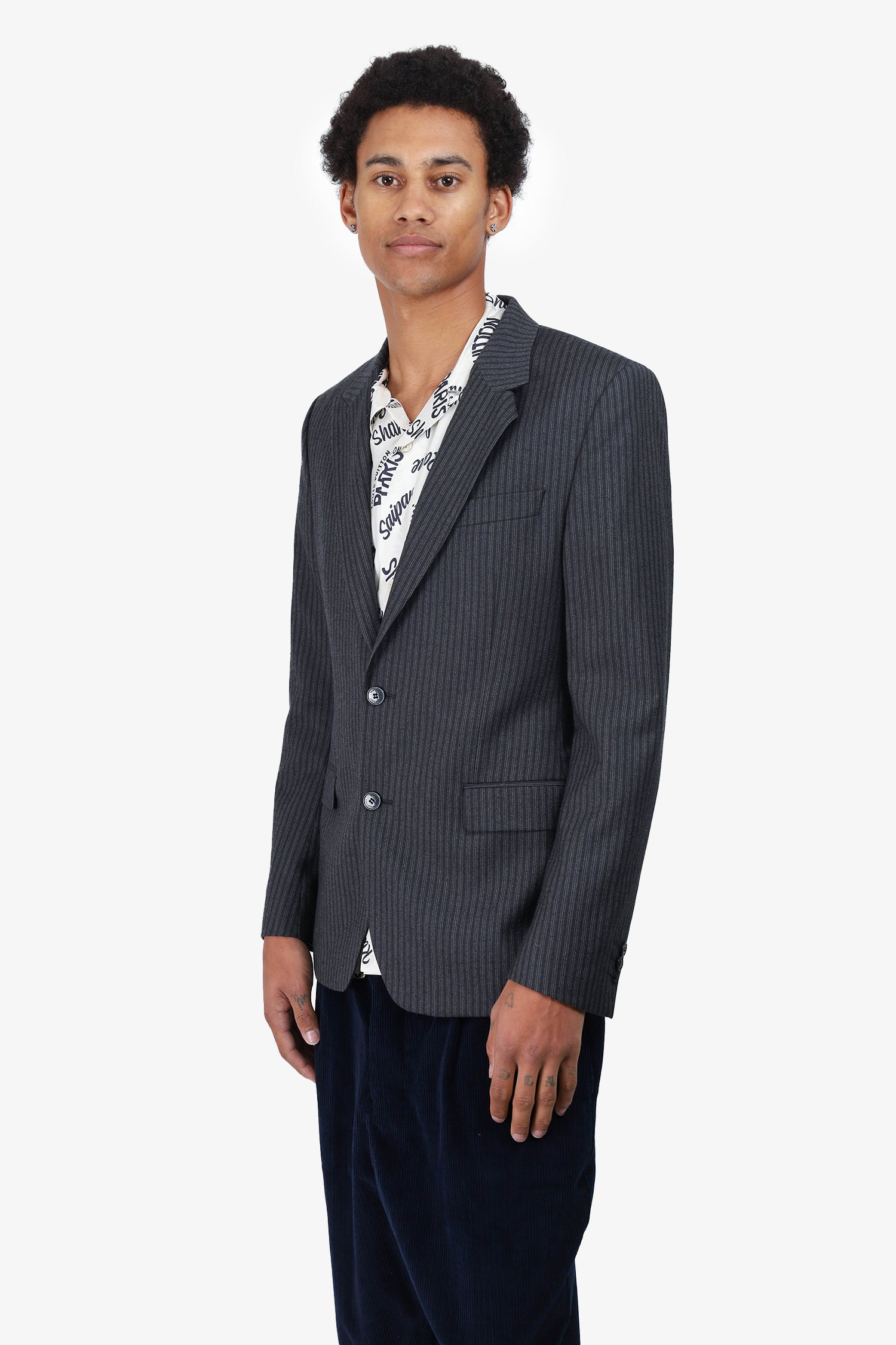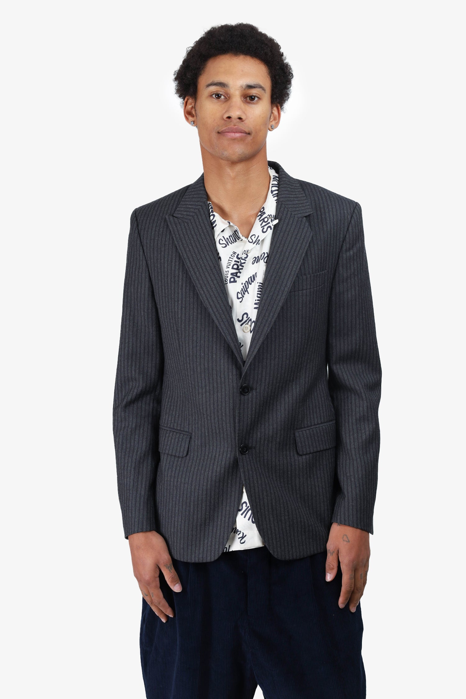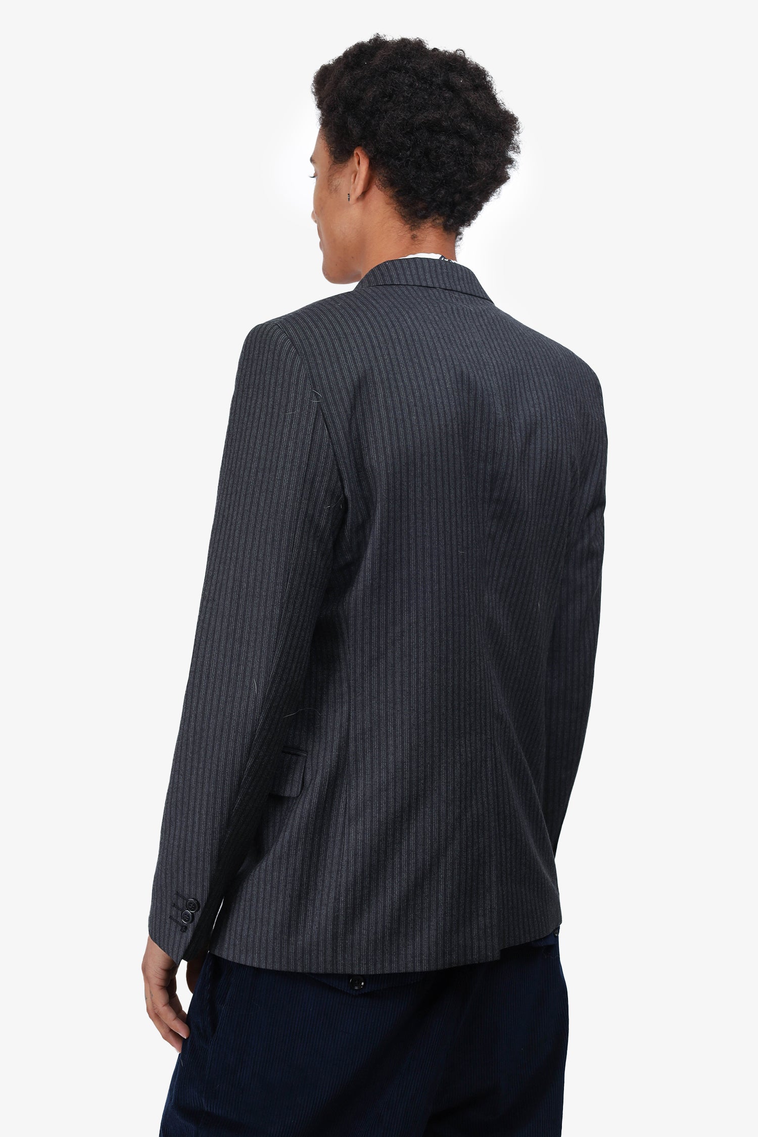 Refresh availabilityVersace Collection Grey Wool Striped Blazer. Double front button-up. 3 exterior front slip pockets. 3 interior slip pockets. Lined. Tonal stitching.