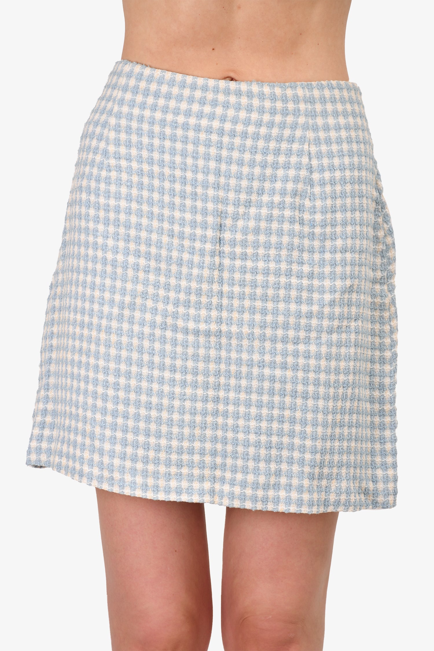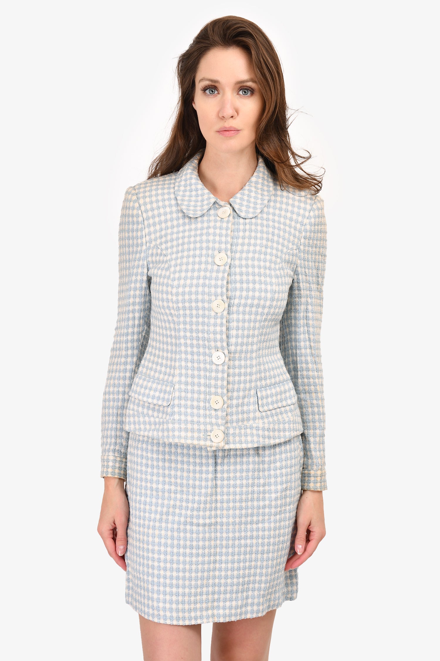 Refresh availabilityVersace Couture Blue/Cream Tweed Jacket/Skirt Set. Jacket: Front button-up closure. Padded shoulders. Skirt: Rear zip closure. Lined.
