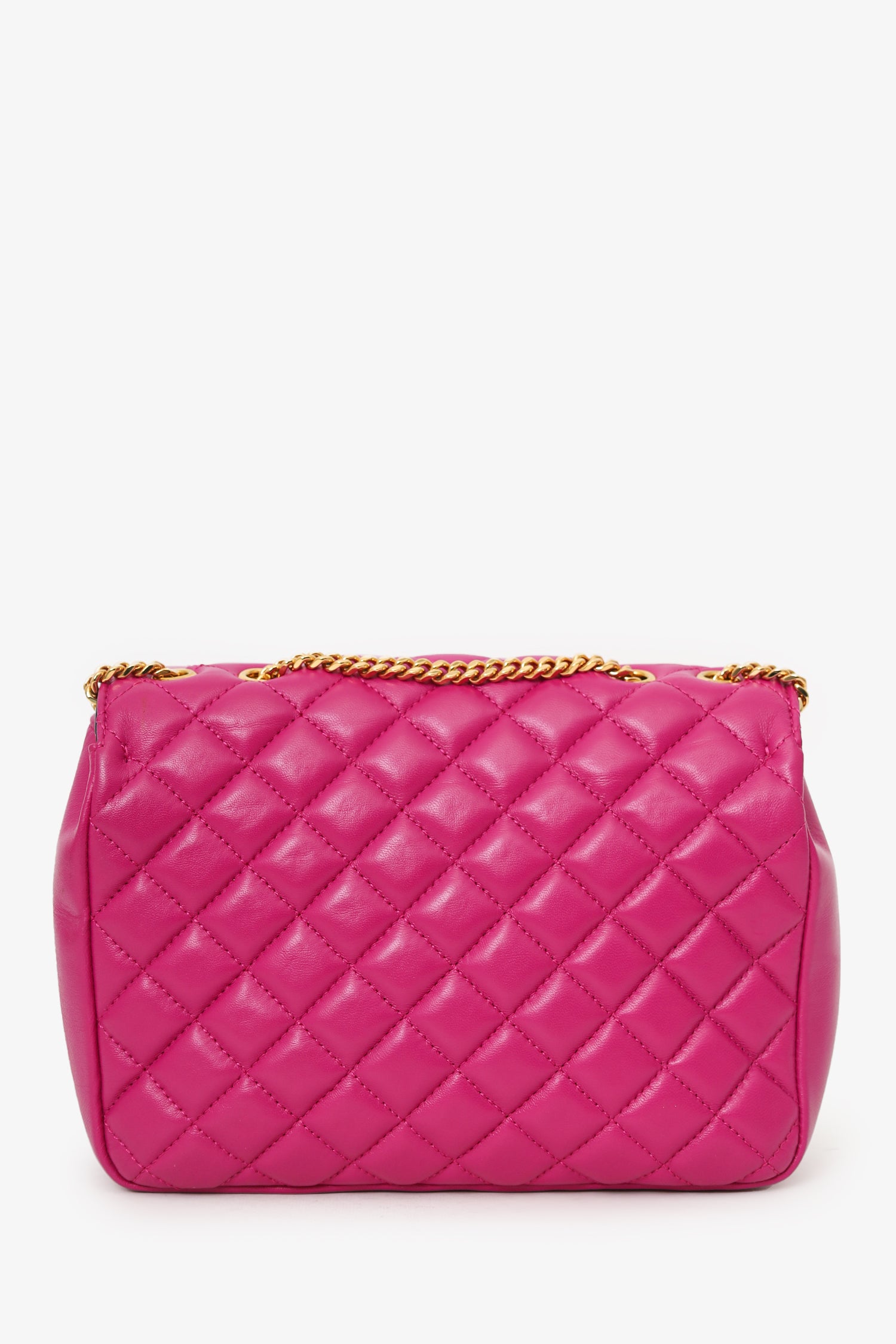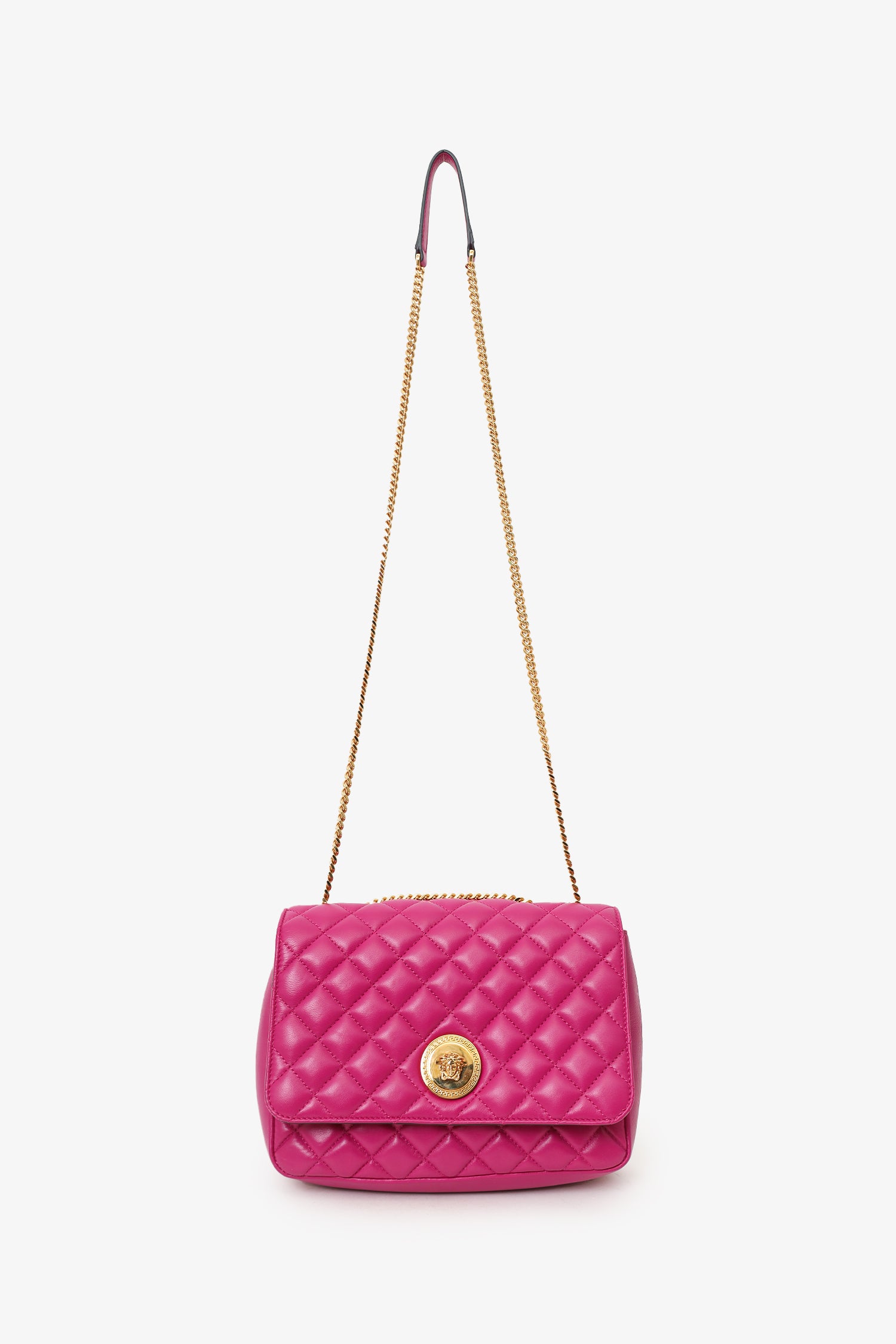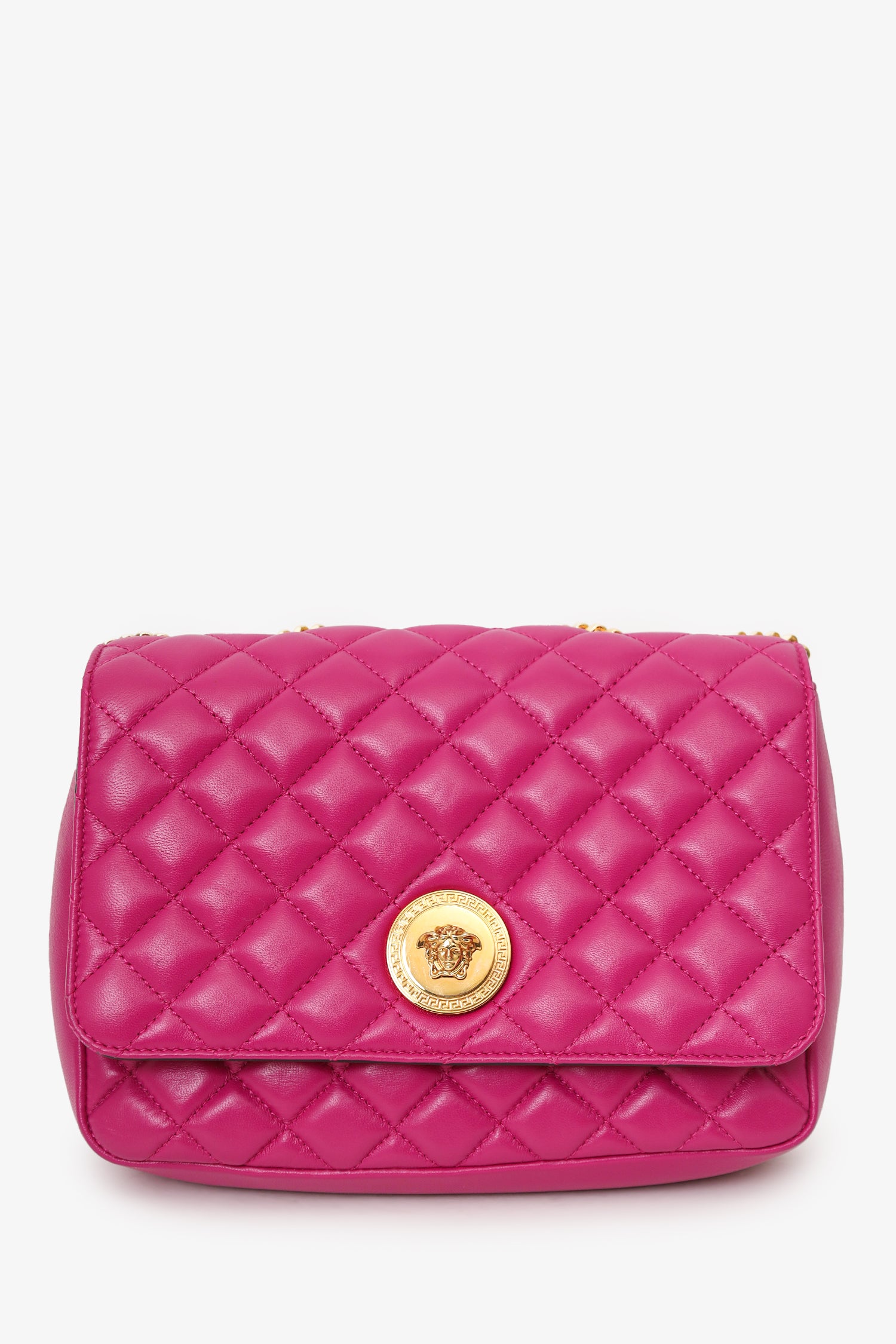 Refresh availabilityVersace Fuchsia Nappa Quilted Leather Medusa Chain Bag. Front fold-over flap with magnetic closure. Twin chainlink straps that can be pulled into one long strap. Lined interior. Single interior slip pocket. Gold-tone hardware. Tonal stitching.