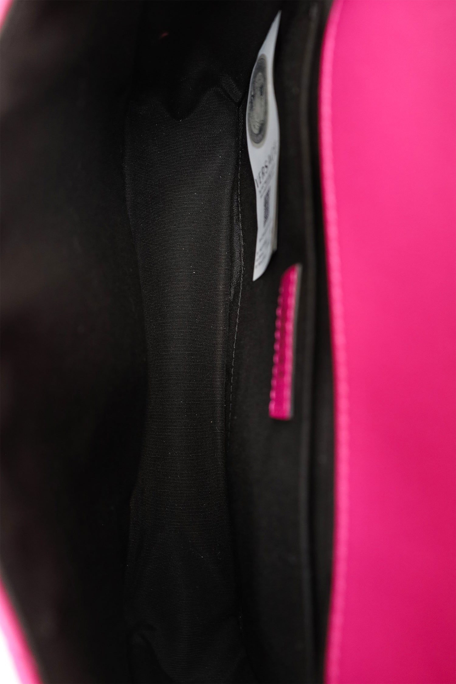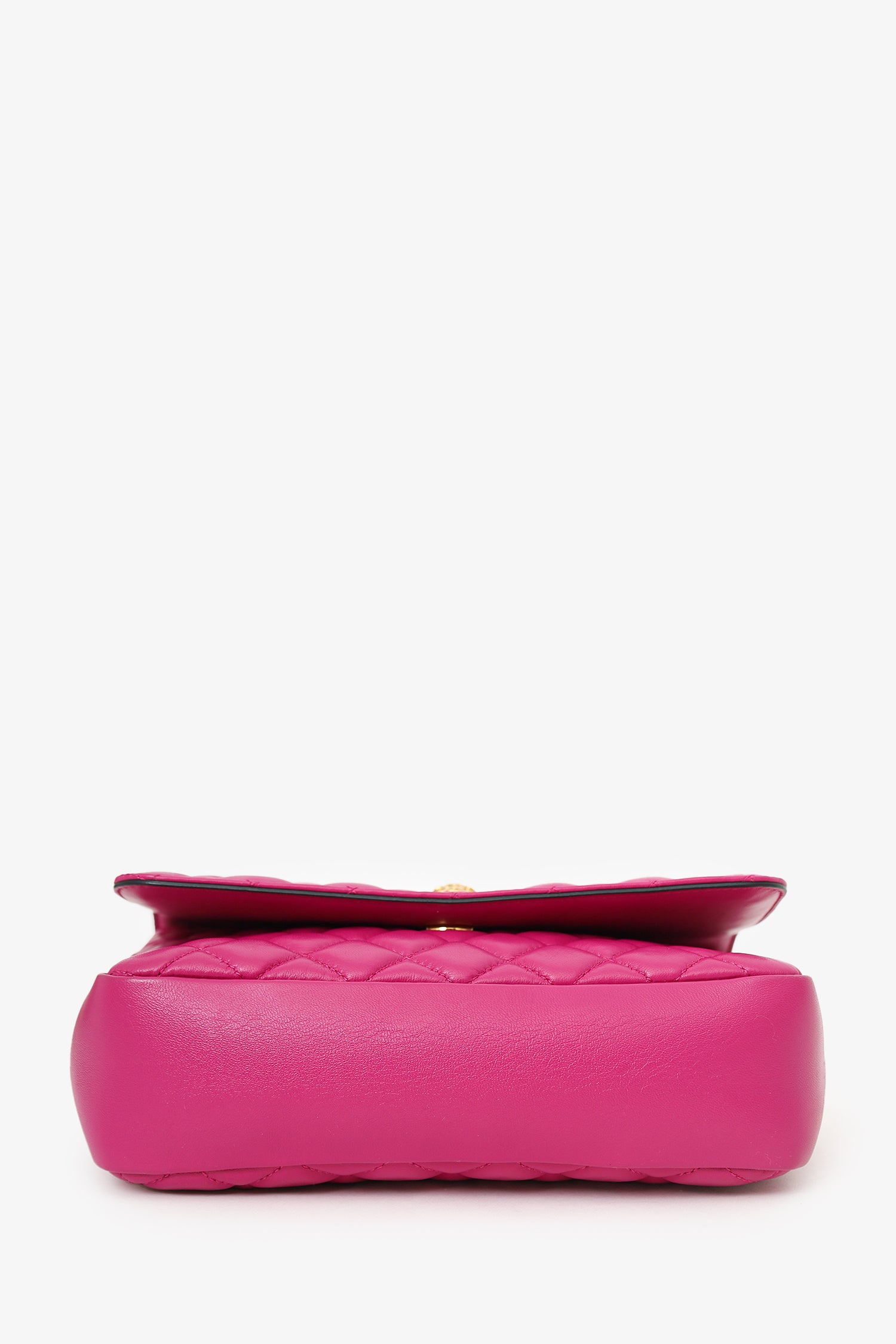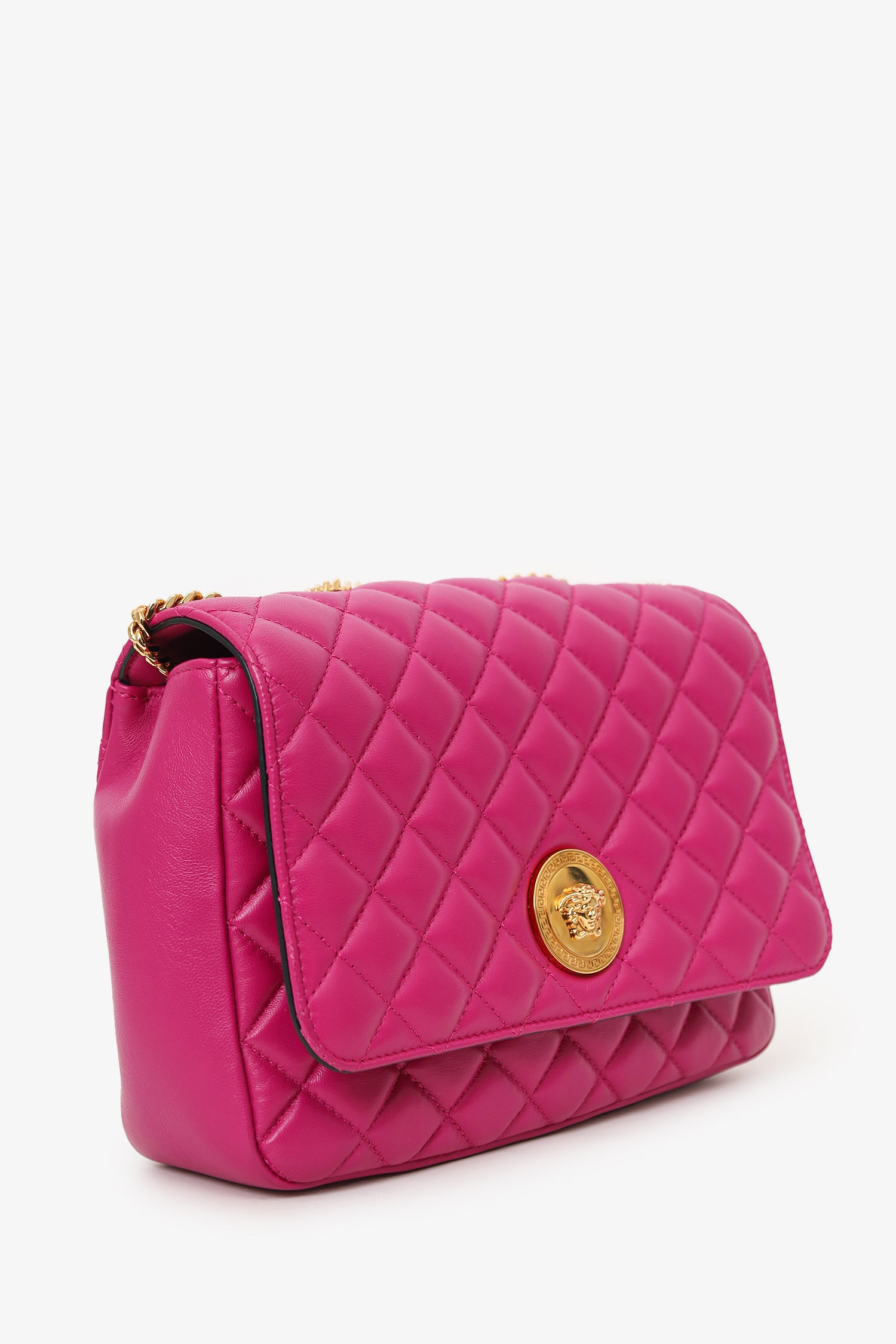 Refresh availabilityVersace Fuchsia Nappa Quilted Leather Medusa Chain Bag. Front fold-over flap with magnetic closure. Twin chainlink straps that can be pulled into one long strap. Lined interior. Single interior slip pocket. Gold-tone hardware. Tonal stitching.