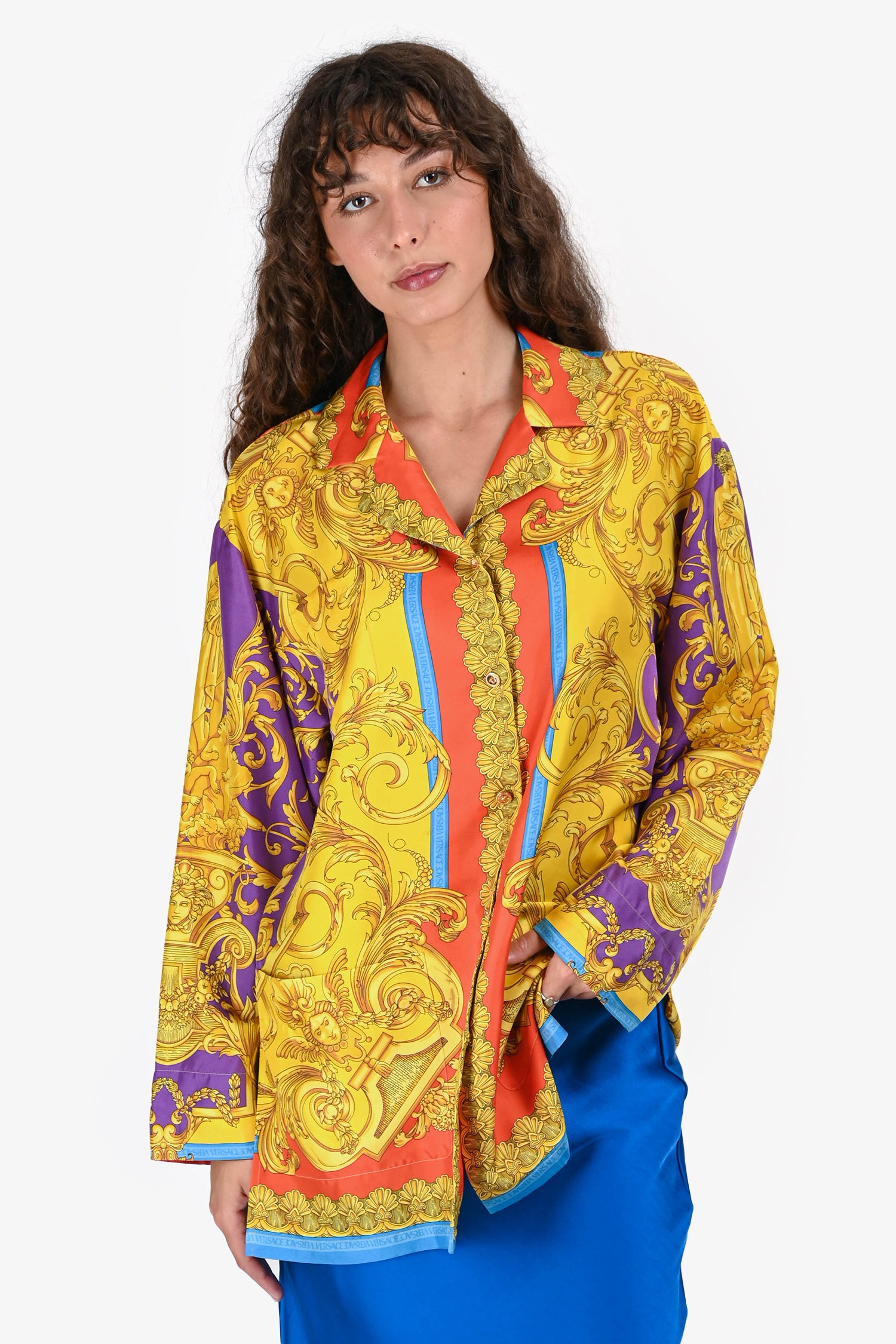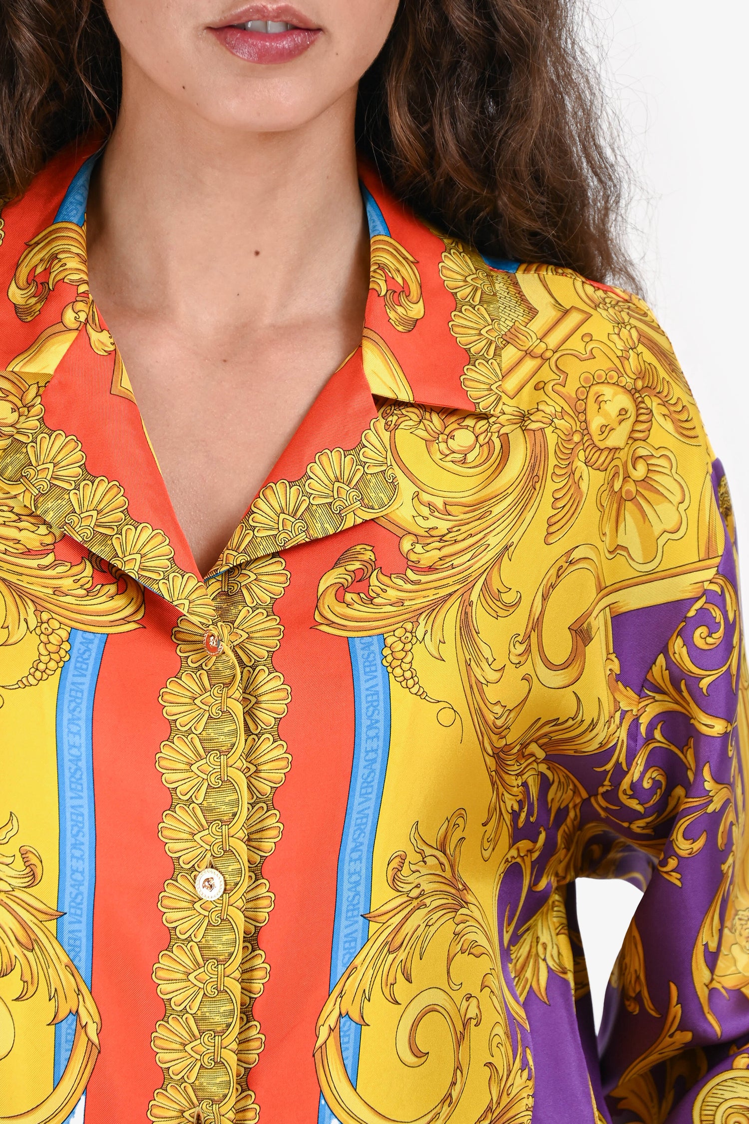 Refresh availabilityVersace Gold/Purple Printed Button Down Shirt. Classic point collar. Front button closure. Long sleeves. Two front slip pockets. Tonal stitching.