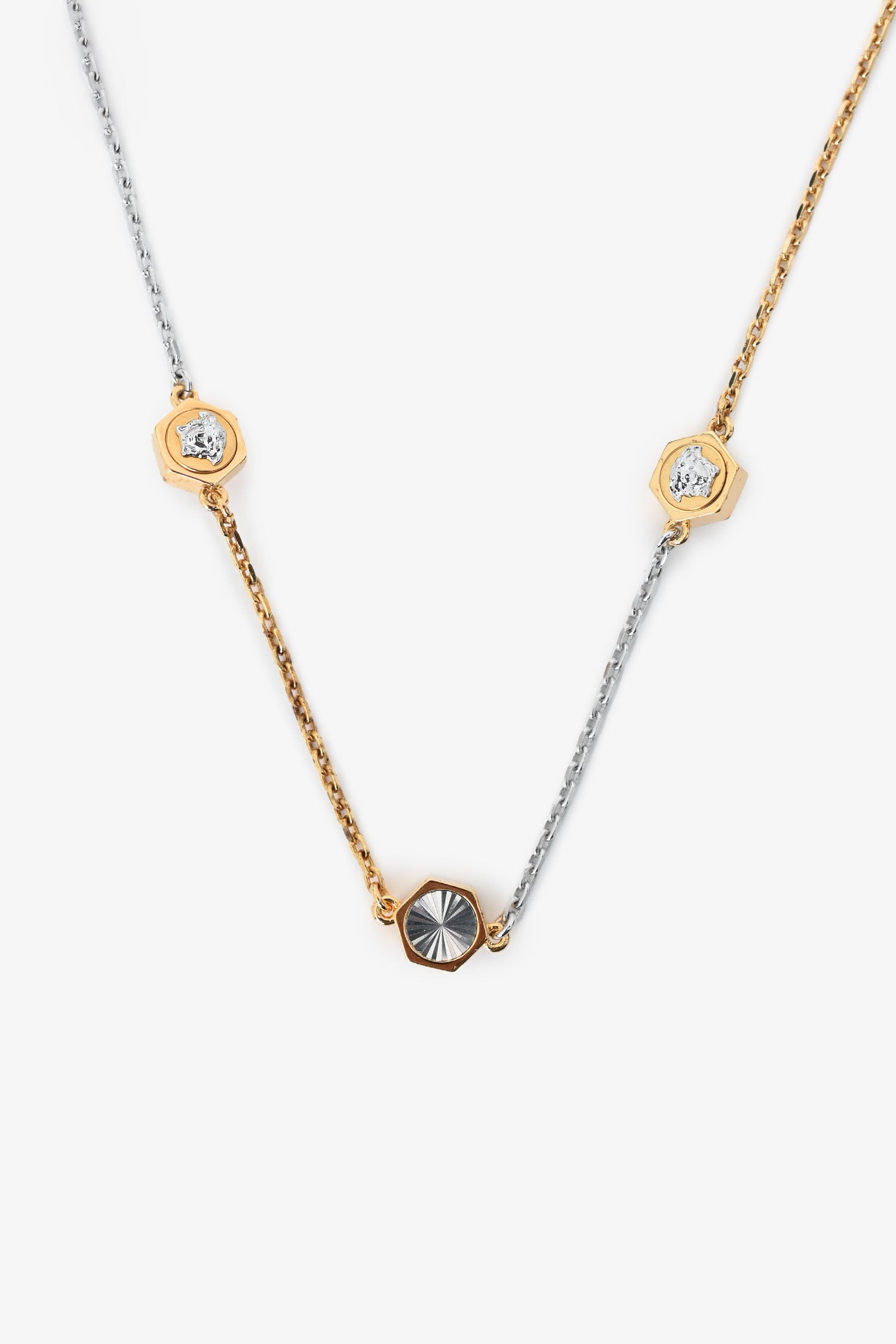 Refresh availabilityVersace Gold/Silver Tone Dik Medusa Necklace. Adjustable lobster clasp. Gold and silver-tone hardware.