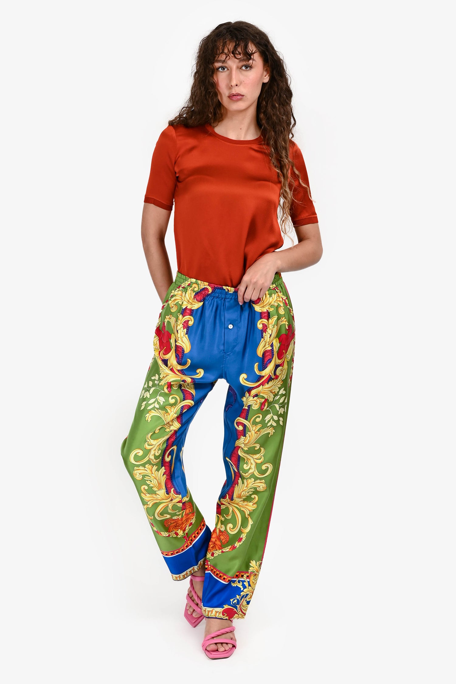 Refresh availabilityVersace Green/Multi Silk Printed Wide Leg Trousers. Elastic waistband. Unlined. Tonal stitching.