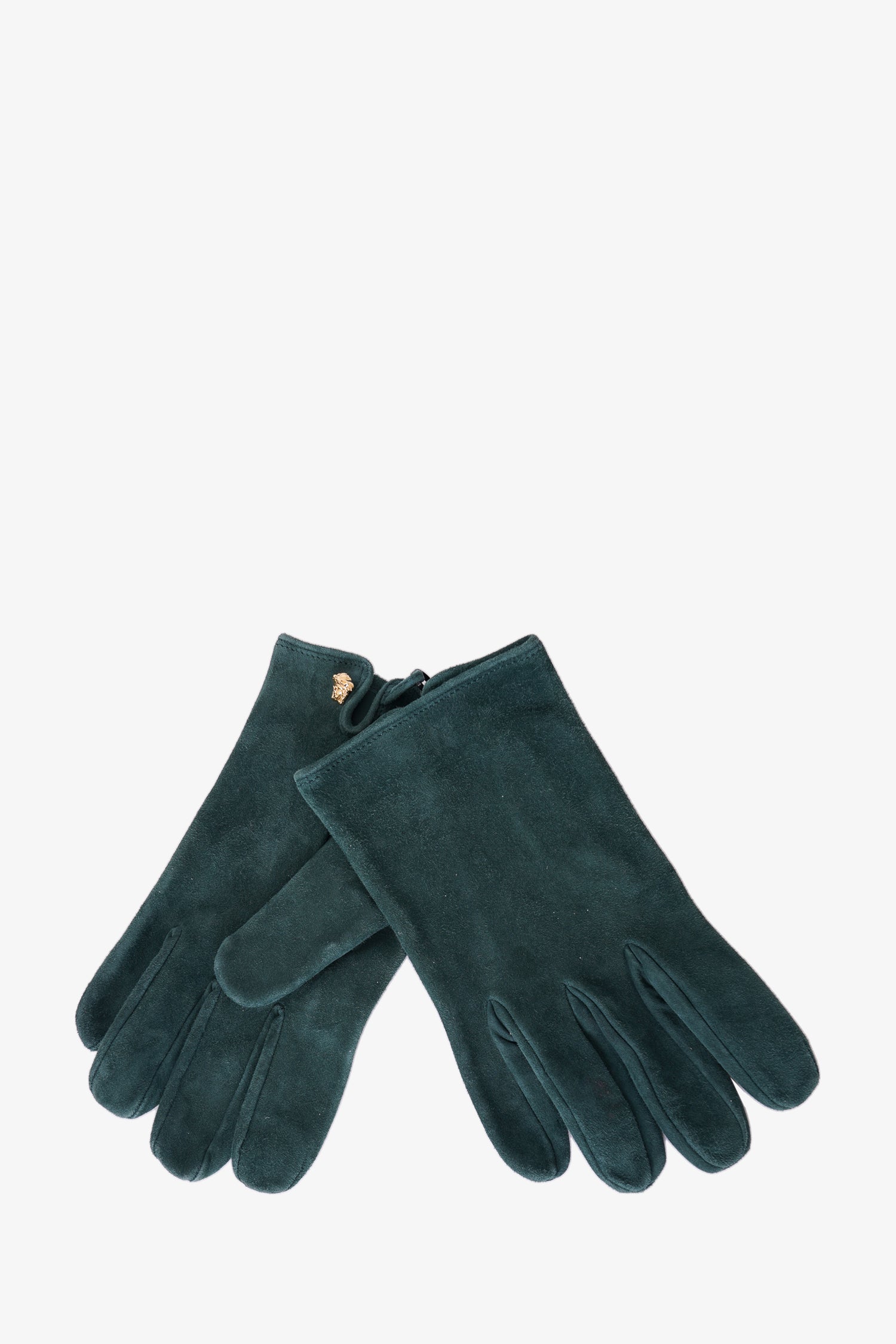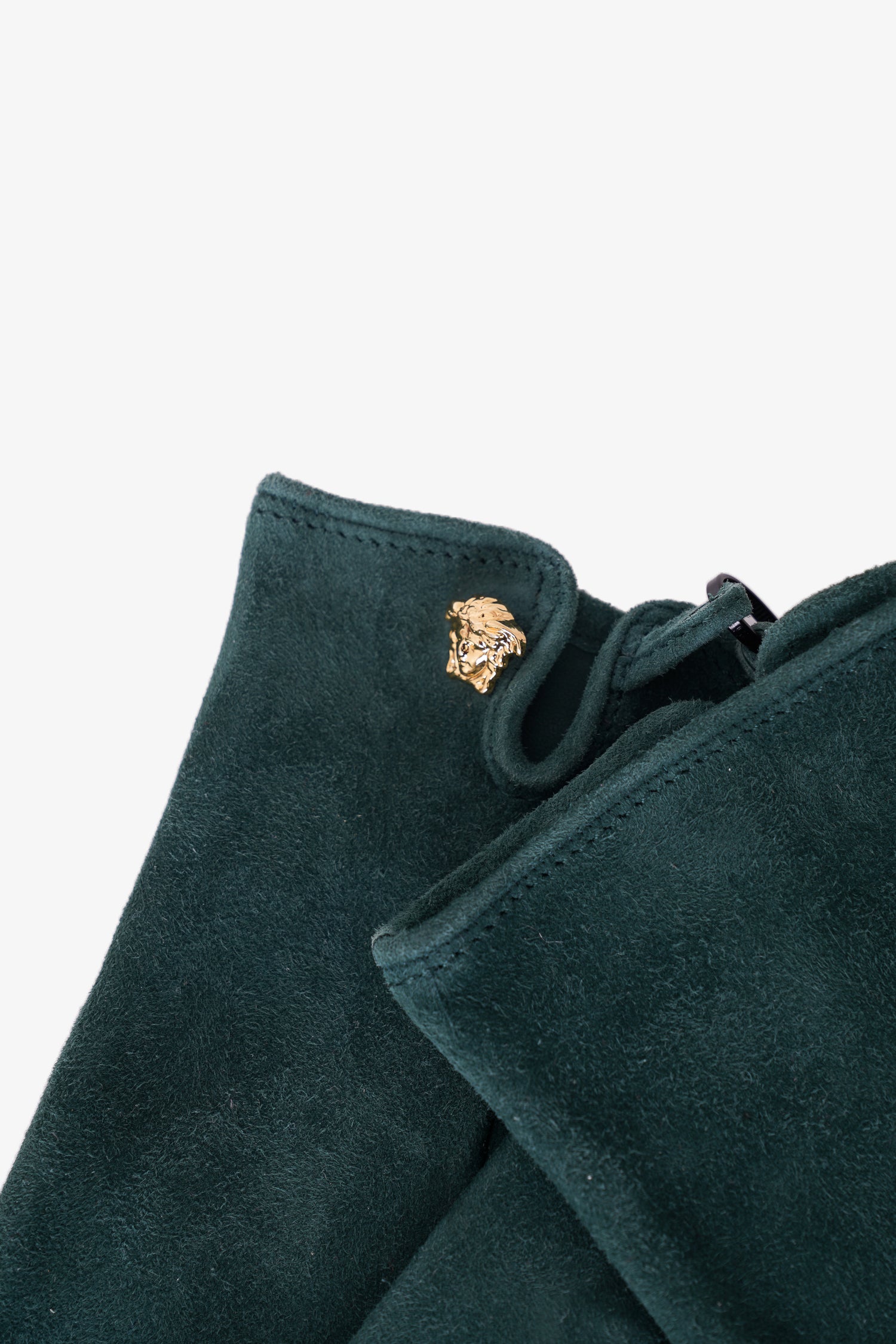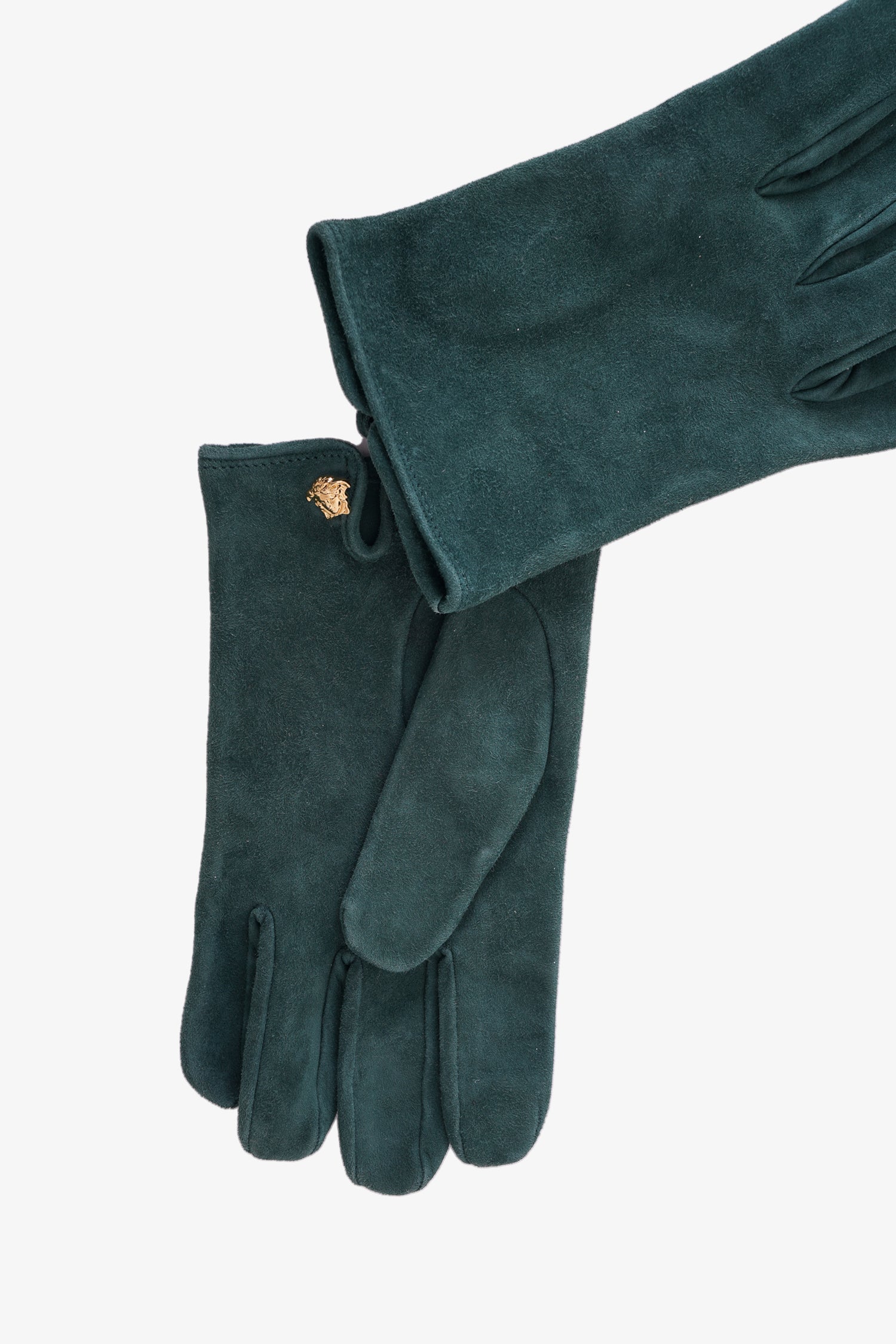 Refresh availabilityVersace Green Suede Gloves with Gold Logo. Zip closure. Tonal stitching.