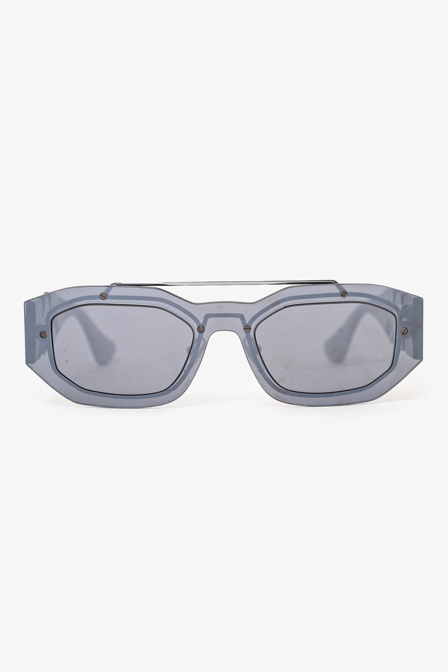 Refresh availabilityVersace Grey Frame Medusa Sunglasses. Adjustable nose-pads. Silver-tone hardware.