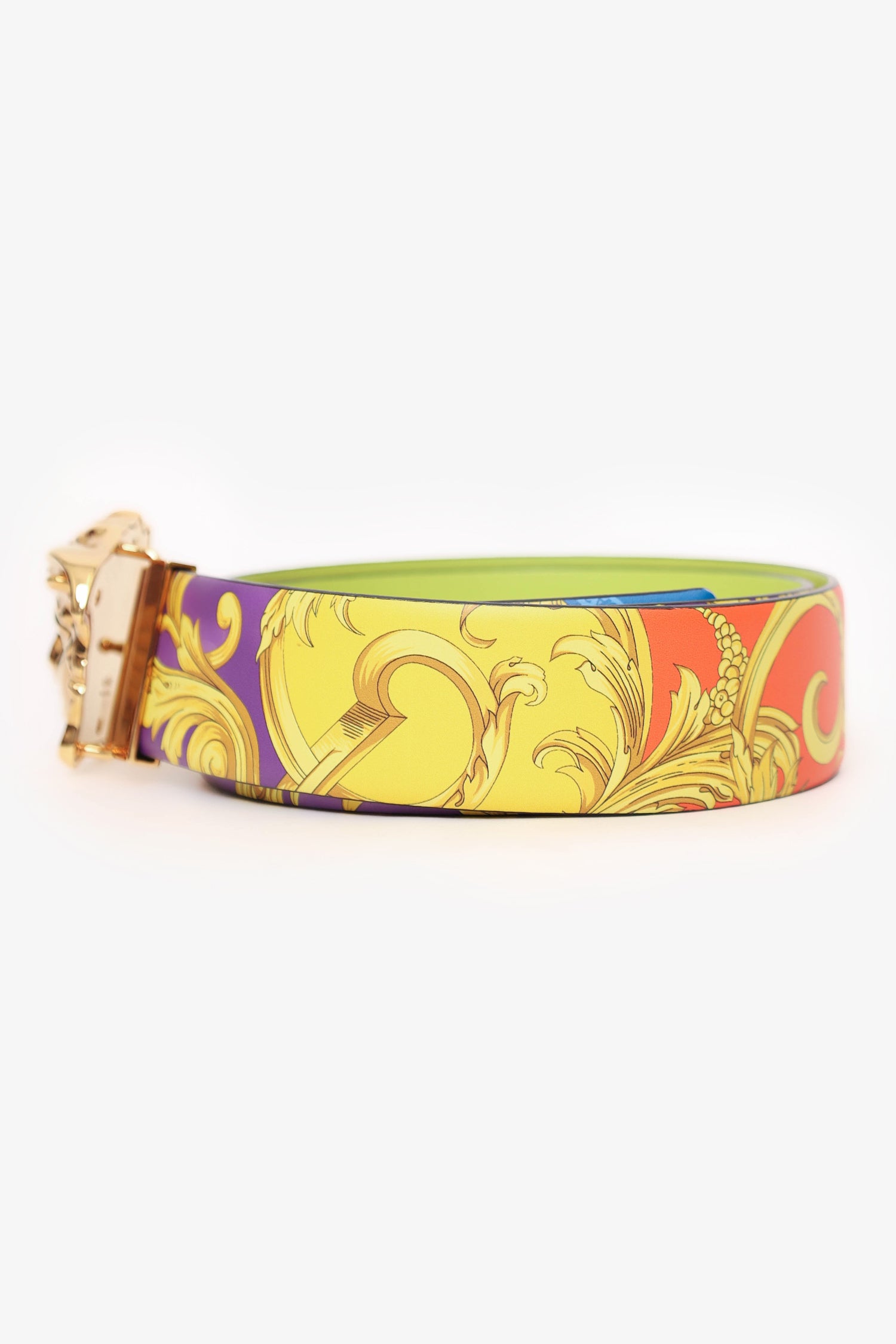 Refresh availabilityVersace Multicolour Leather Baroque Print Medusa Buckle Reversible Belt. Adjustable pull-through push-pin closure. Gold-tone hardware. Tonal stitching.