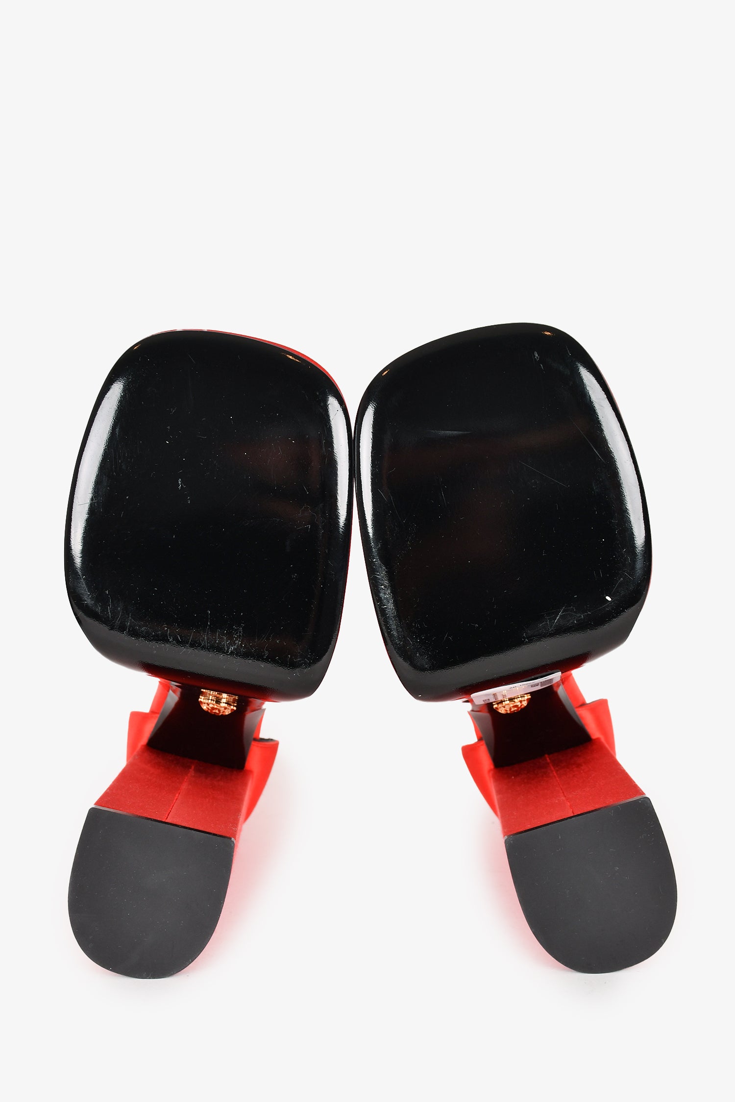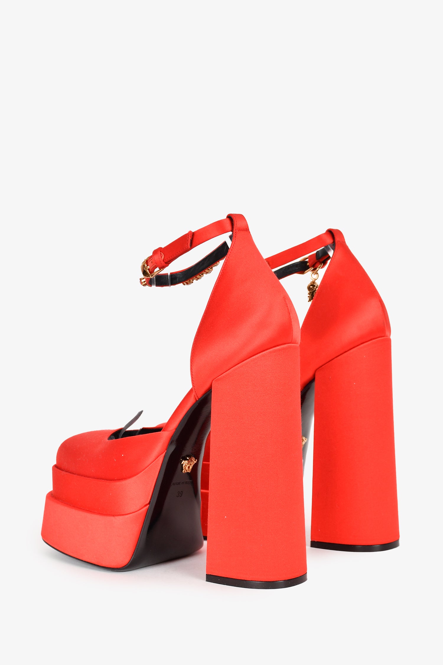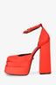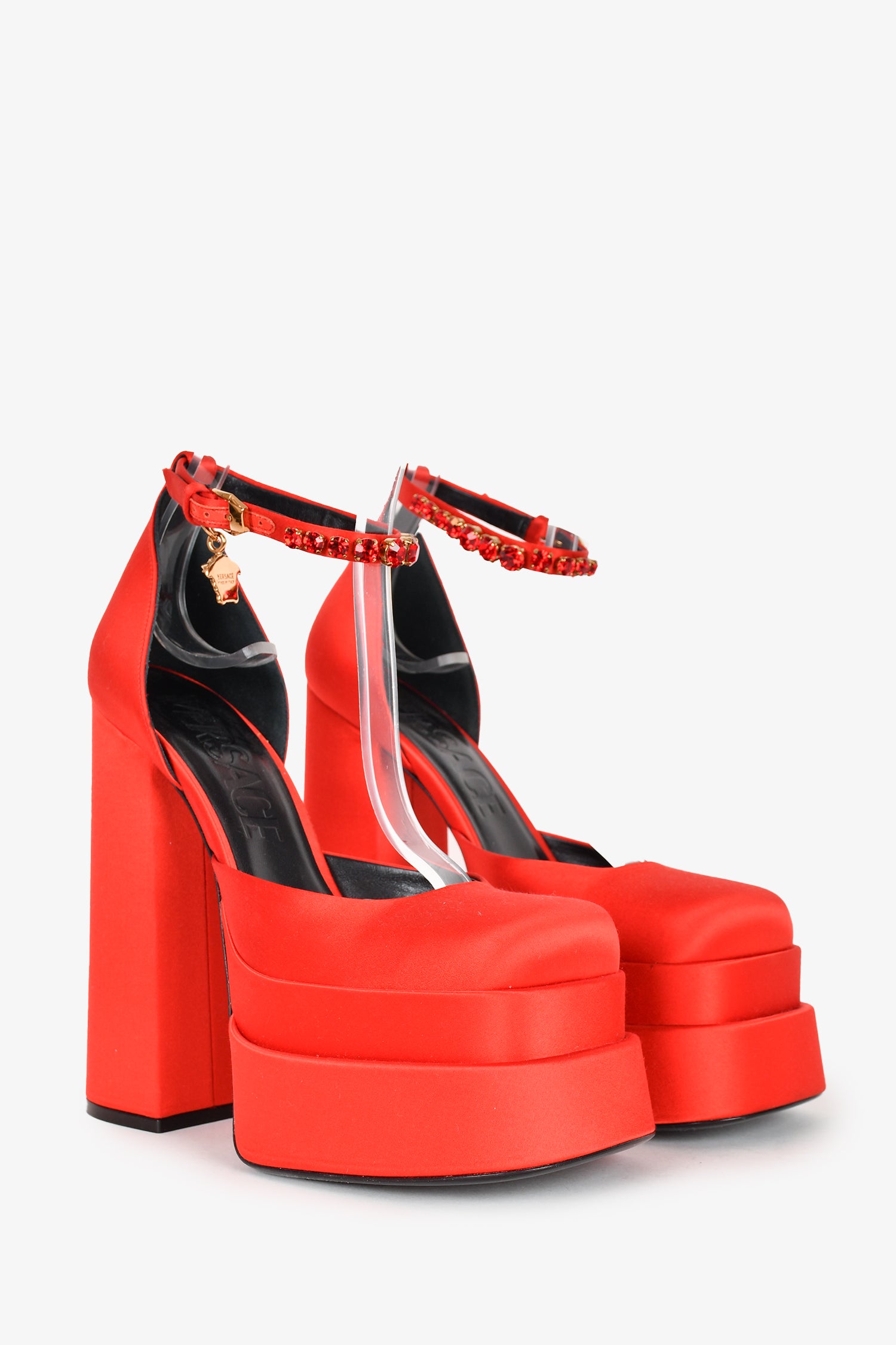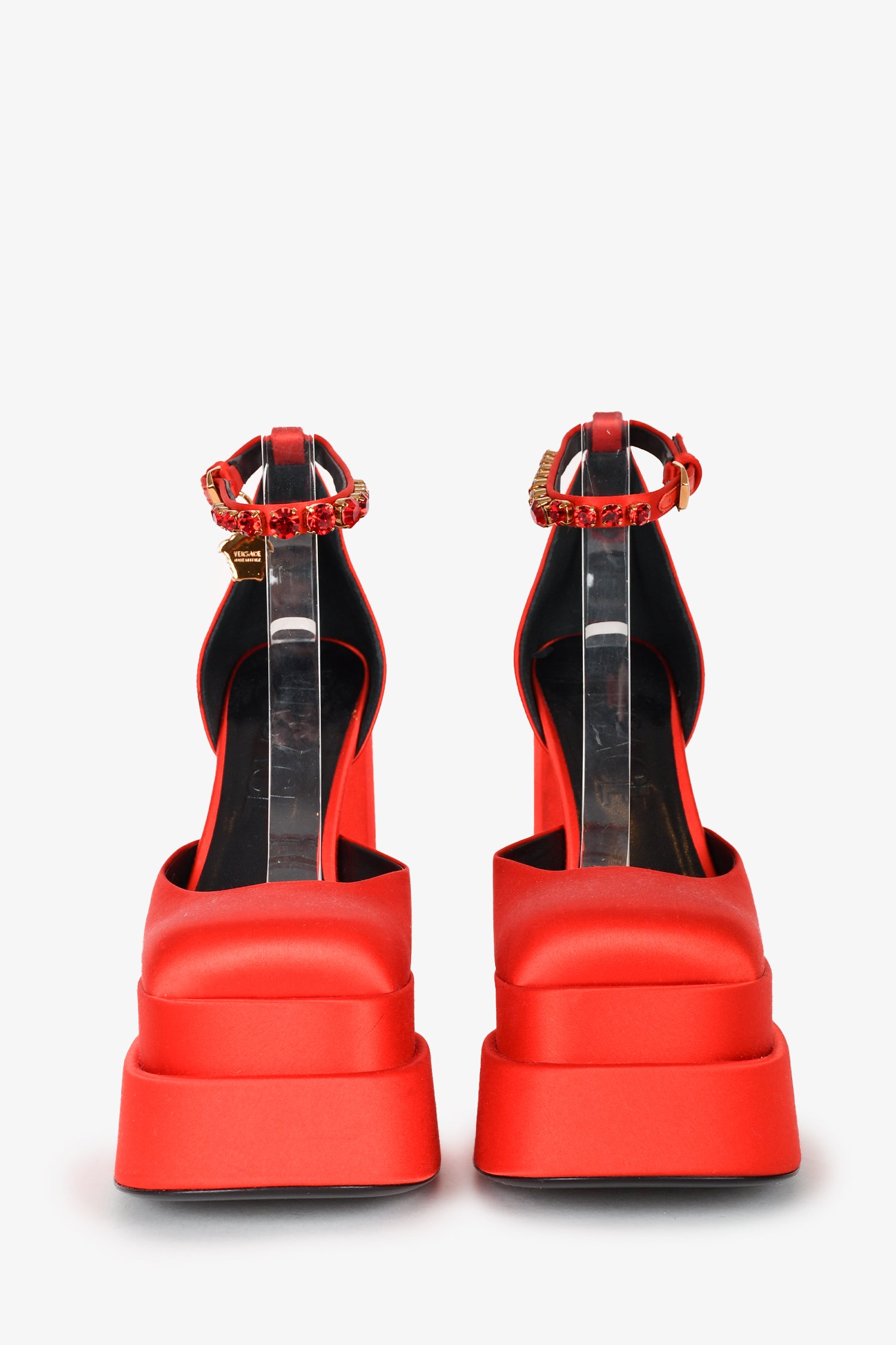 Refresh availabilityVersace Red Satin Crystal Embellished Platform Heels. Square toe. Ankle strap with buckle closure. Tonal stitching. Topy soles.
