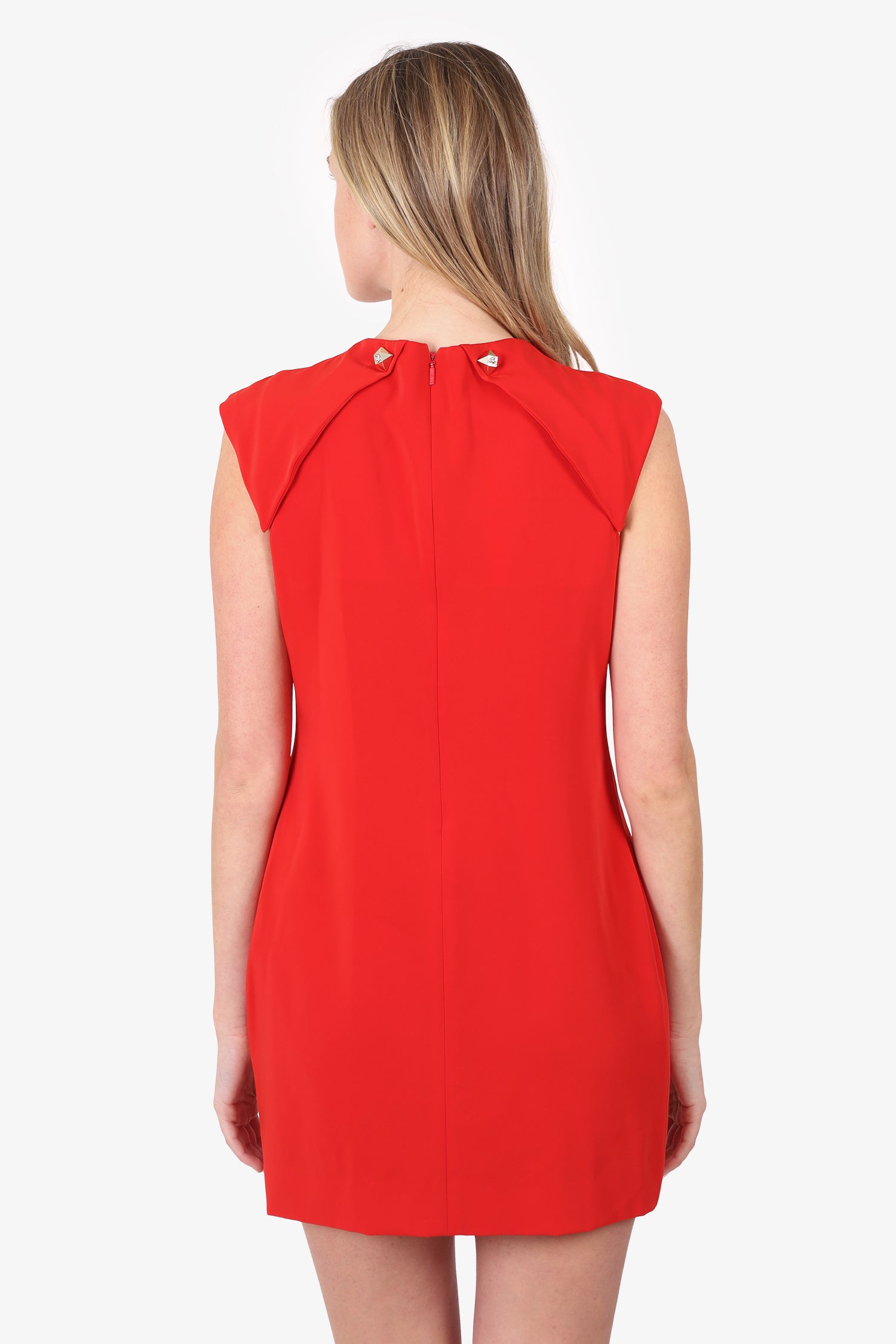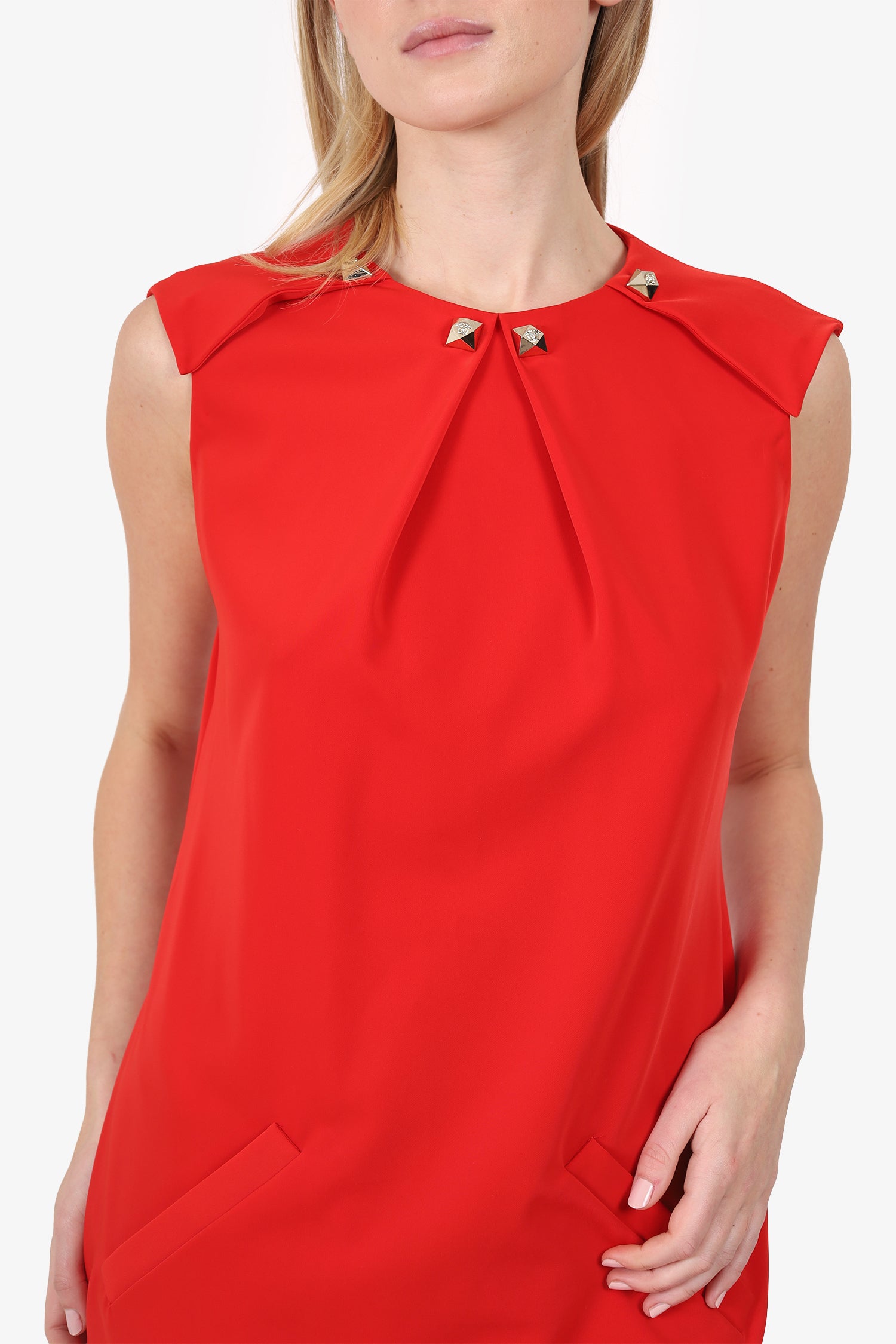 Refresh availabilityVersace Red Sleeveless Studded Box Pleated Mini Dress. Slip-on. Round neckline. Rear zip with hook-up closure. 2 exterior front slip pockets. Gold-tone hardware. Tonal stitching.