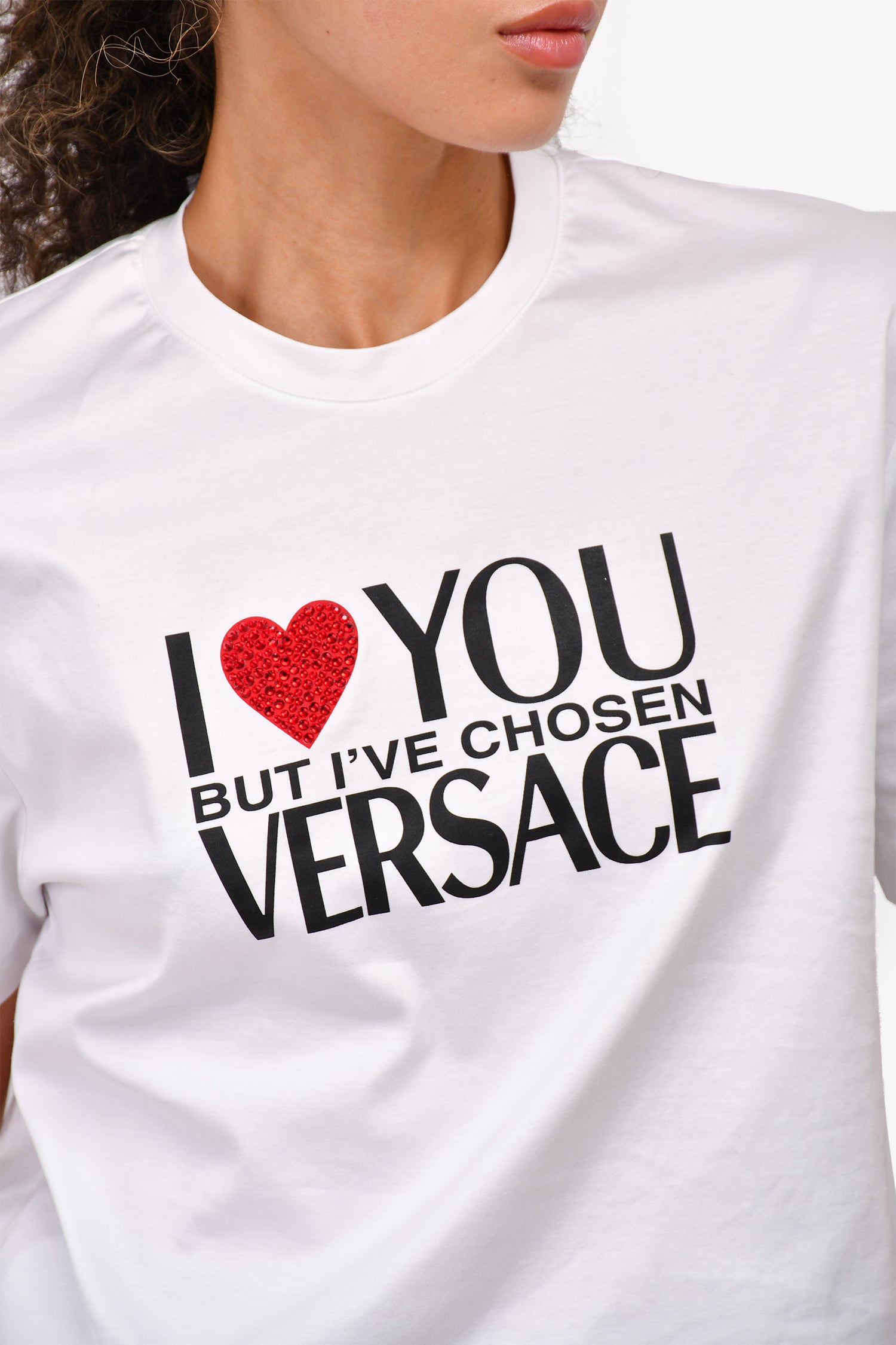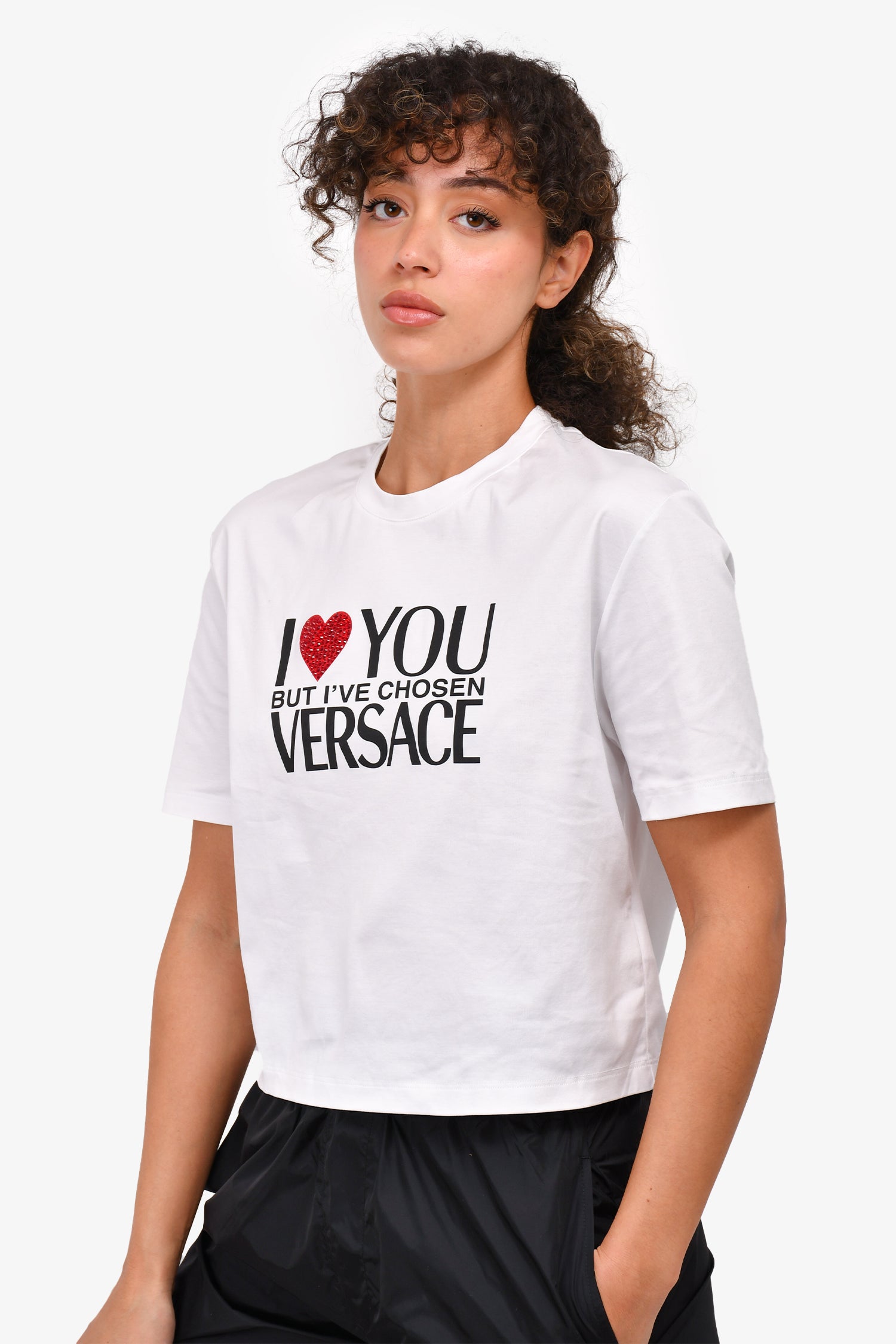 Refresh availabilityVersace White/Black Graphic "I Love You" Cropped T-Shirt.