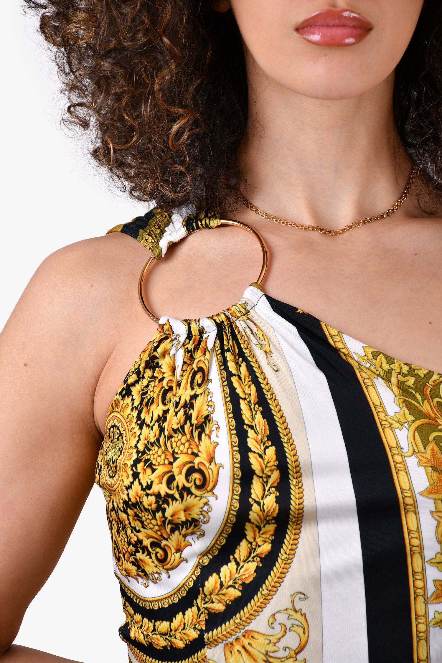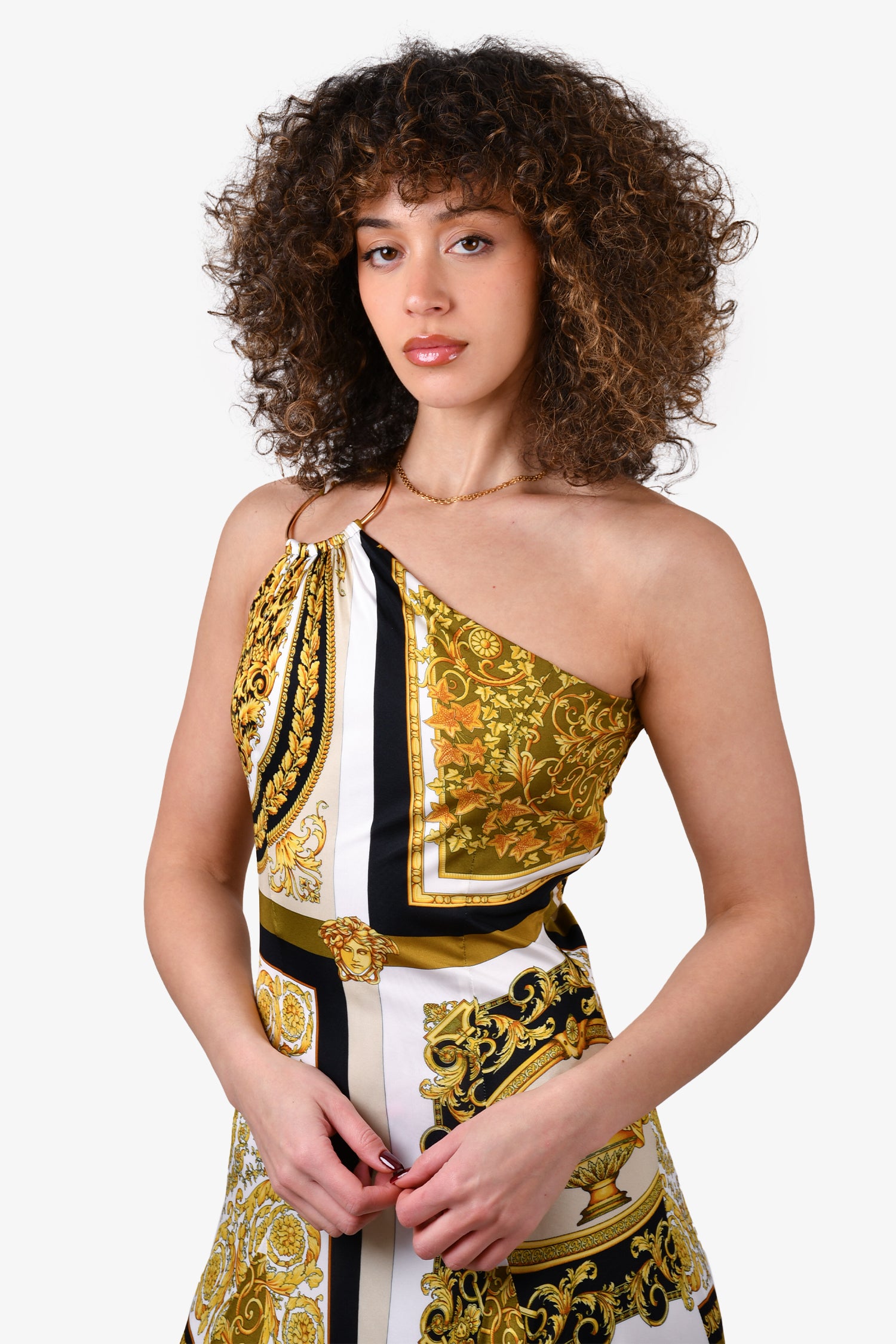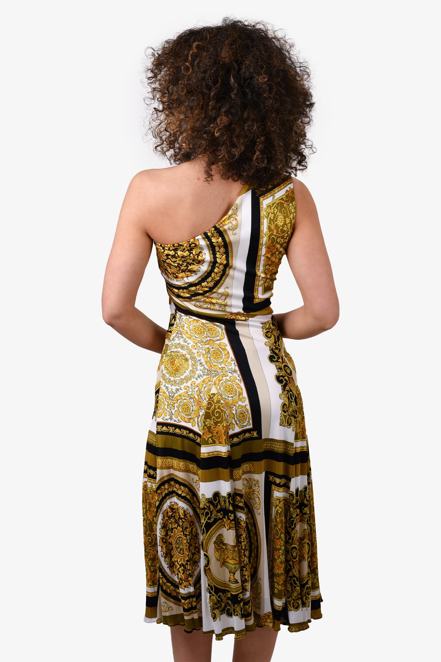Refresh availabilityVersace White/Gold Mosaic Print Cold Shoulder Dress. Side zip and hook closure. Lined. Tonal stitching.
